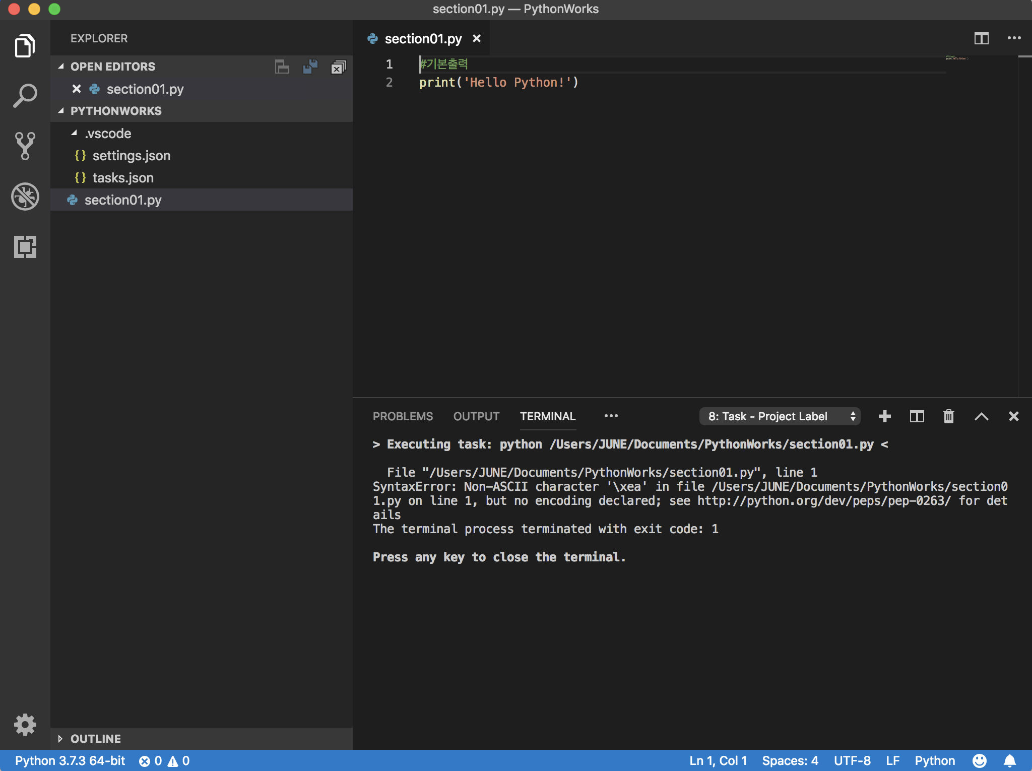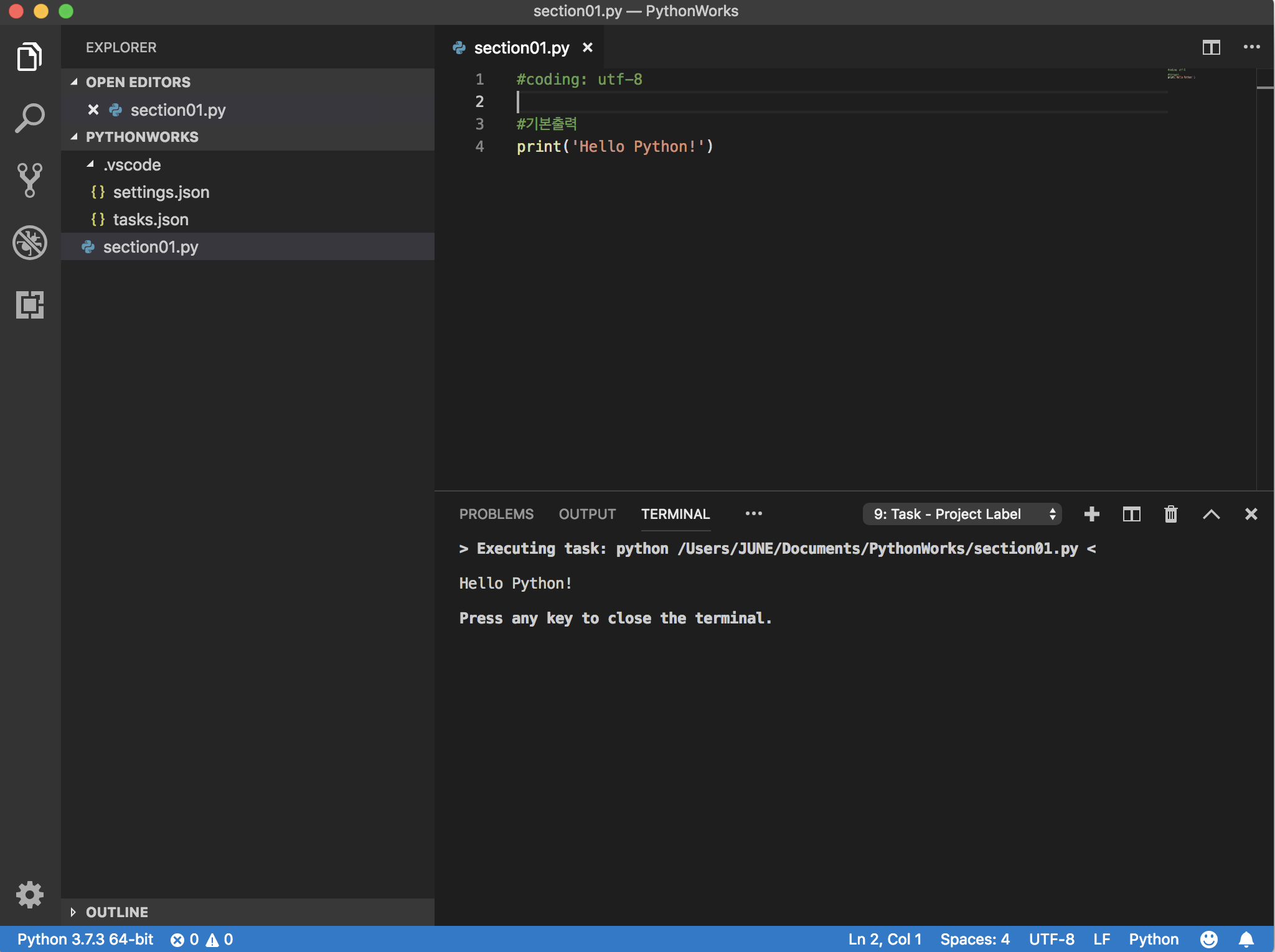 터미널에 Hello Python!이 제대로 찍힌다.