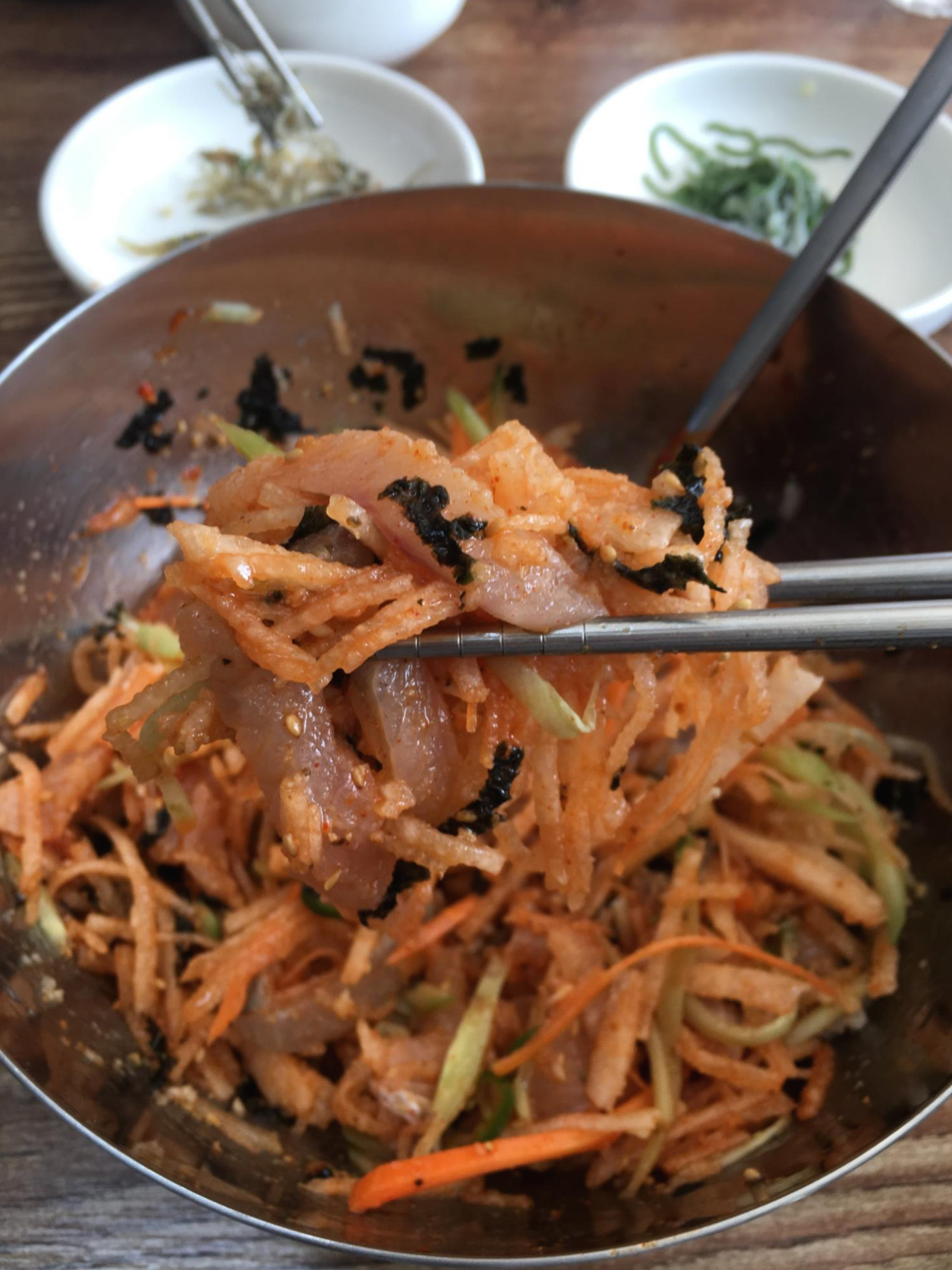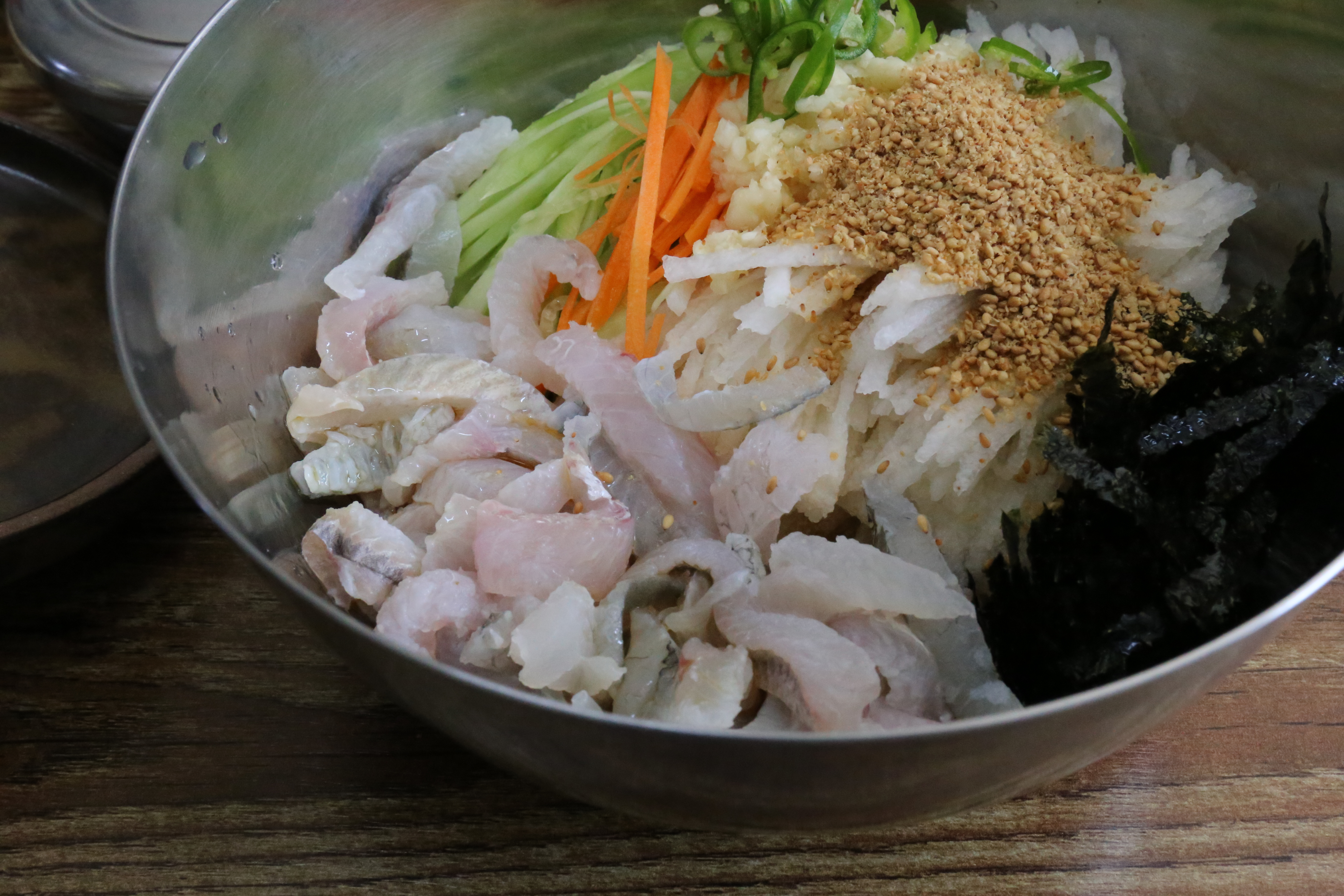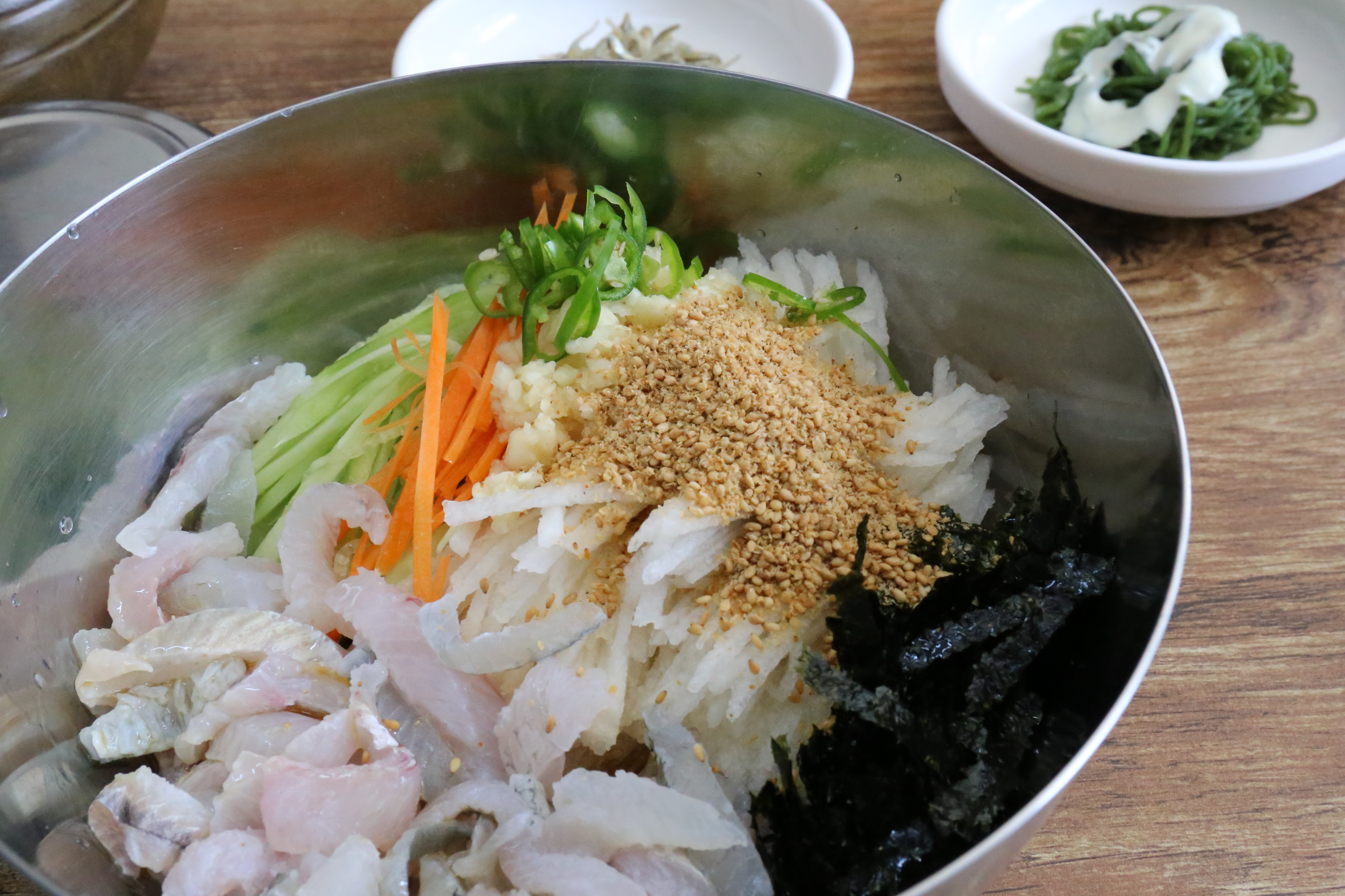 당일 공수한 횟감으로 만든 물회를 맛볼 수 있다. 오늘의 횟감은 빨간 성대와 봄을 알리는 도다리. 대접에 회를 큼직하게 썰어 한켠에 담고, 다른 한켠에는 가늘게 채썬 배와 당근, 오이, 고추, 김가루, 깨소금을 푸짐하게 담았다. 양념장을 두 숟가락 떠서 회 위에 올리고, 재료들일 잘 섞이도록 비벼준다. 먼저 회와 채소들을 곁들여 맛을 즐기고, 밥과 함께, 쌈채소와 함께 맛을 즐긴다. 물회지만 물이 없는 스타일로 싱싱한 회와 채소의 식감과 매콤달콤한 양념맛이 조화롭다.