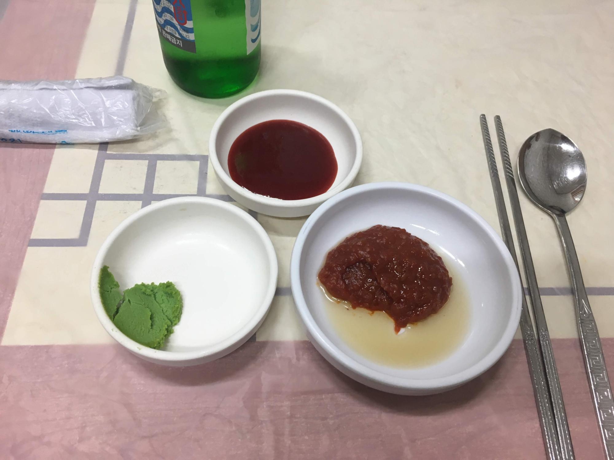 쌈장과 진한 가루와사비, 초장.