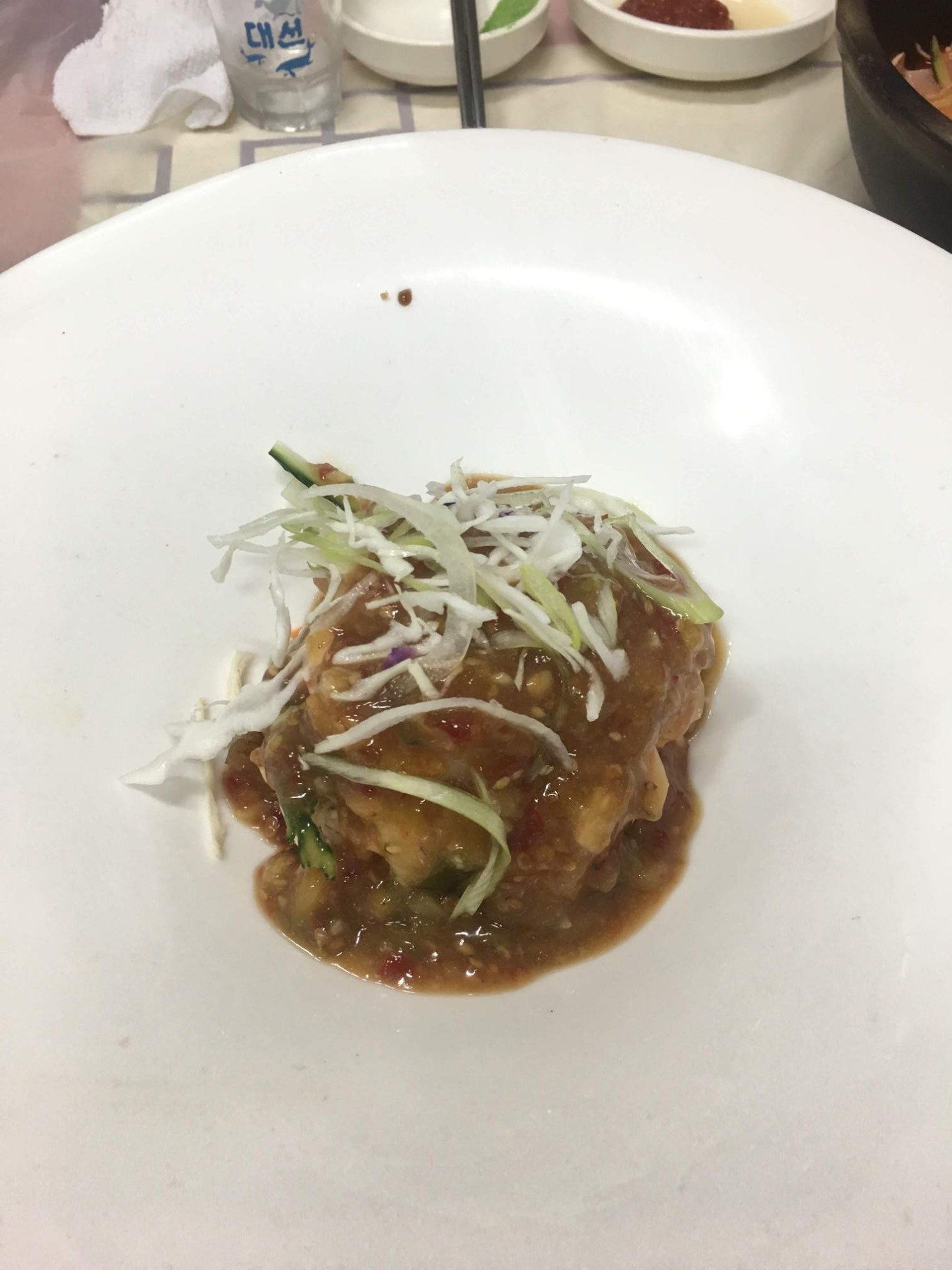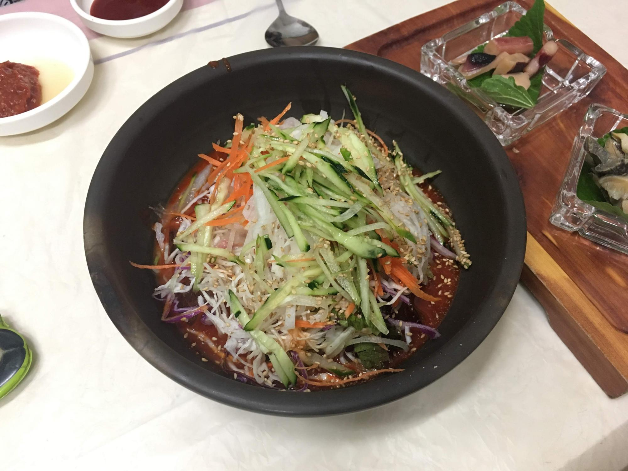 새우, 맛살, 해파리 냉체인데, 소스가 특이하다.