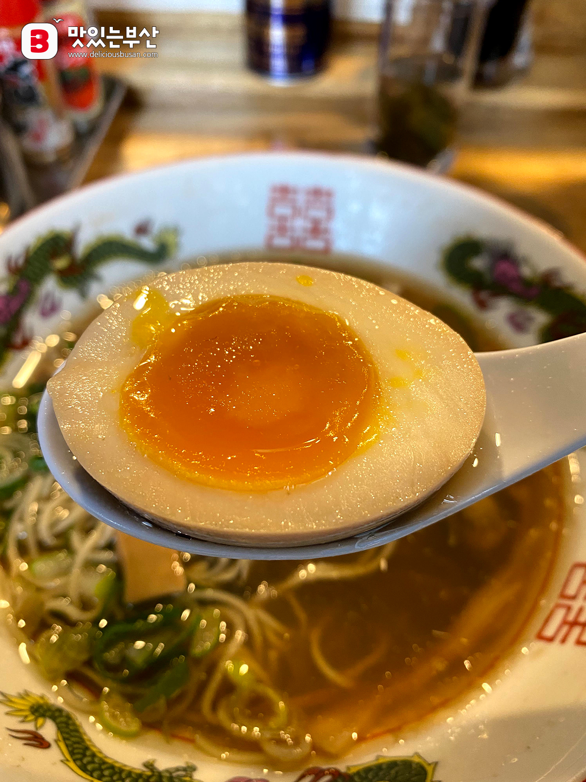 채썬 대파, 은은하게 간이 된 아지타마고 반쪽이 올라간다.