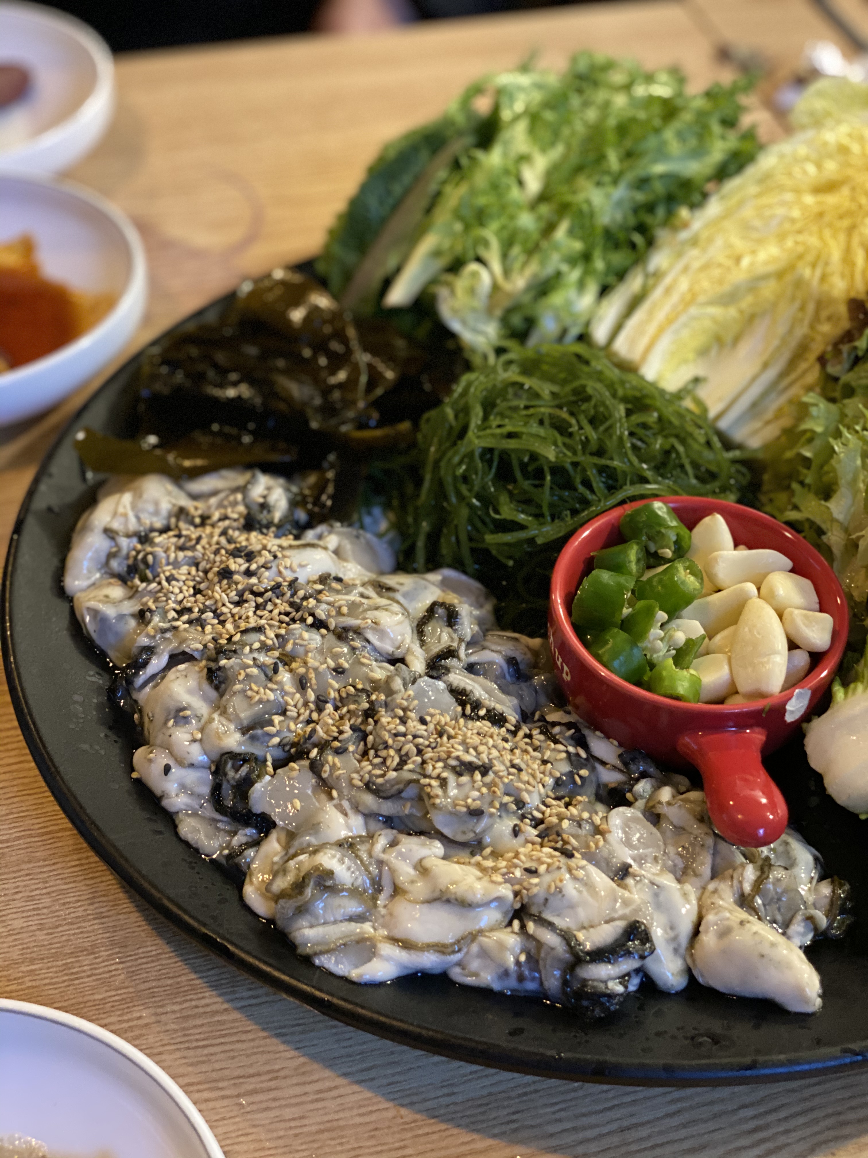 까만 접시 한켠에는 생굴을 담고