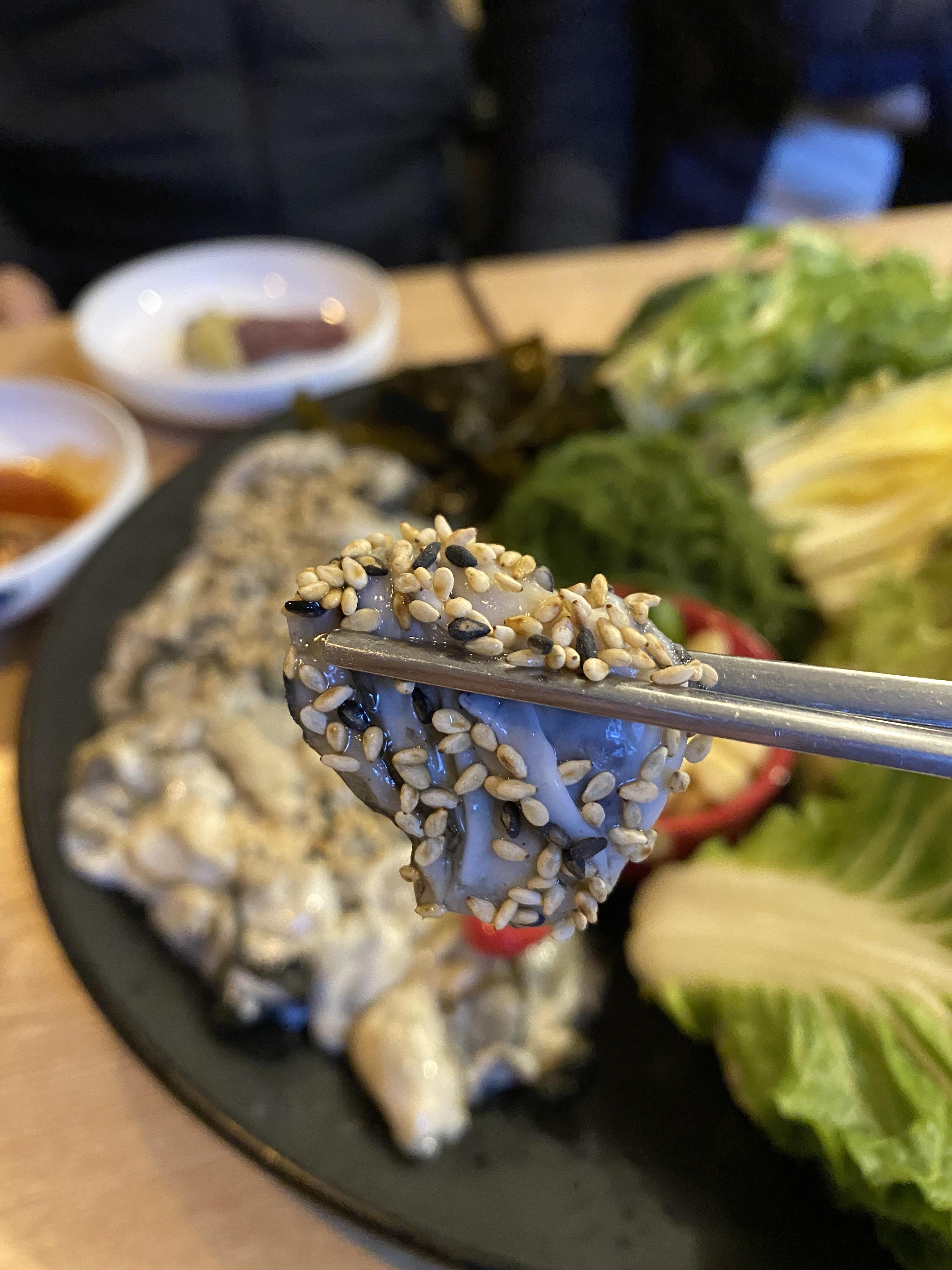 깨가 많이 묻어있는 생굴을 한점 집었다.