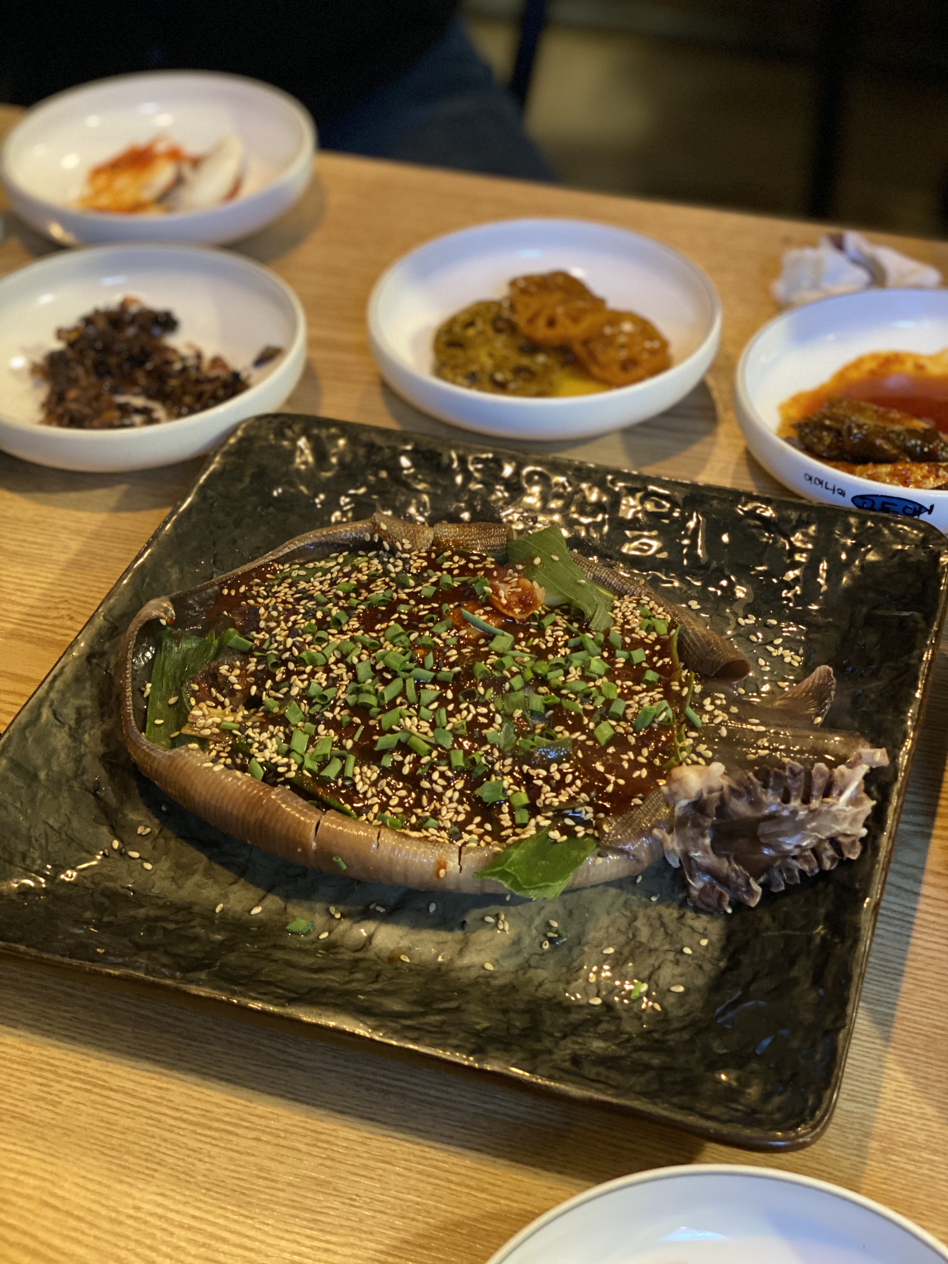 우리는 가오리찜 하나, 생굴 하나, 갑오징어 둘, 육전 하나를 주문했다.