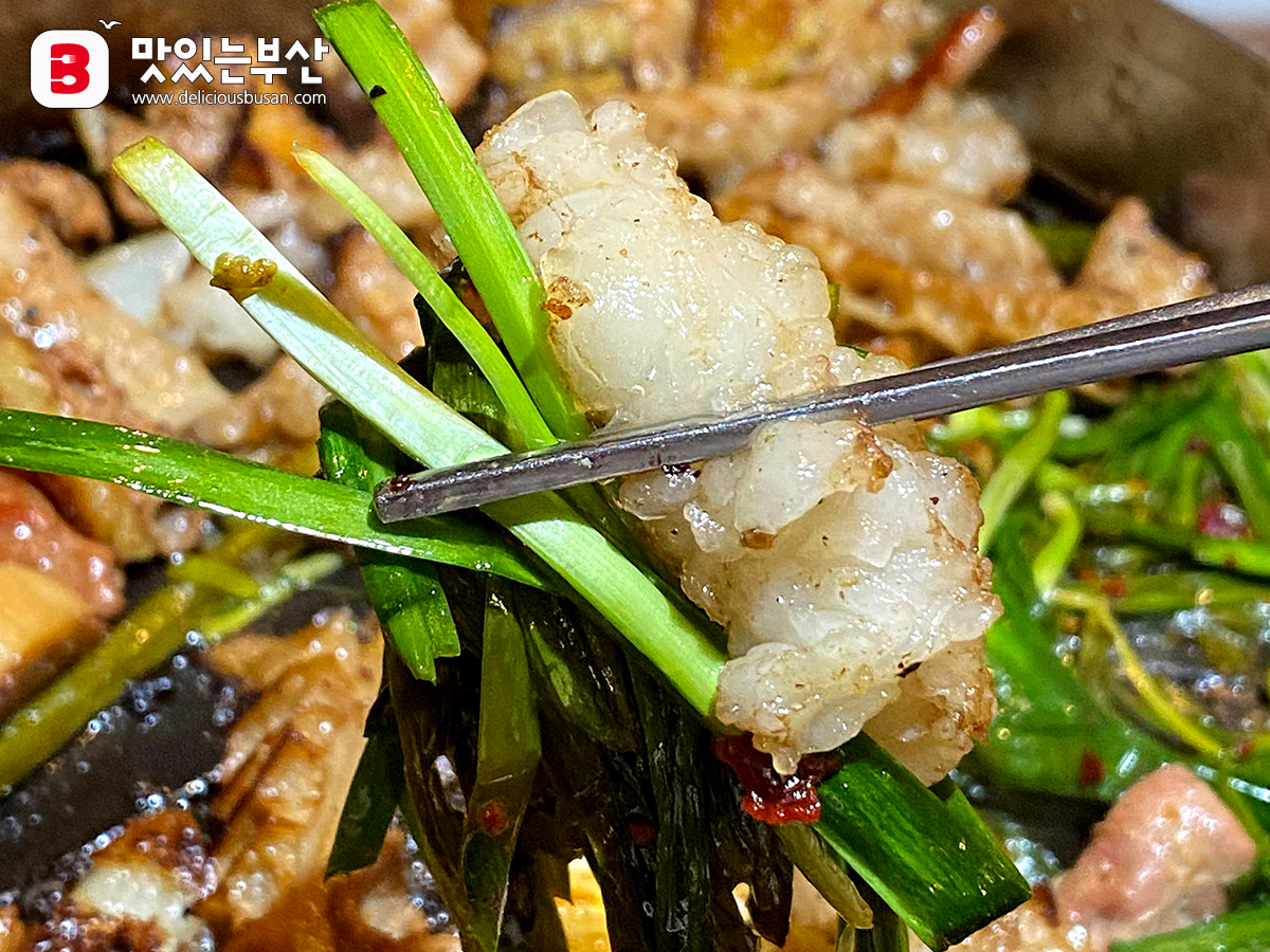 다음은 구워진 부추를 곁들여서.