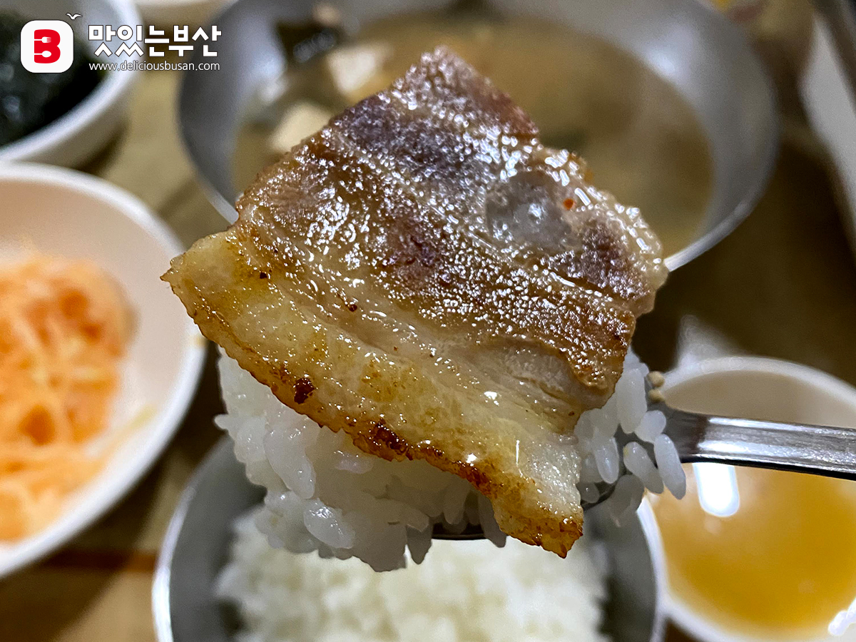 밥 한 숟갈 떠서 그 위에 노릇하게 구워진 삼겹살 한 점 올려서 맛보기.