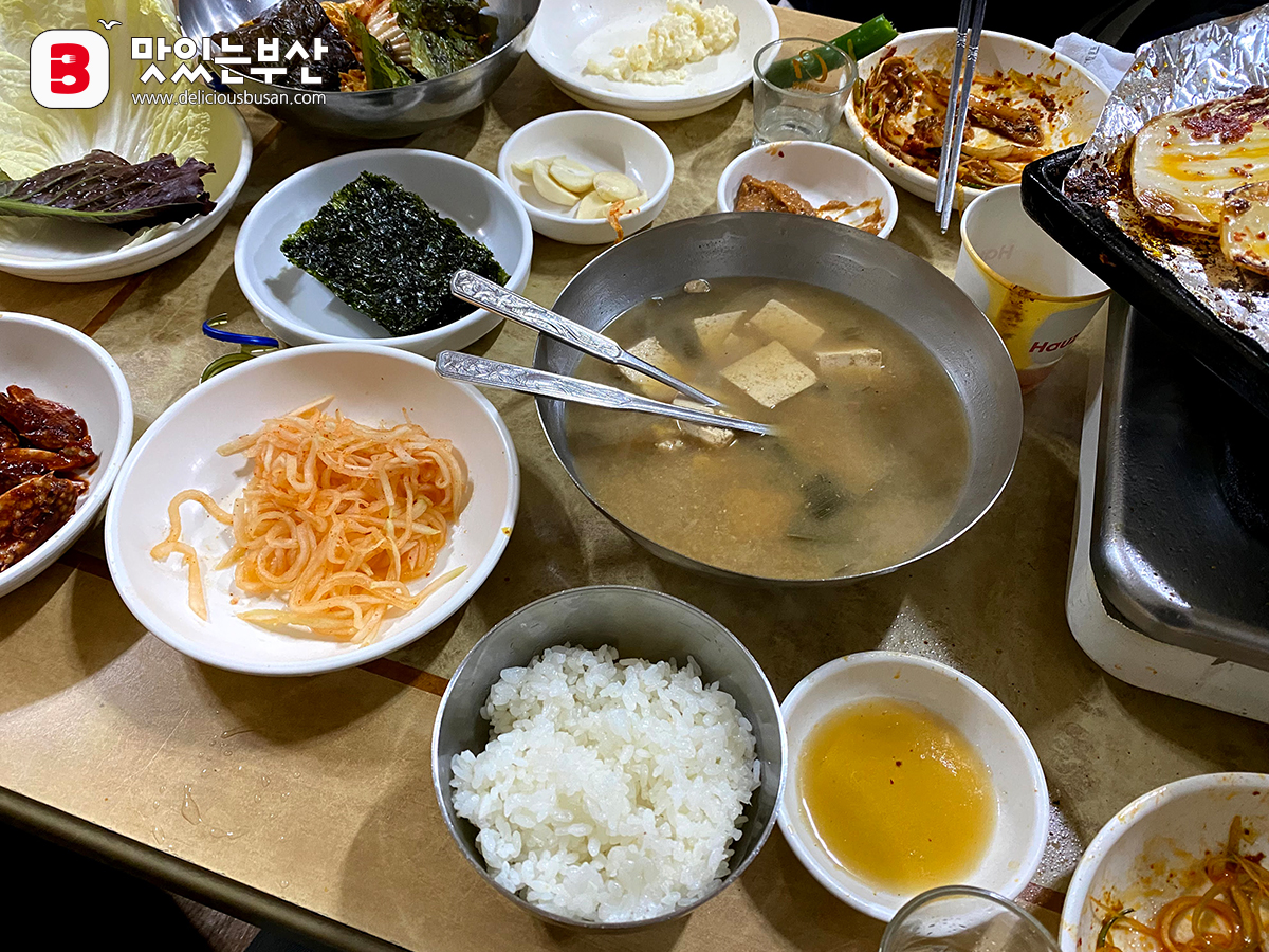곁들임으로는 구워먹기 좋은 신김치와 겉절이, 무생채, 감자샐러드, 양념게장, 쌈채소가 나온다.
