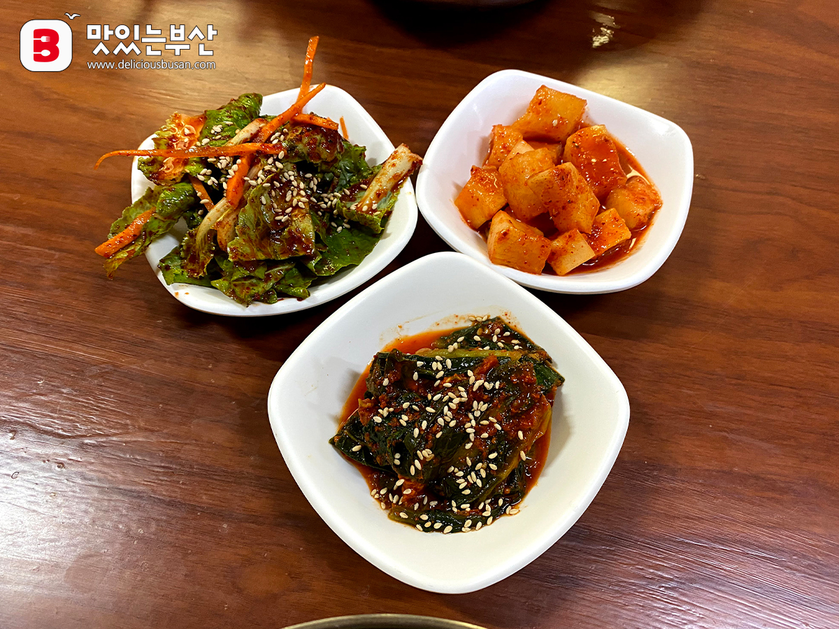 겉절이 배추와 깍두기, 갓김치를 내어준다.
