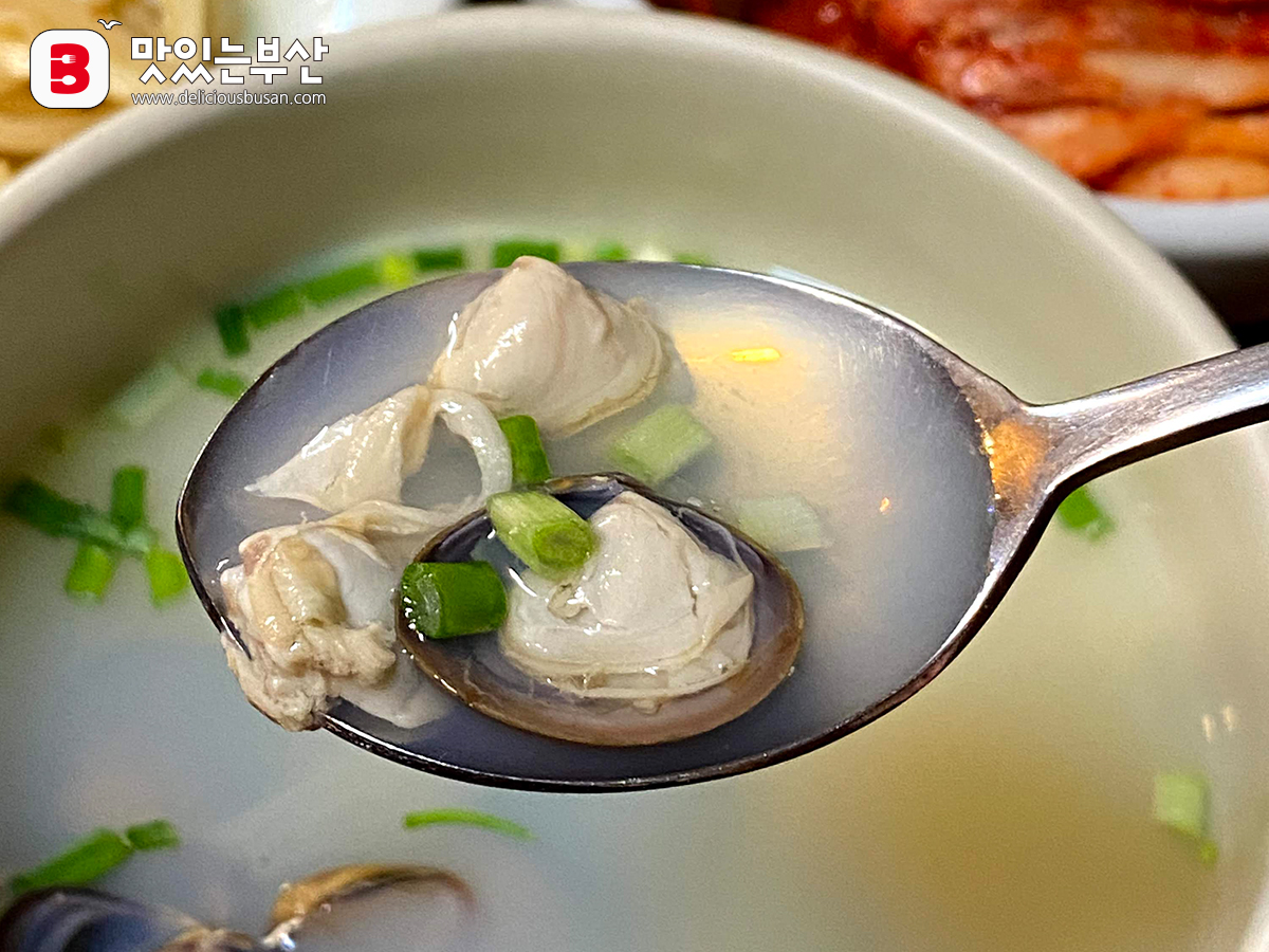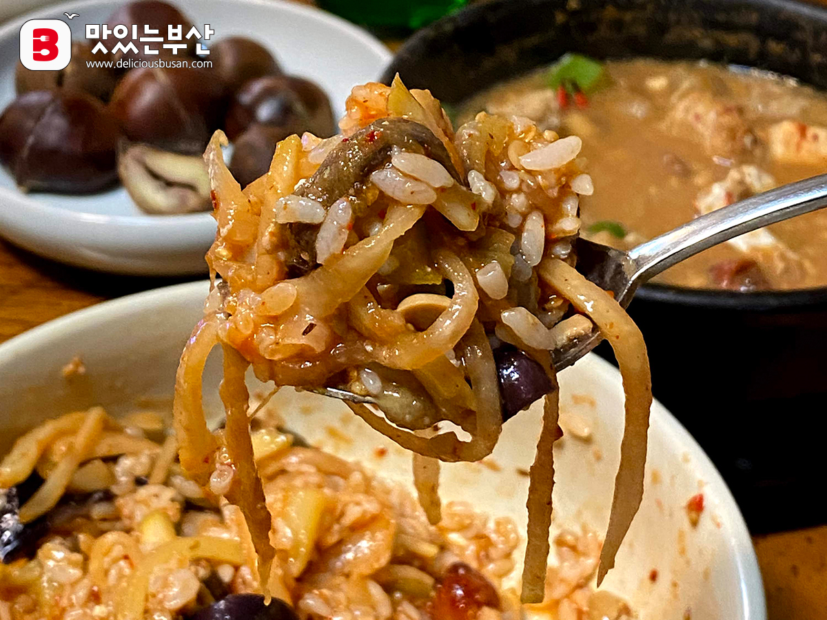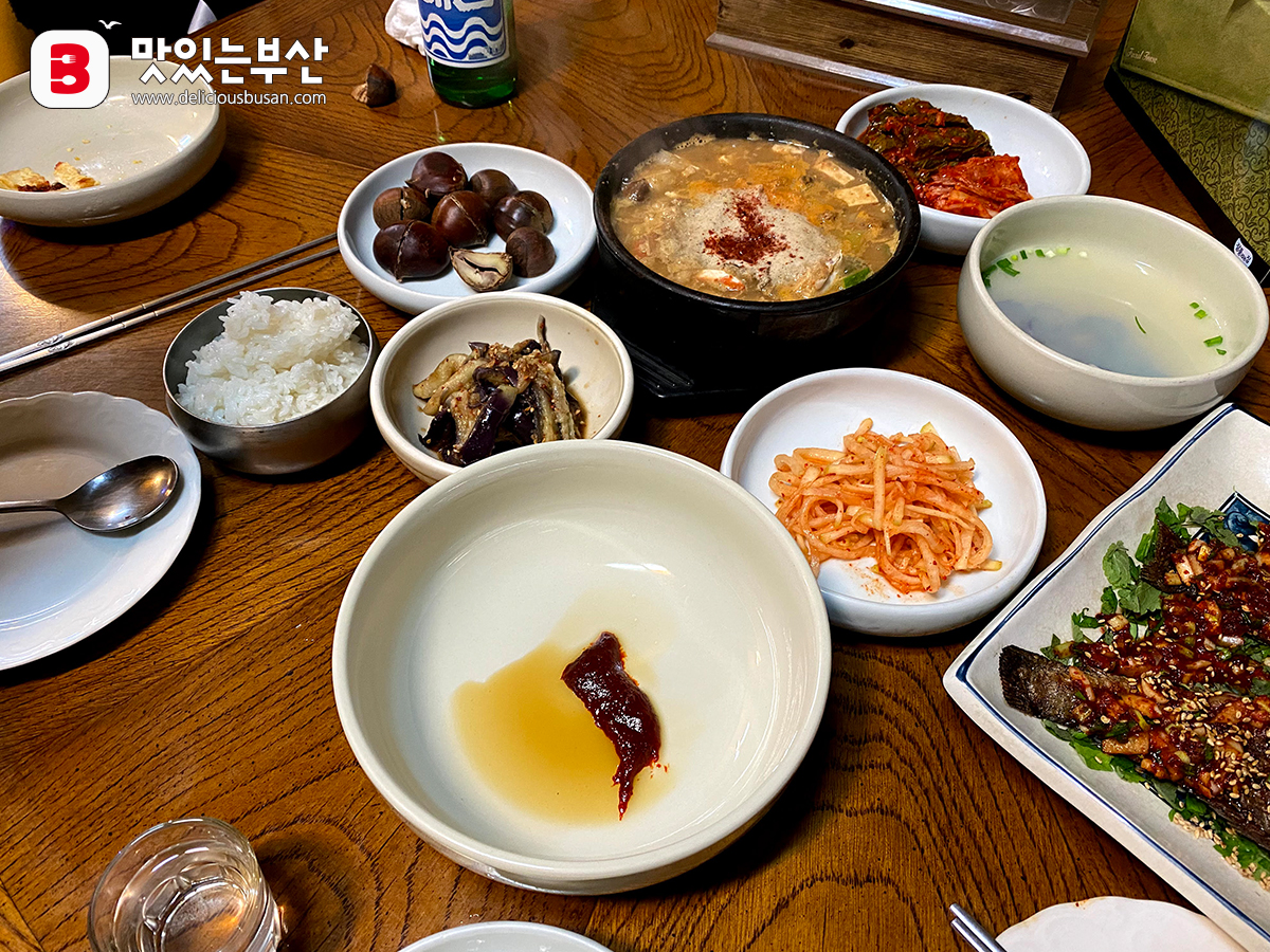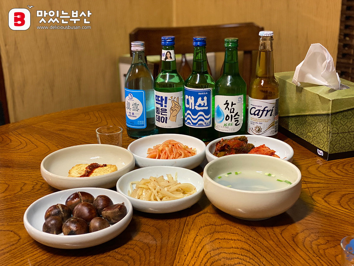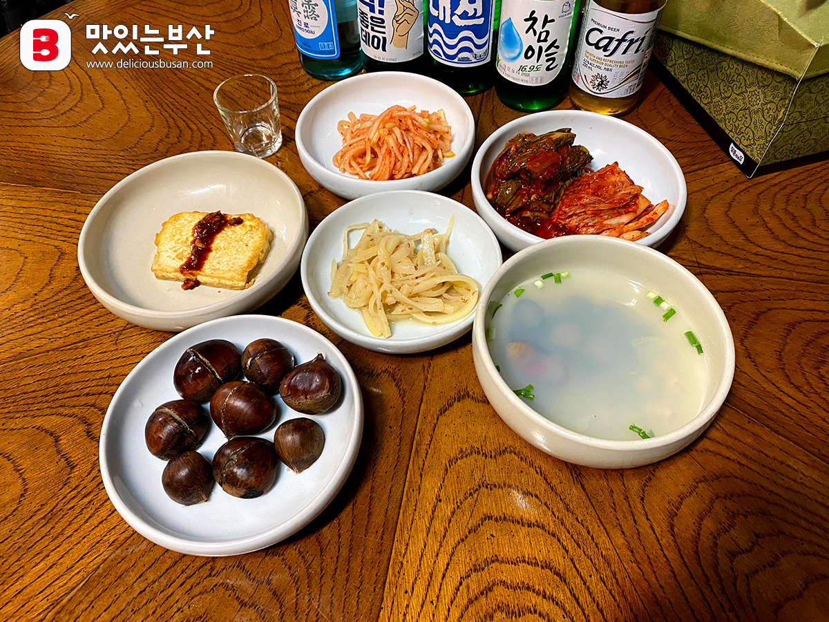 곁들임 메뉴는 삶은 밤, 도라지무침, 무생채, 김치, 갓김치, 두부부침, 재첩국.