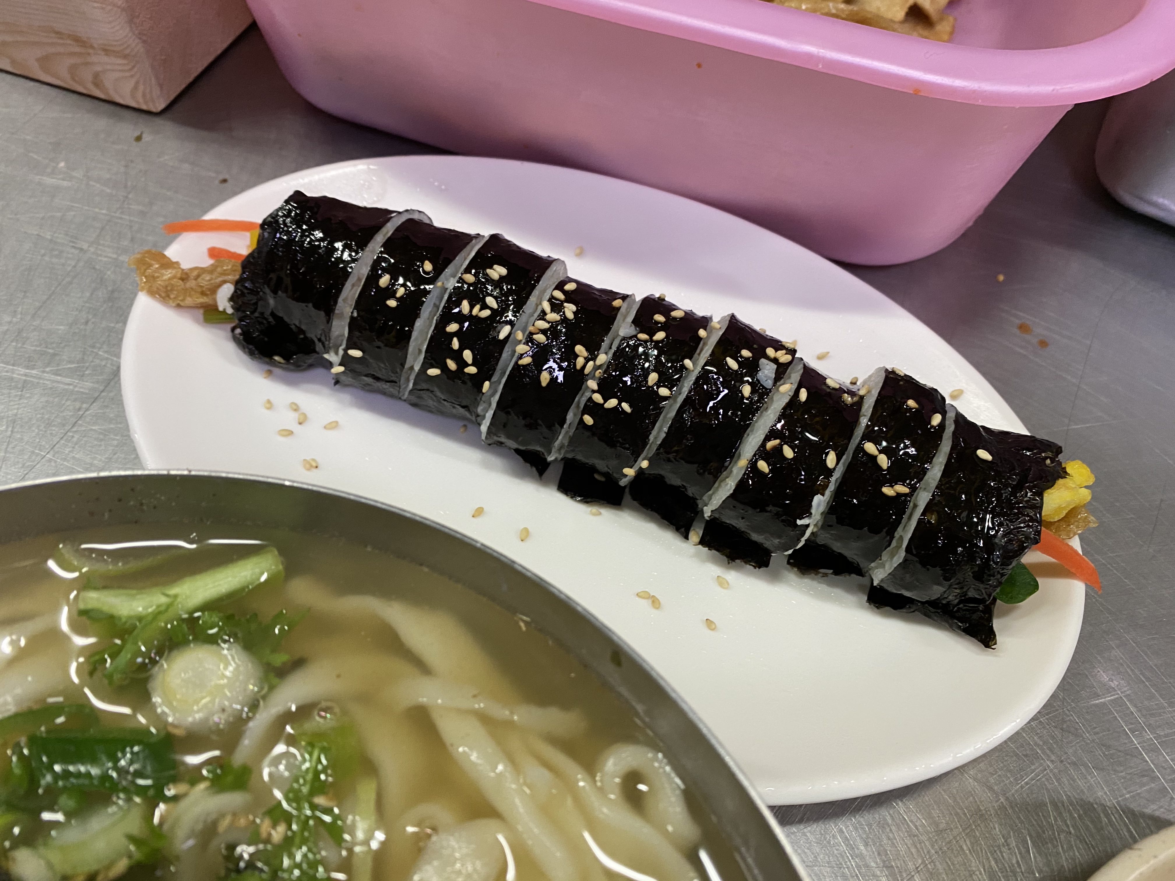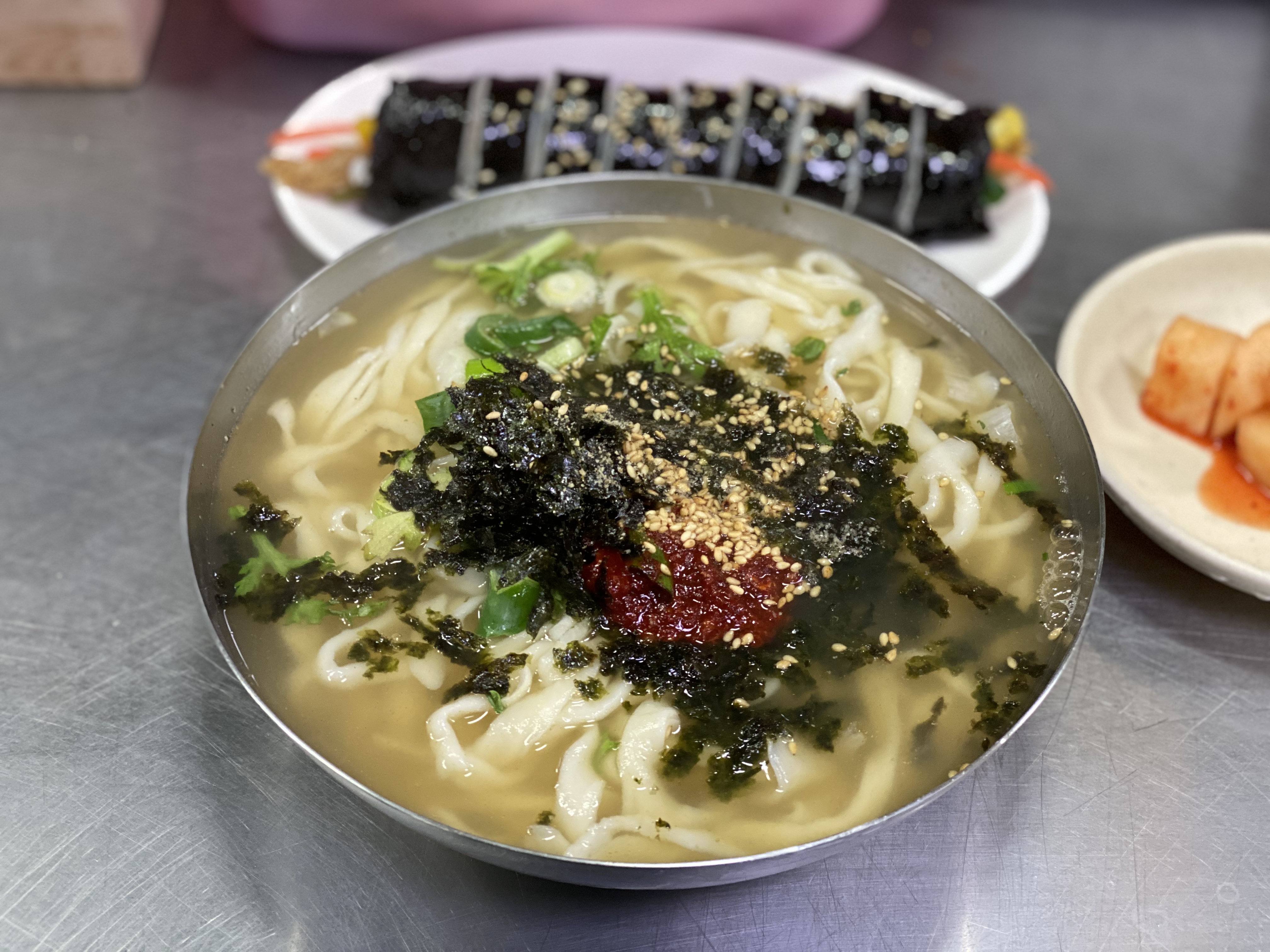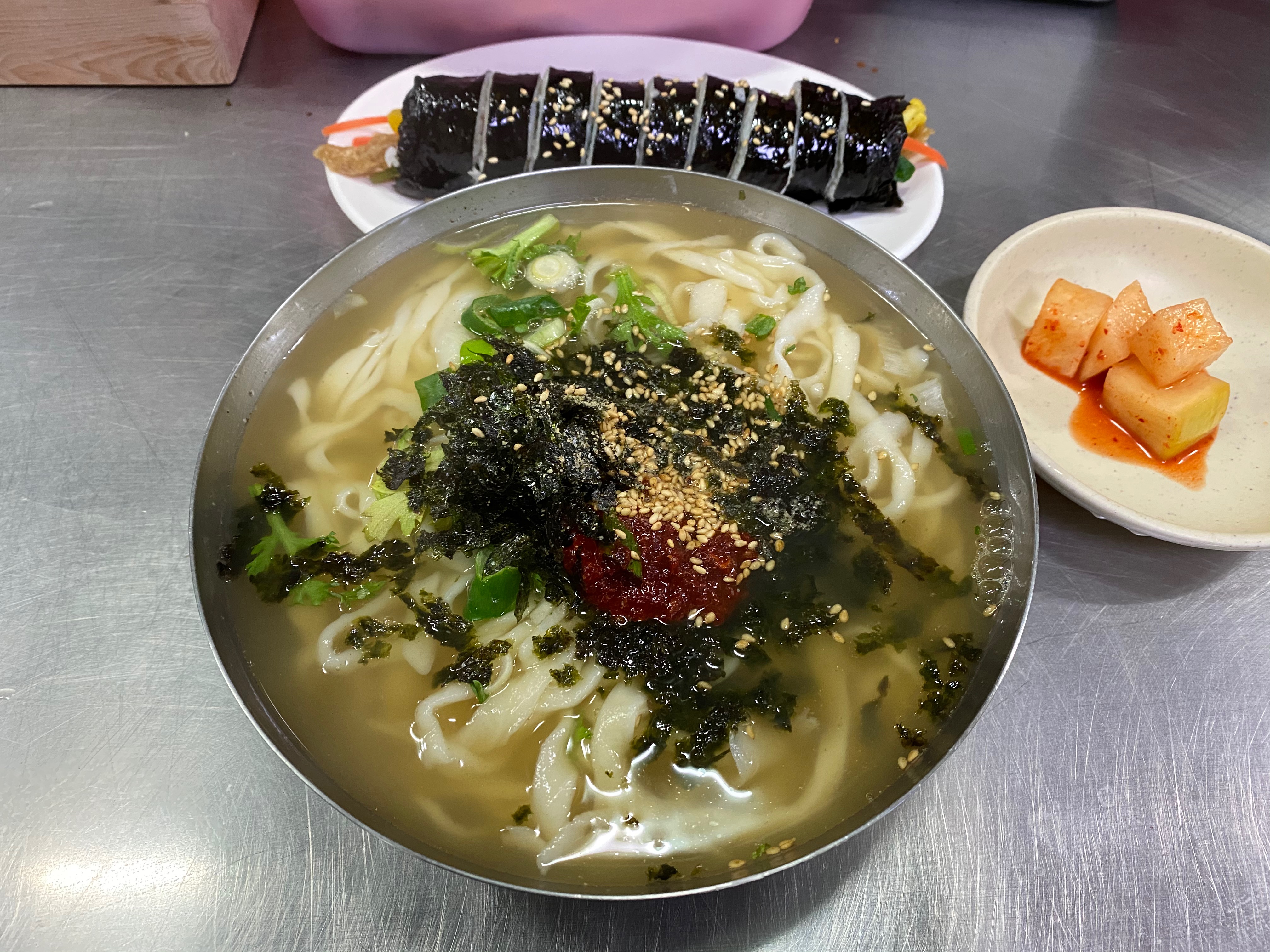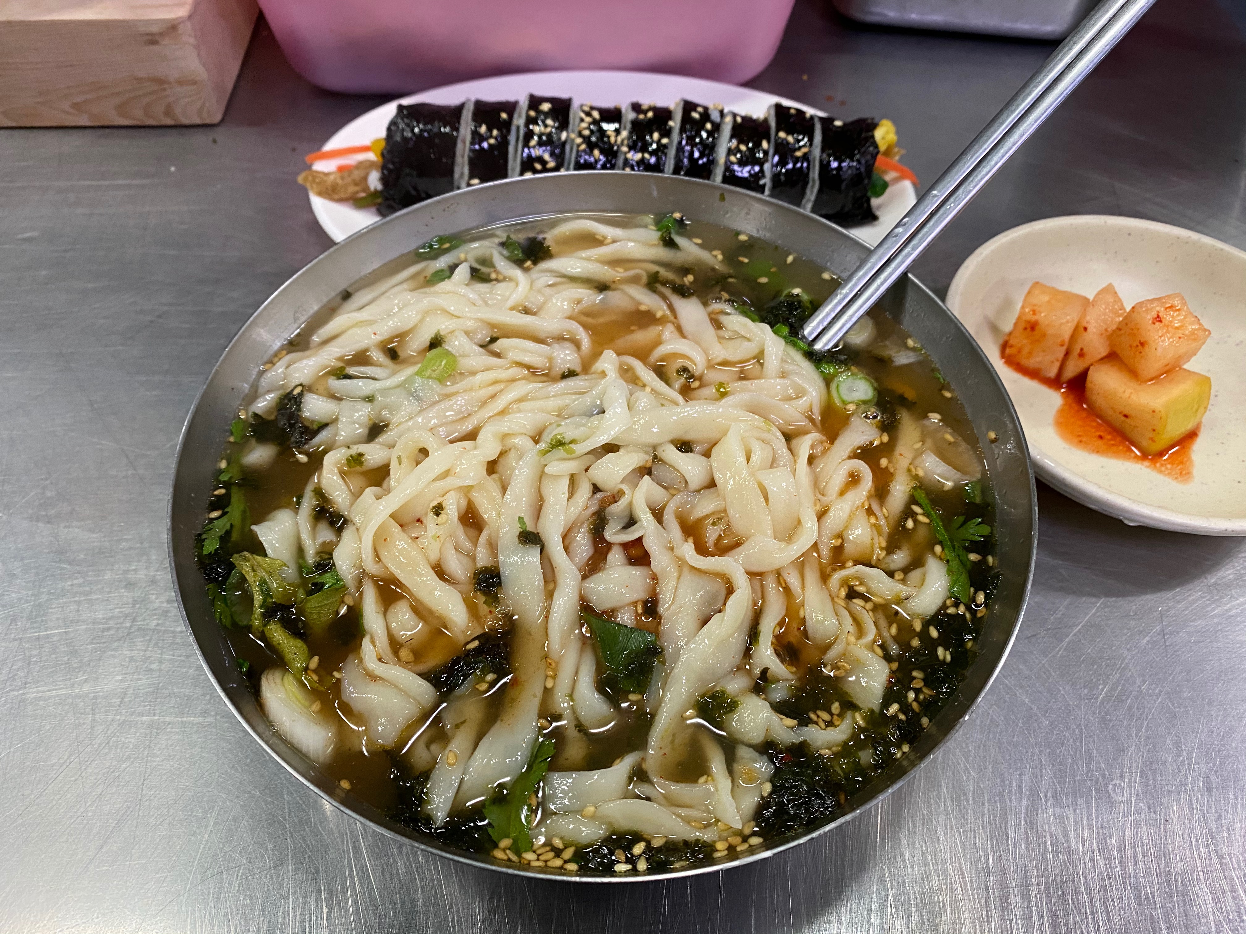 조금 기다리면 푸짐한 칼국수 한 그릇과 김밥 한 줄이 내 앞에 놓인다.