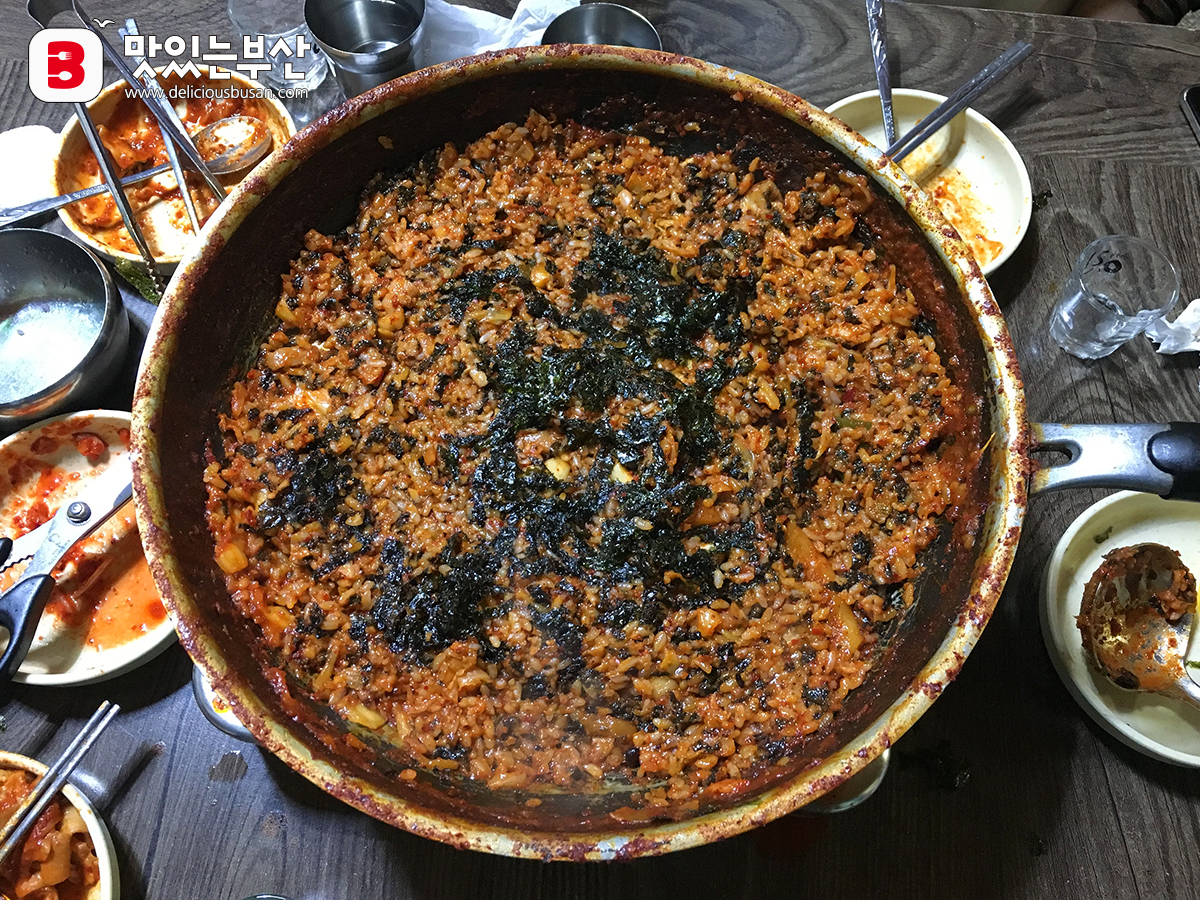남은 양념으로 밥을 볶고 참기름을 두른 후 김가루를 뿌려줬다.
