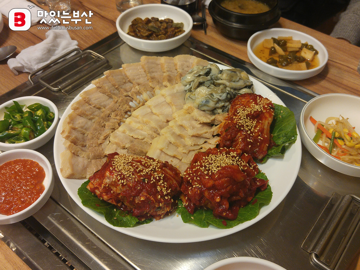 수육이랑 김치랑 생굴이랑.