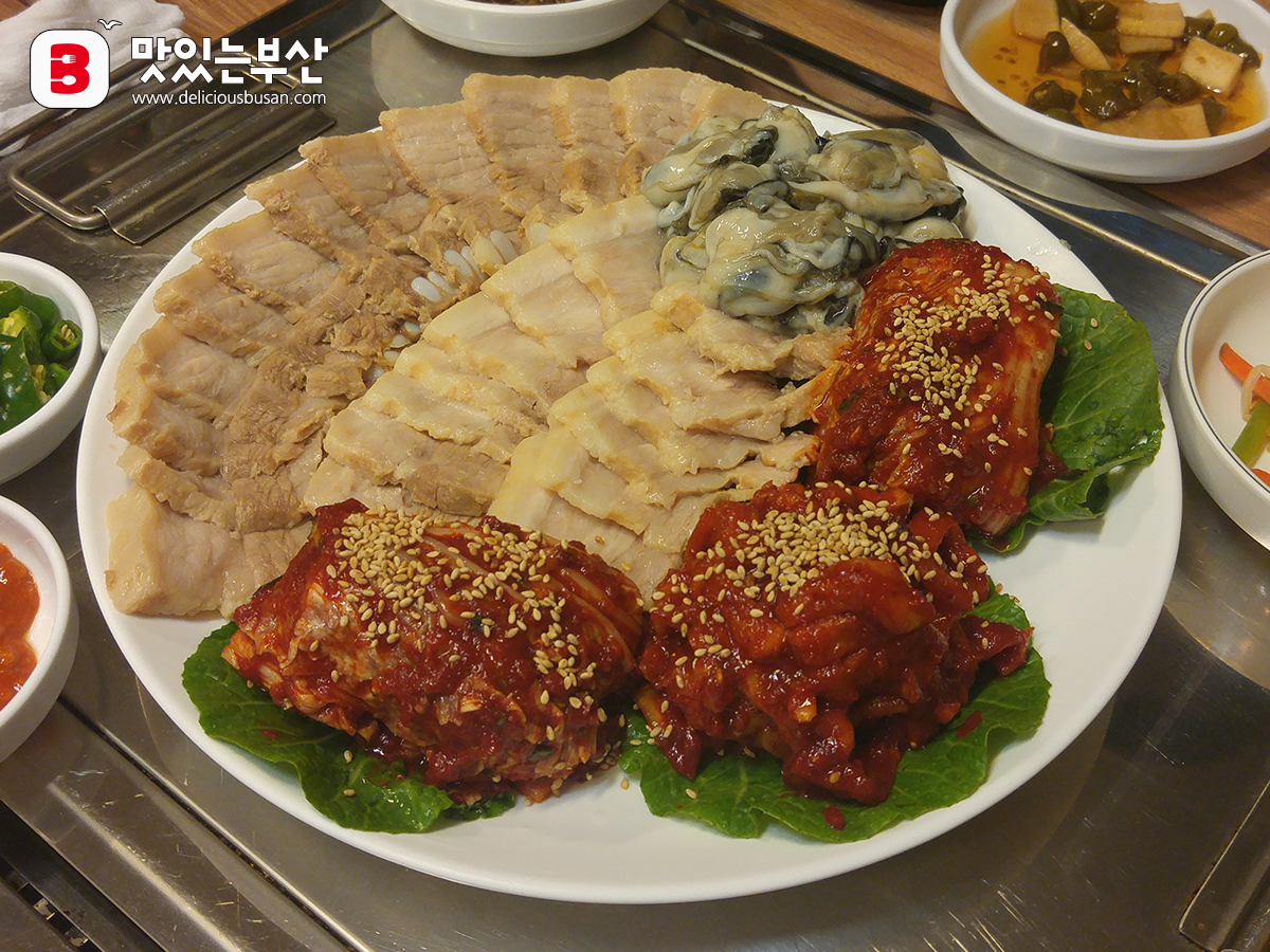 수육이랑 김치랑 생굴이랑.