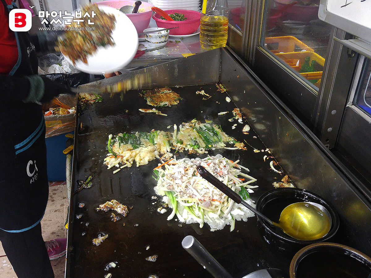 가게 입구에서는 철판에 파전과 빈대떡을 바쁘게 굽고 있다.