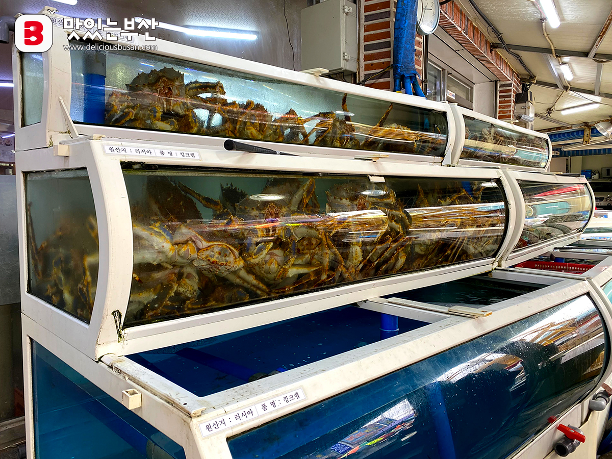 기장시장은 싱싱하고 값싼 해산물을 구매할 수도 있지만, 대게나 킹크랩을 전문으로 하는 집들이 많기로 유명하다.