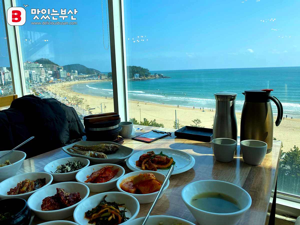 창가에서 송정해수욕장과 푸른 하늘을 바라보며 점심을 먹고 싶었지만,