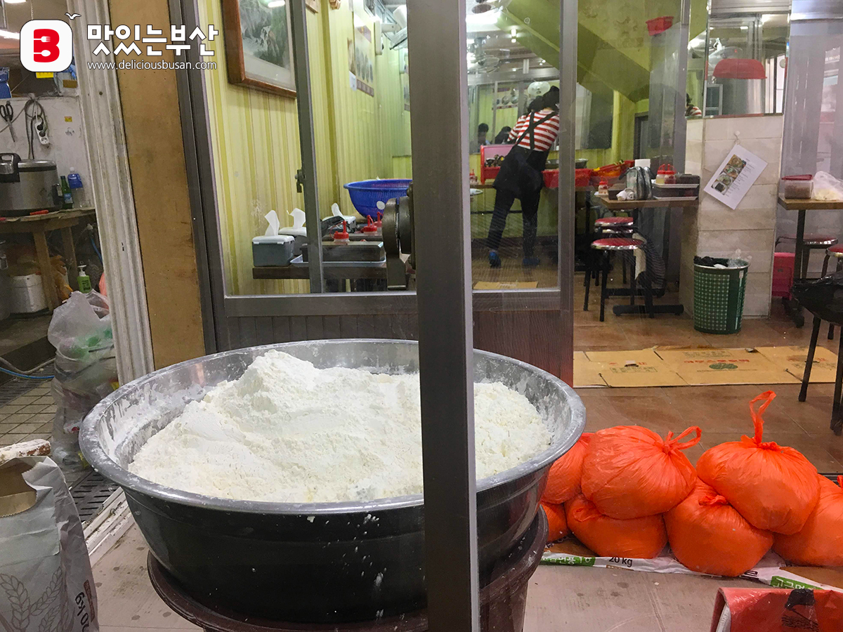 기장손칼국수의 측면 출입구에는 하얀 밀가루가 보인다.