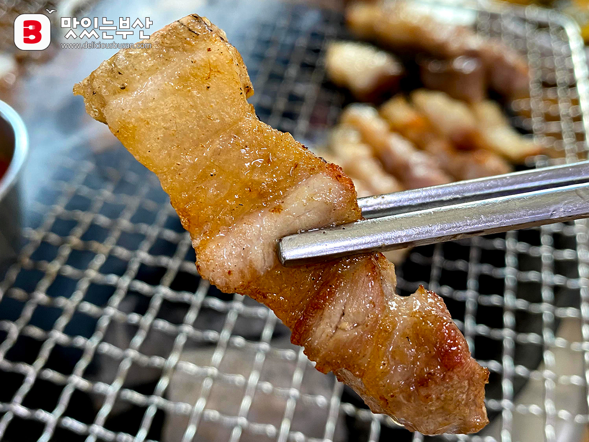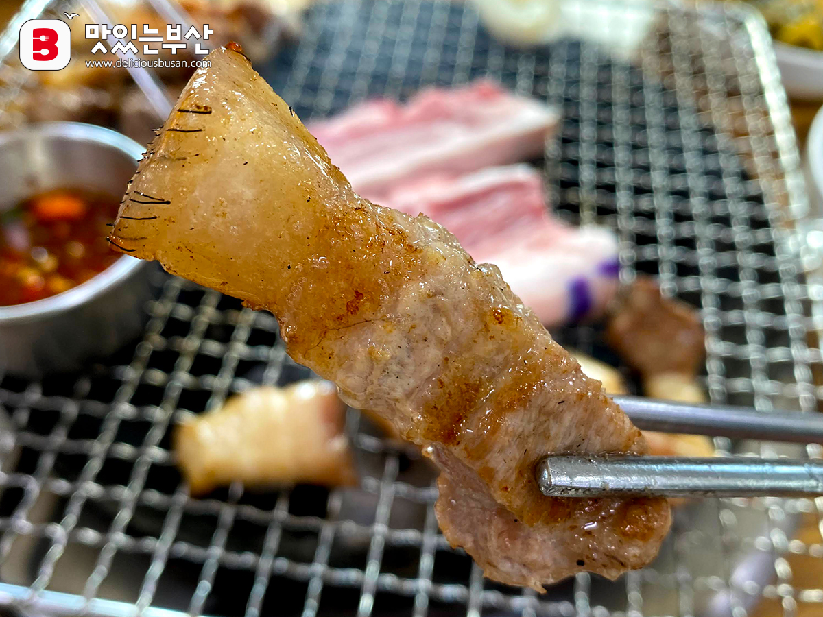 쫄깃한 껍데기가 붙어 있는 오겹살.