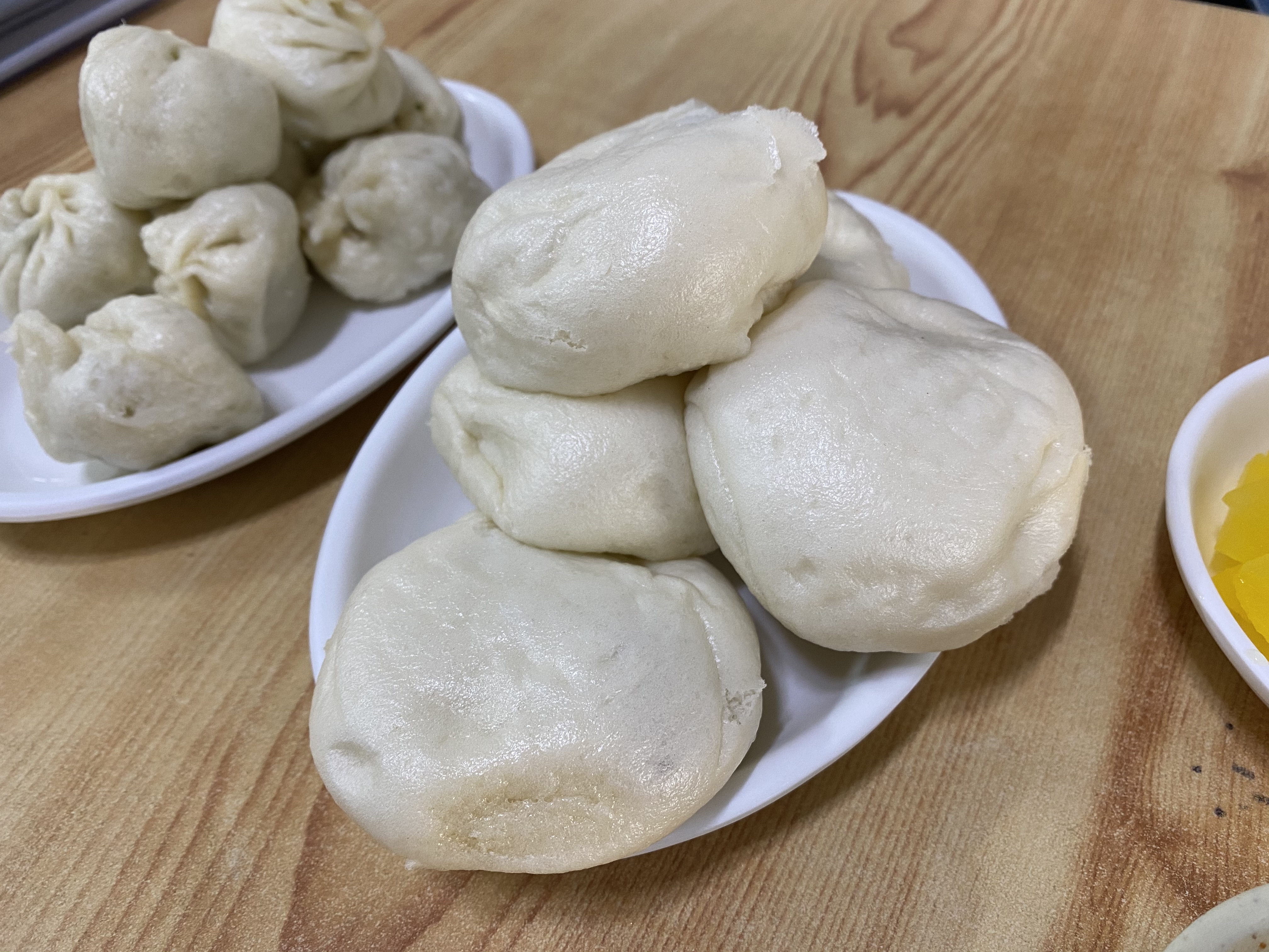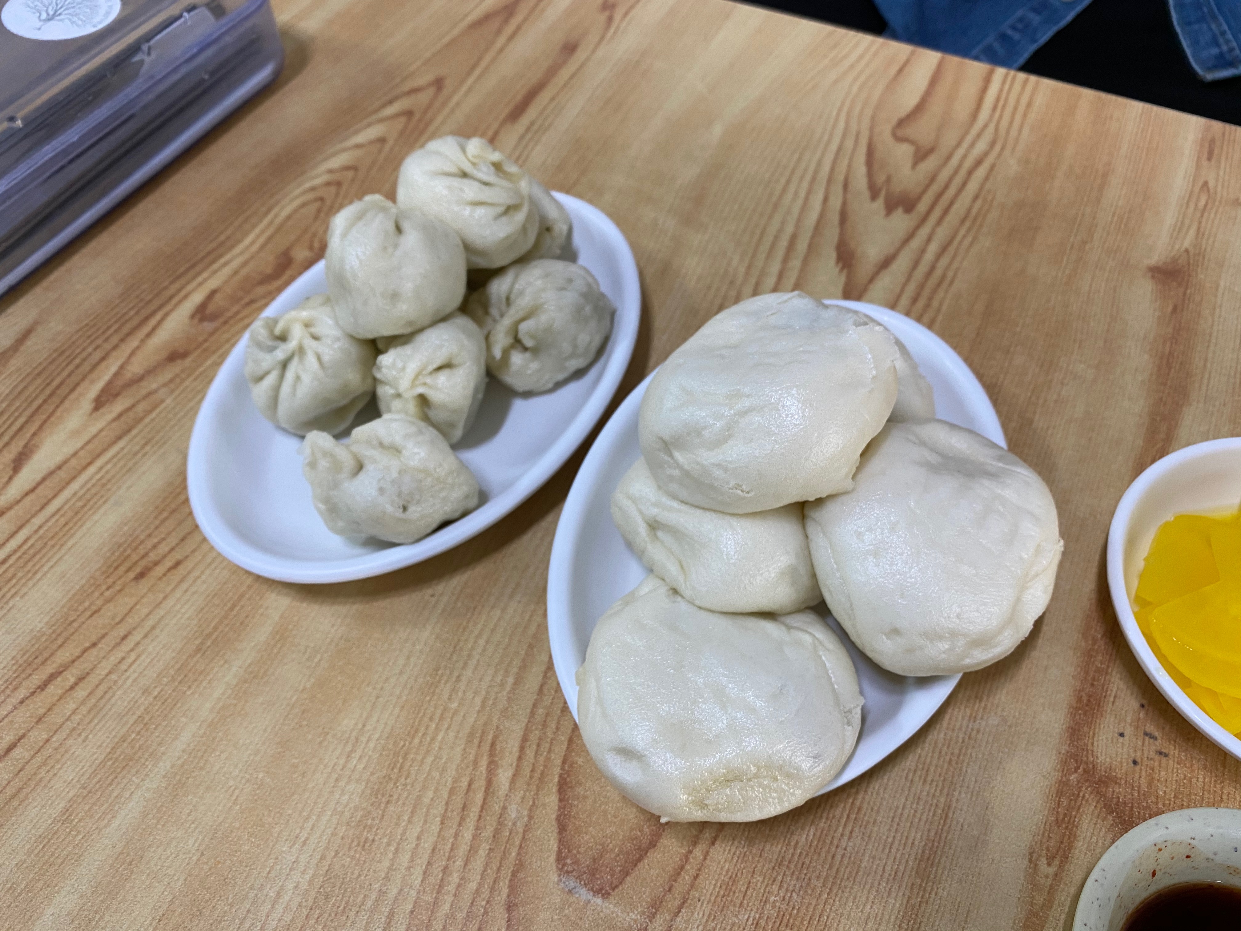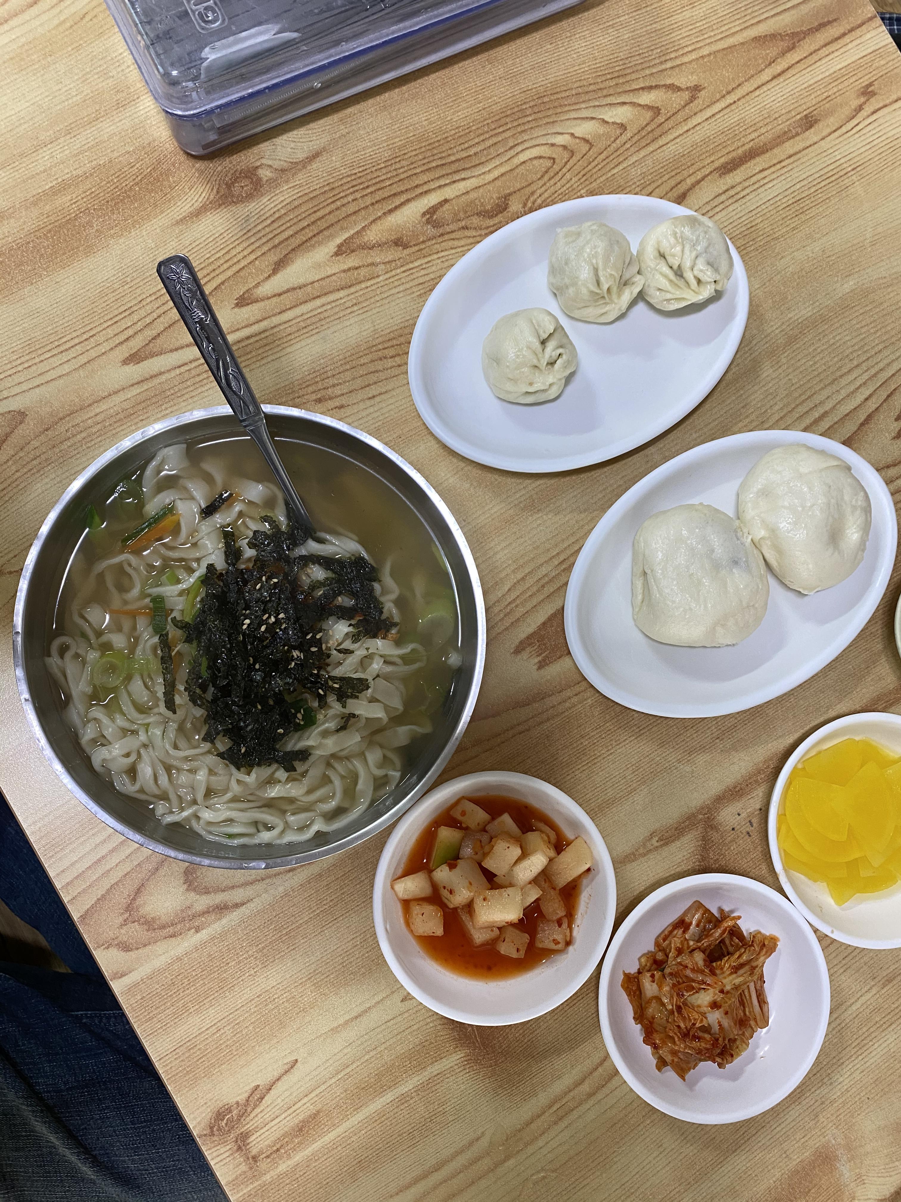 폭신한 고기만두와 찐빵 그리고 칼국수 한 그릇.