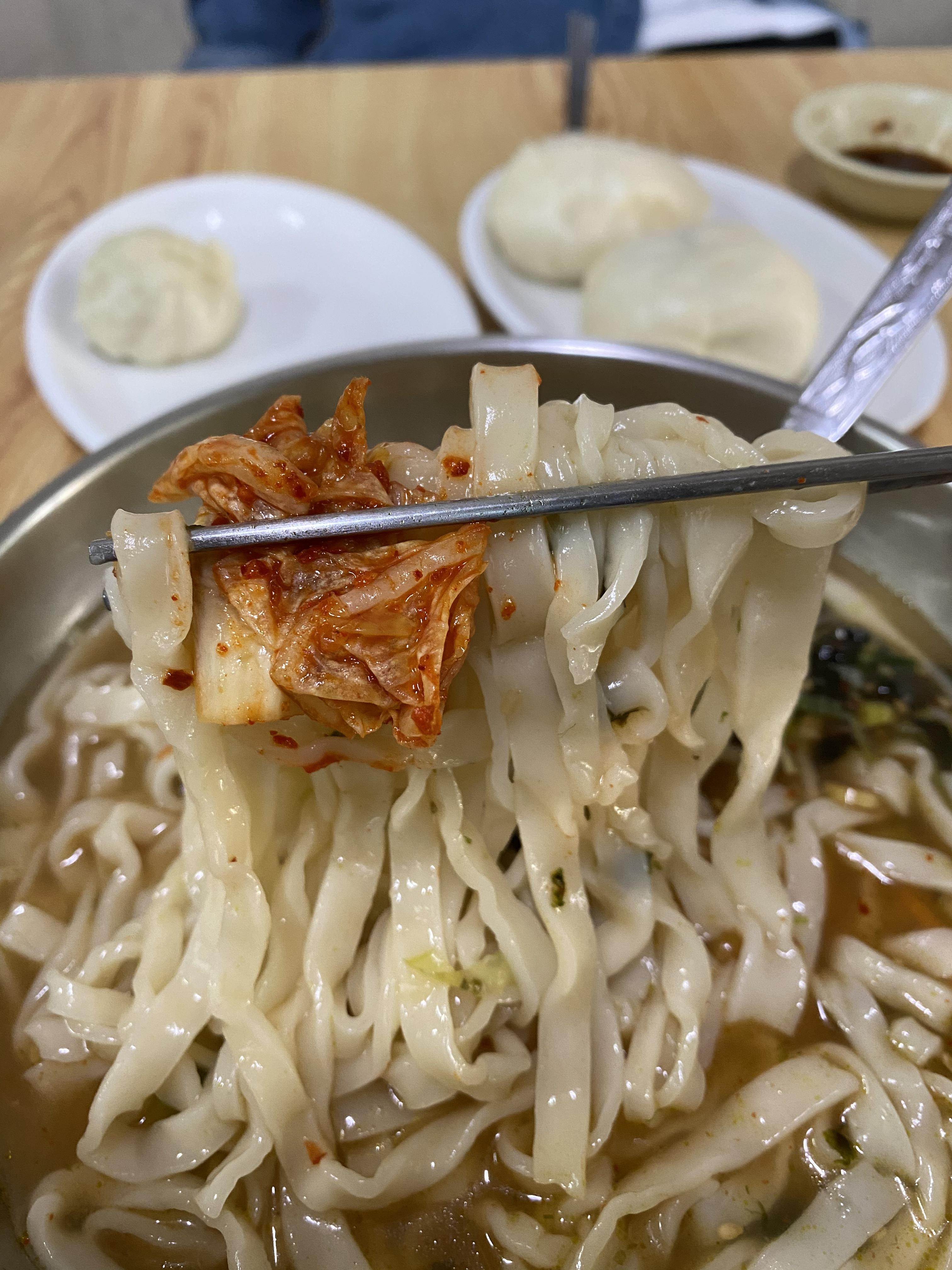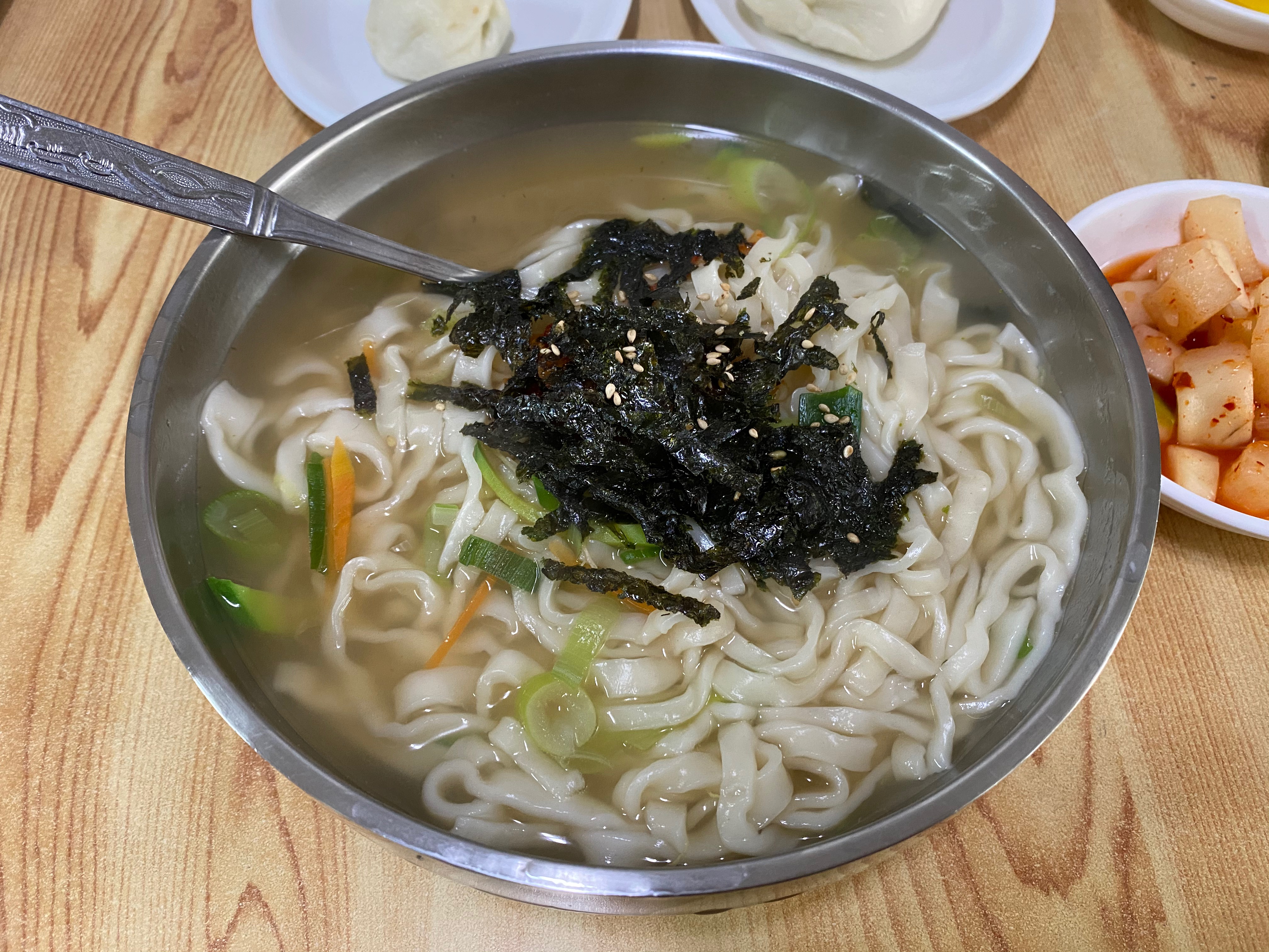 칼국수 한 그릇과 고기만두, 찐빵 클리어.