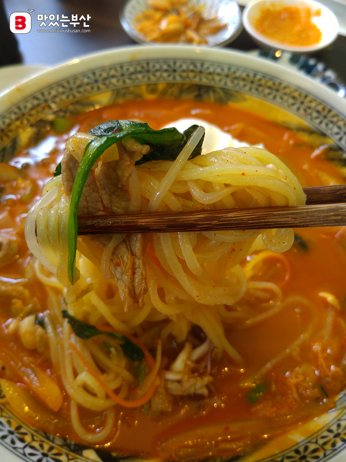 짬뽕국물처럼 매콤한데 불향이 솔솔 풍긴다.