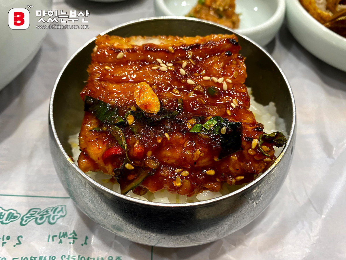 장어 몸통을 집어 공깃밥 위에 올렸는데