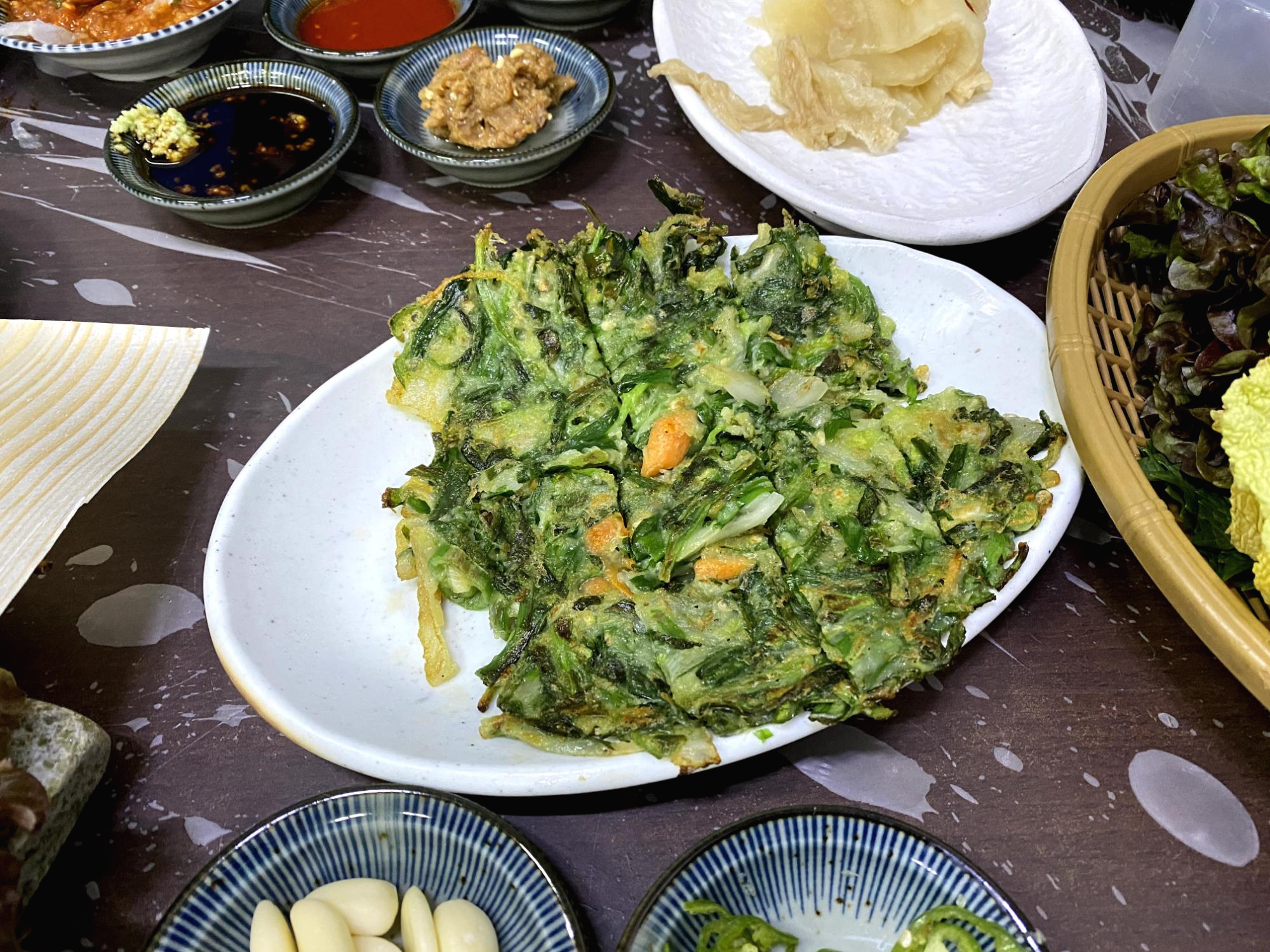 땡초를 넣고 부쳐 매콤한 부추전.