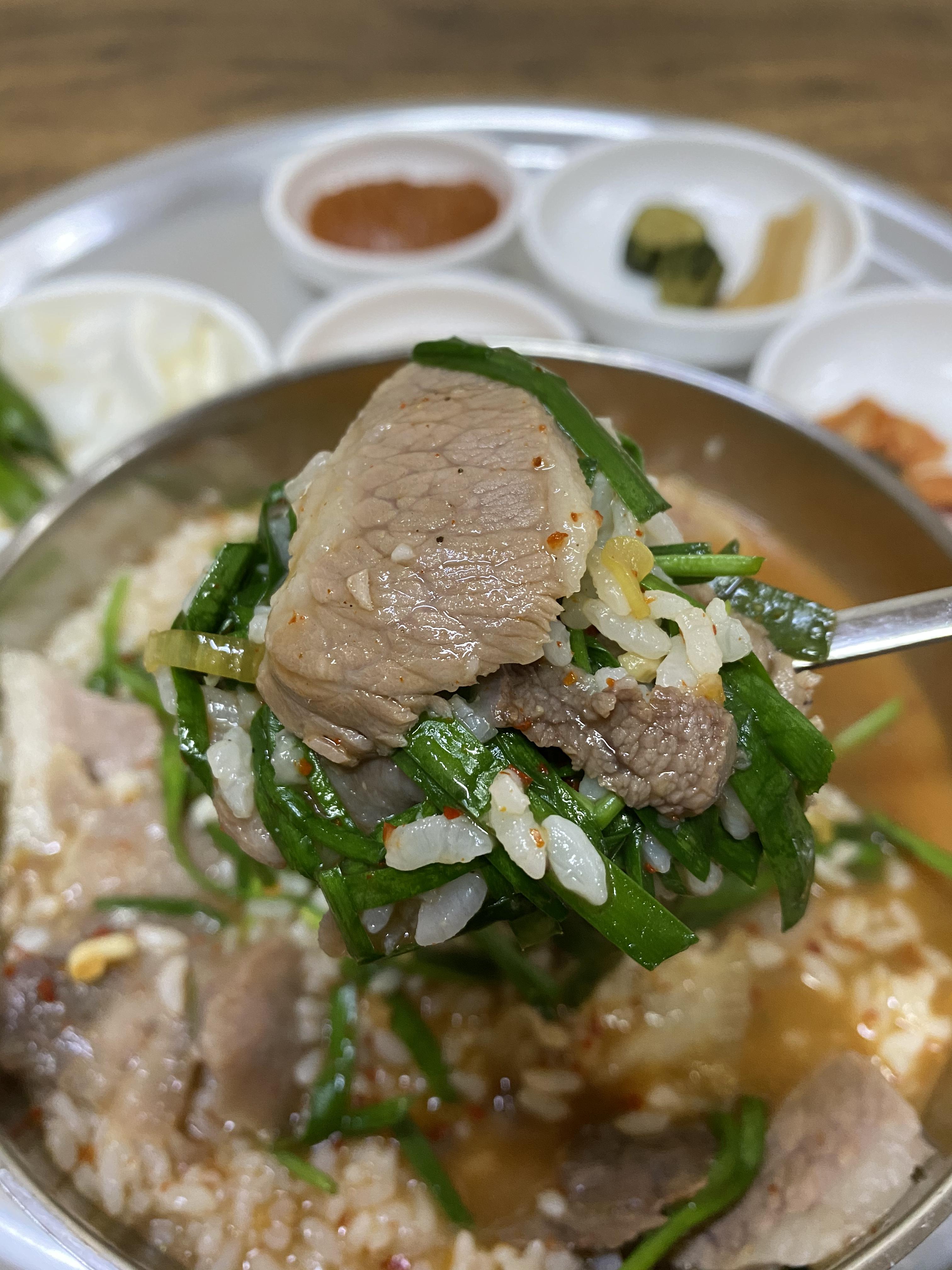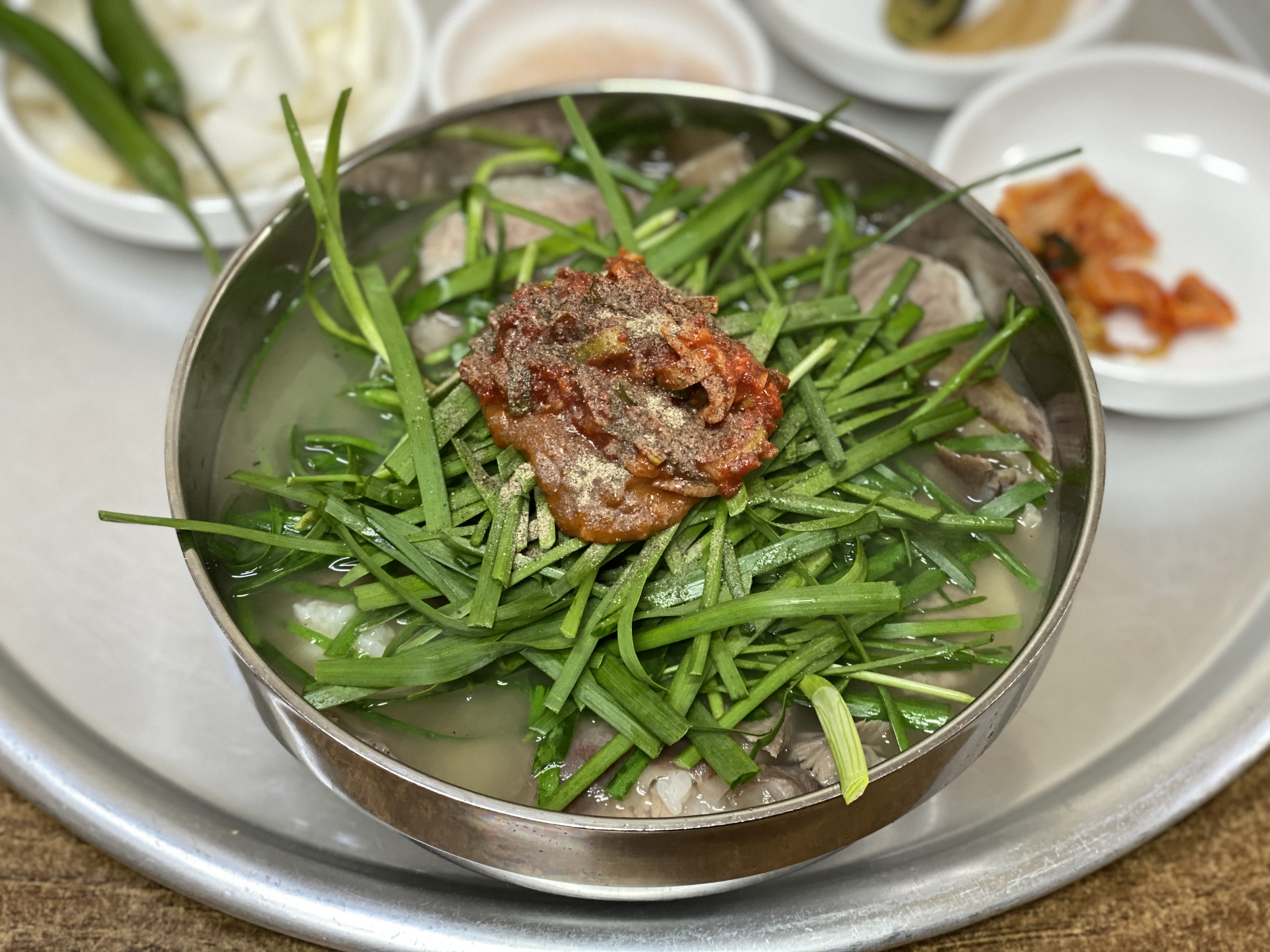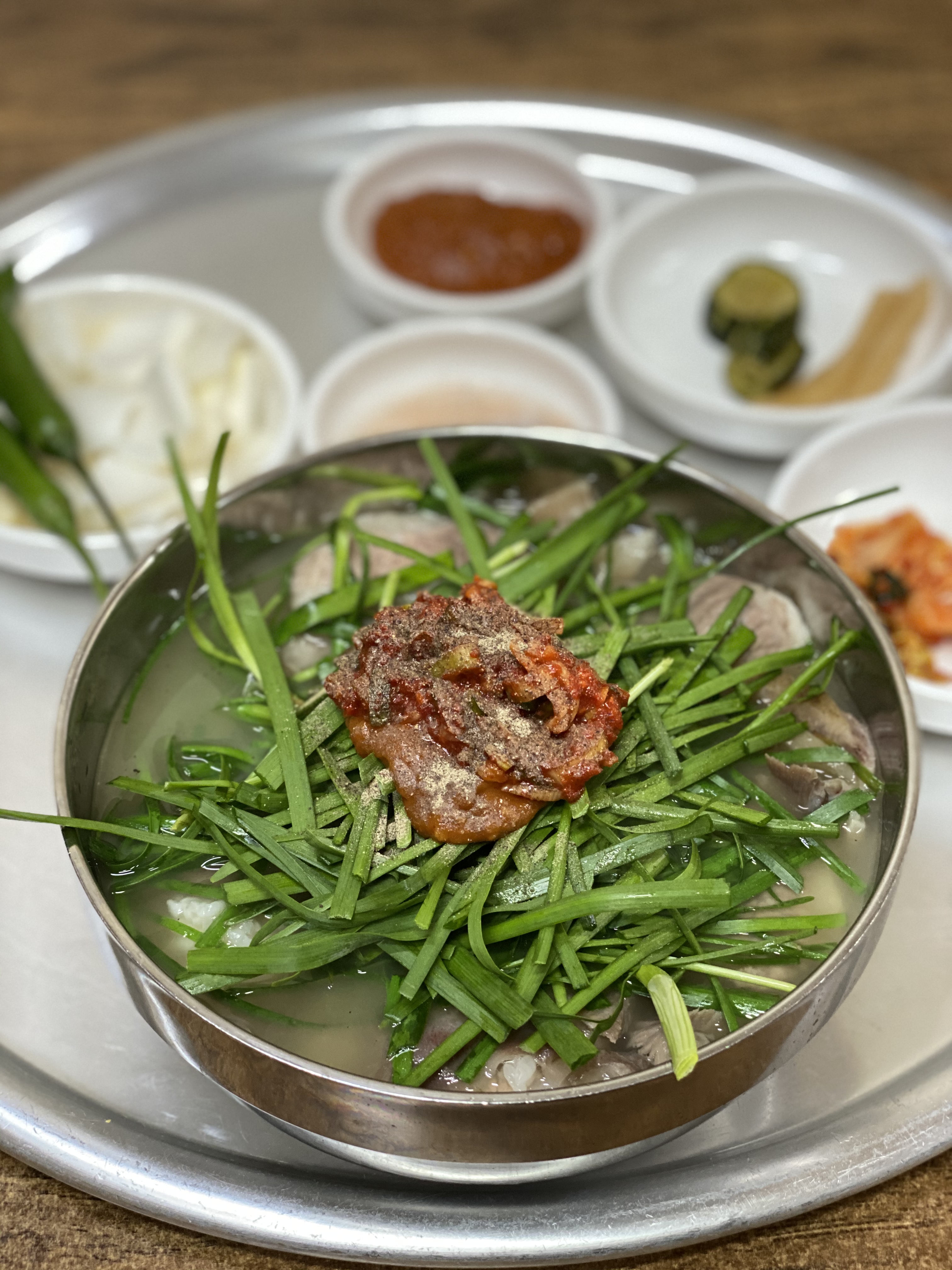 토렴한 국밥 위에 생부추를 푸짐하게 올리고, 양념장을 올린 뒤 후추를 뿌렸다. 양념장은 고춧가루 베이스의 양념과 쌈장을 섞였는데 양념장의 양도 넉넉하다.