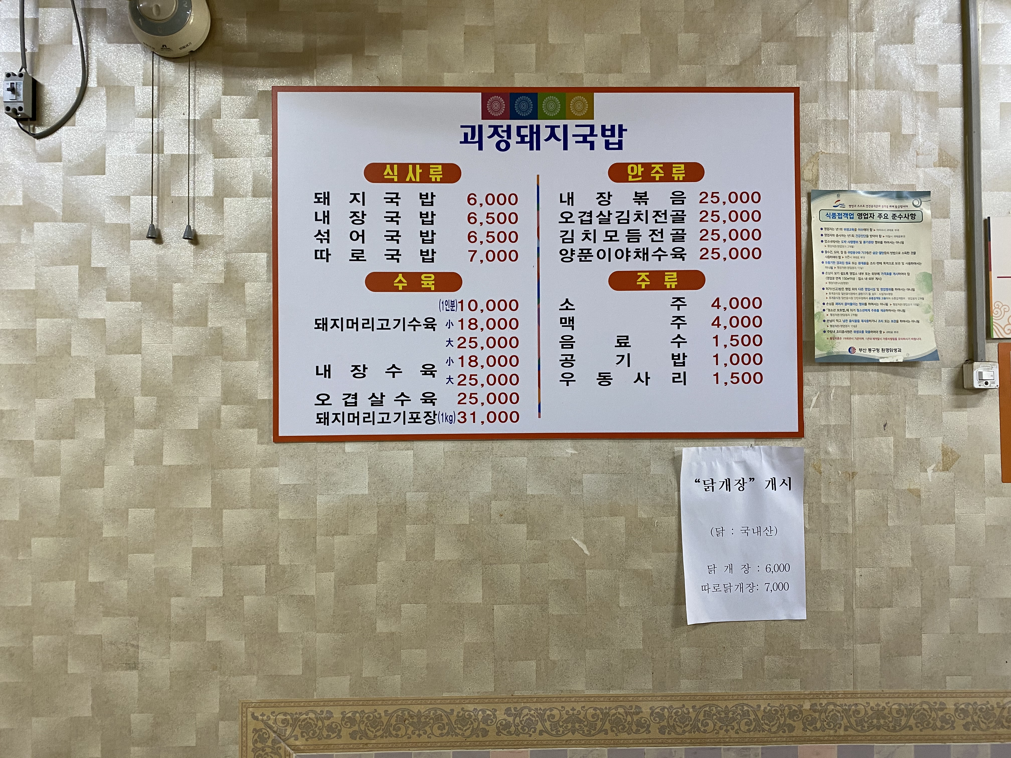 빛바랜간판의 괴정돼지국밥. 좌석은 5석으로 아담한데 꼬릿한 냄새가 가게에 진하게 베어있다.