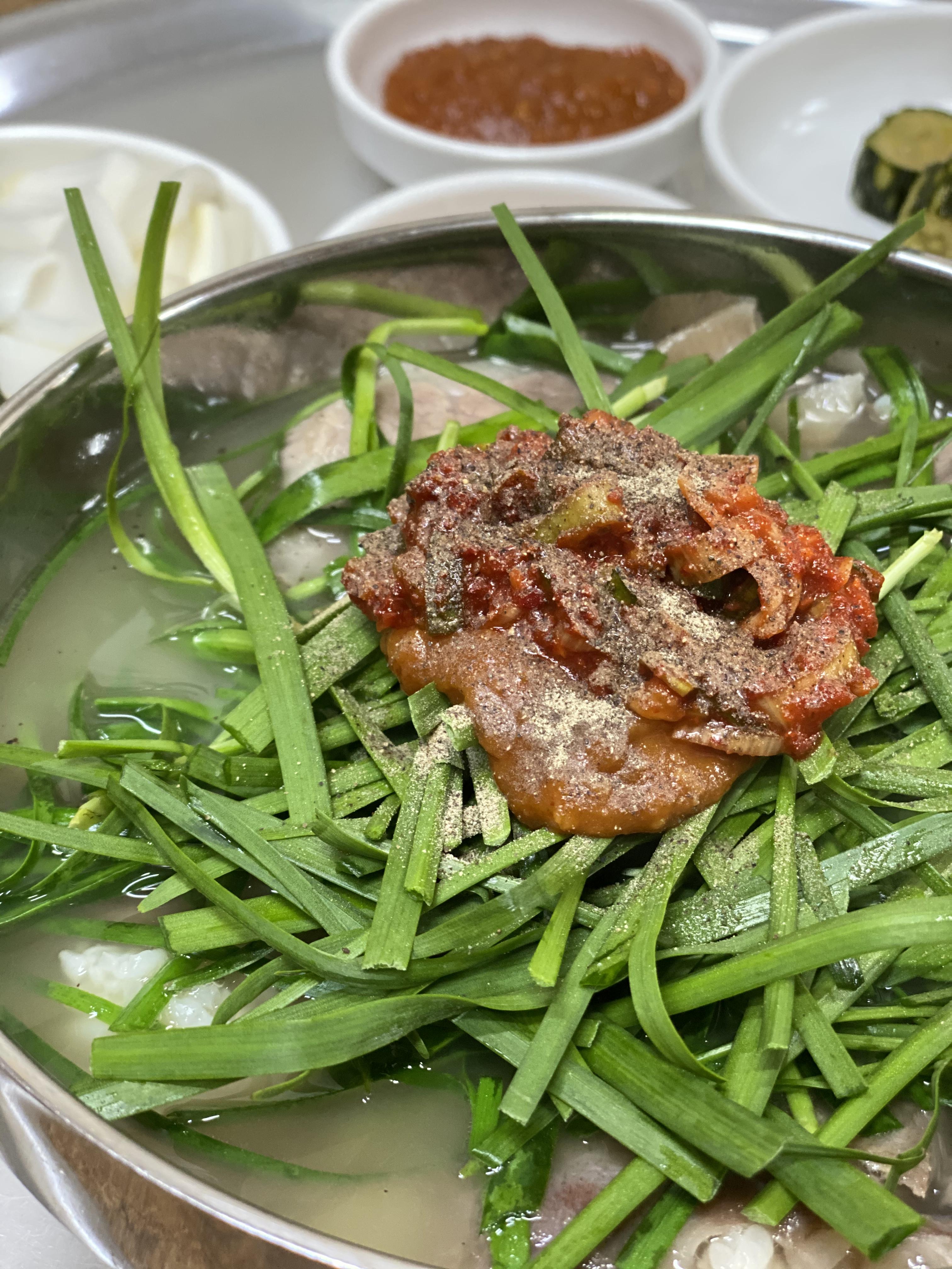 토렴한 국밥 위에 생부추를 푸짐하게 올리고, 양념장을 올린 뒤 후추를 뿌렸다. 양념장은 고춧가루 베이스의 양념과 쌈장을 섞였는데 양념장의 양도 넉넉하다.