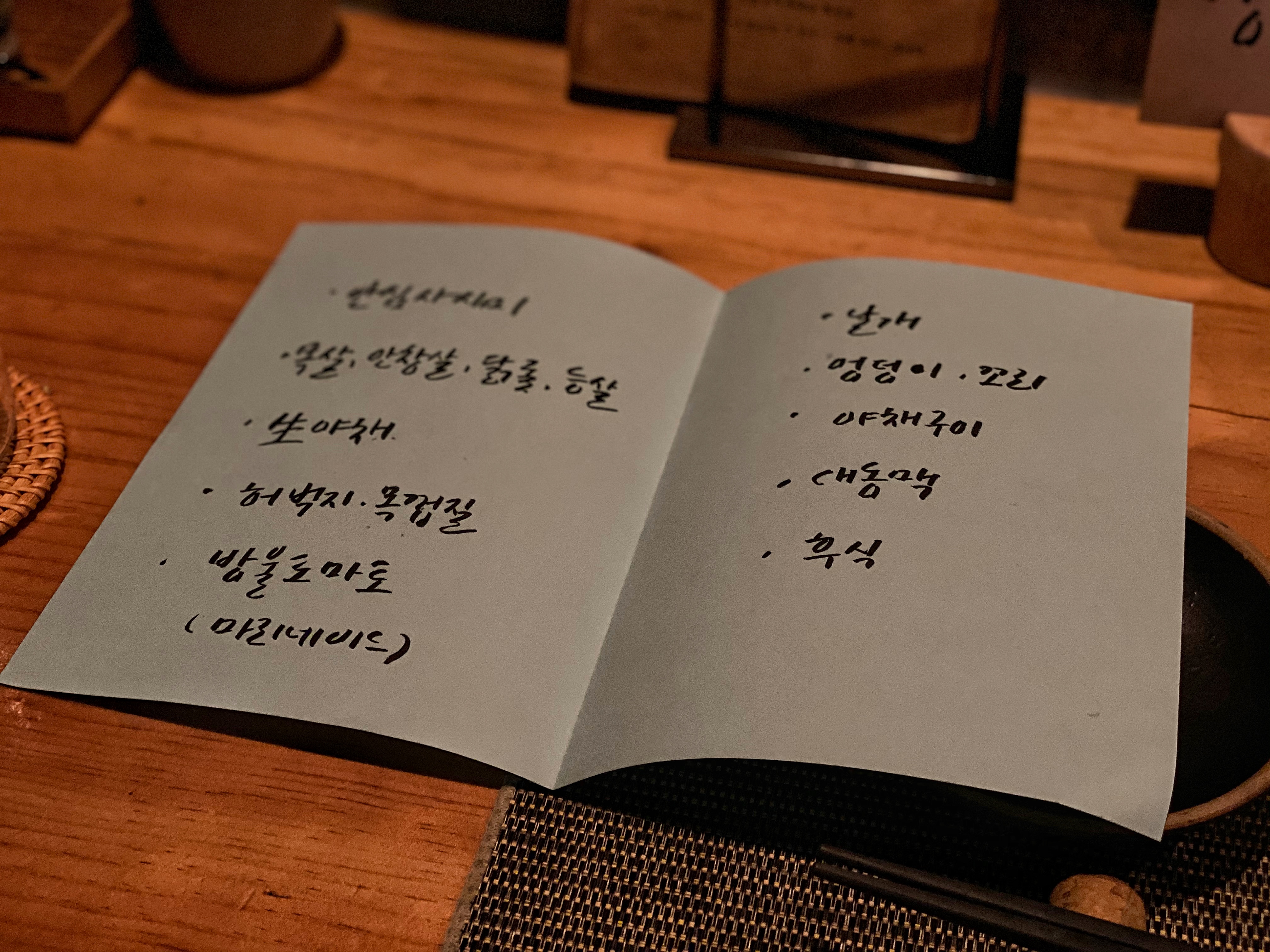 메뉴판을 열어보니 순서에 따른 요리들이 적혀있다. 오랜만이라 그런지 더 기대되는 순간이다.