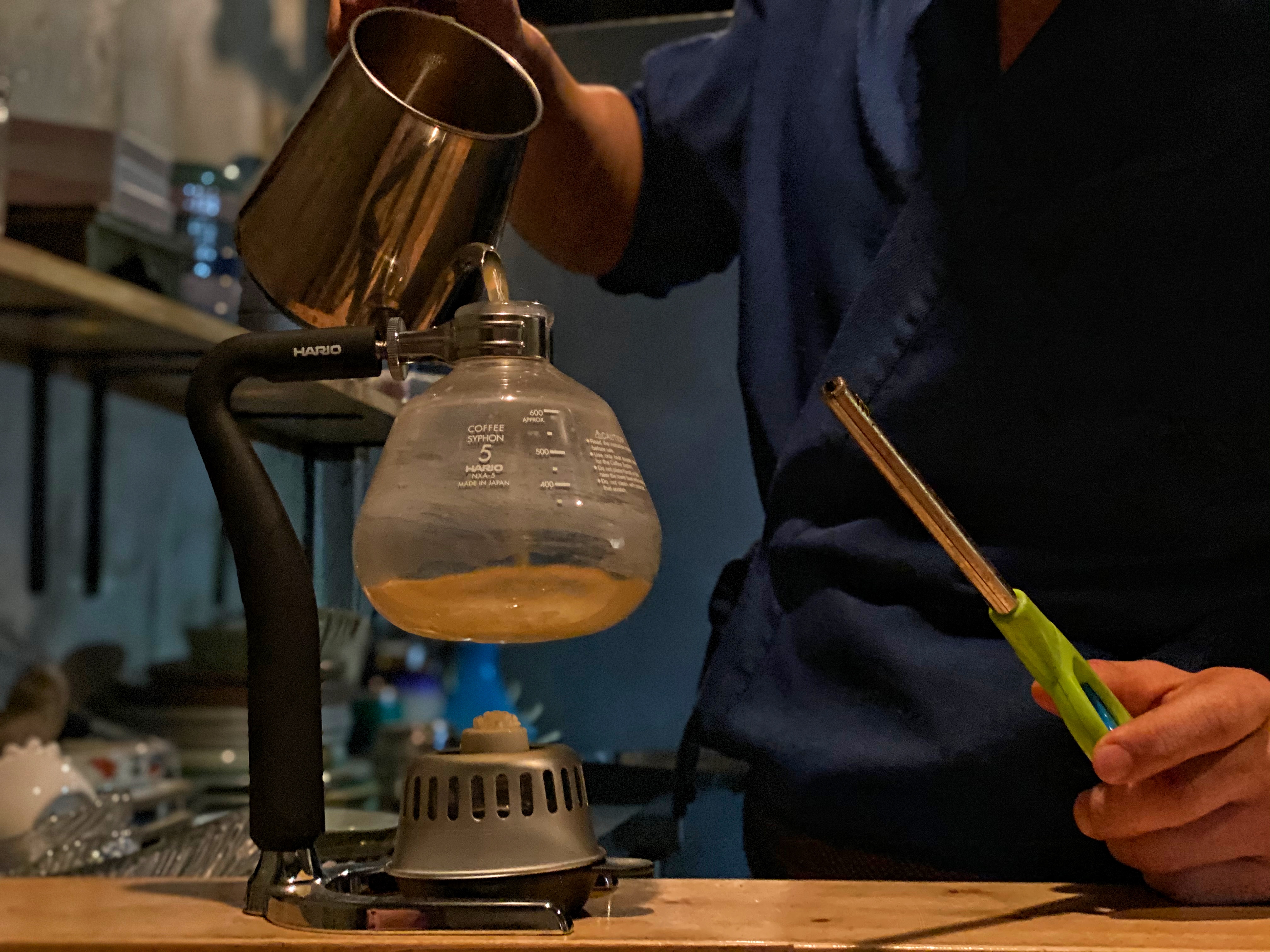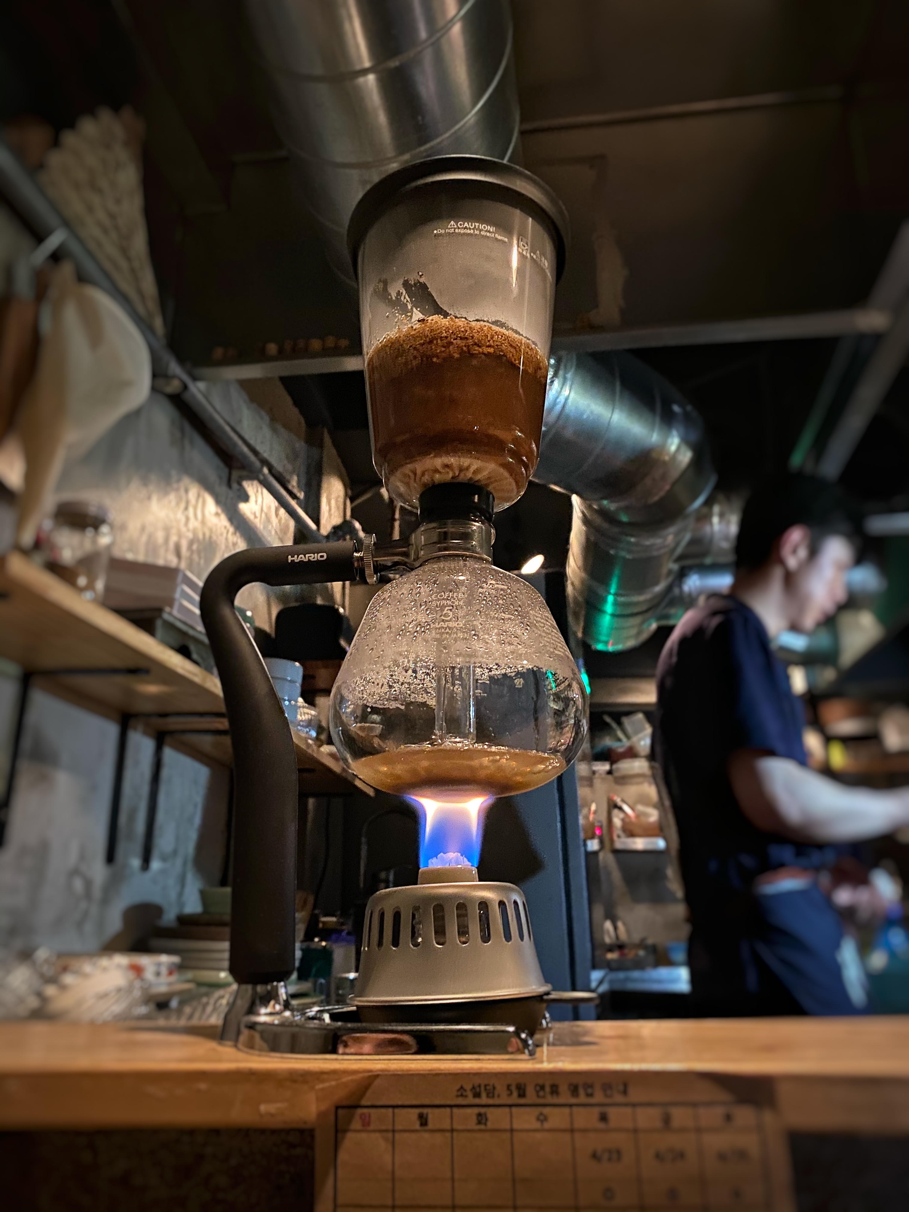 사이폰커피를 추출하는 장비를 올리더니 아래쪽 플라스크에 육수를 붓는다.