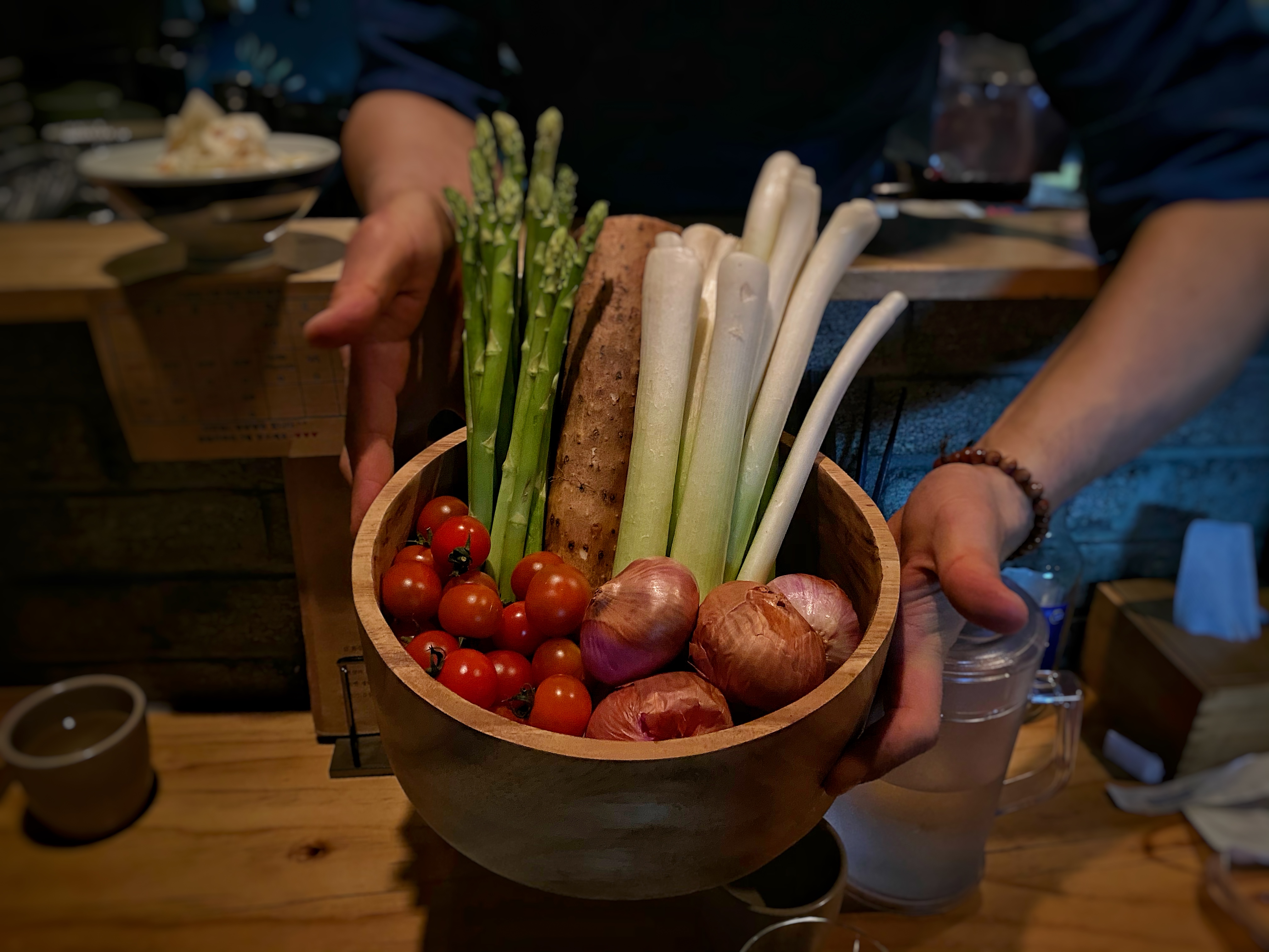 물로 목을 축이고 있으니 나무 통에 담긴 야채를 보여주는데, 한 가지 야채를 선택하면 구이로 해 주겠다고 한다.