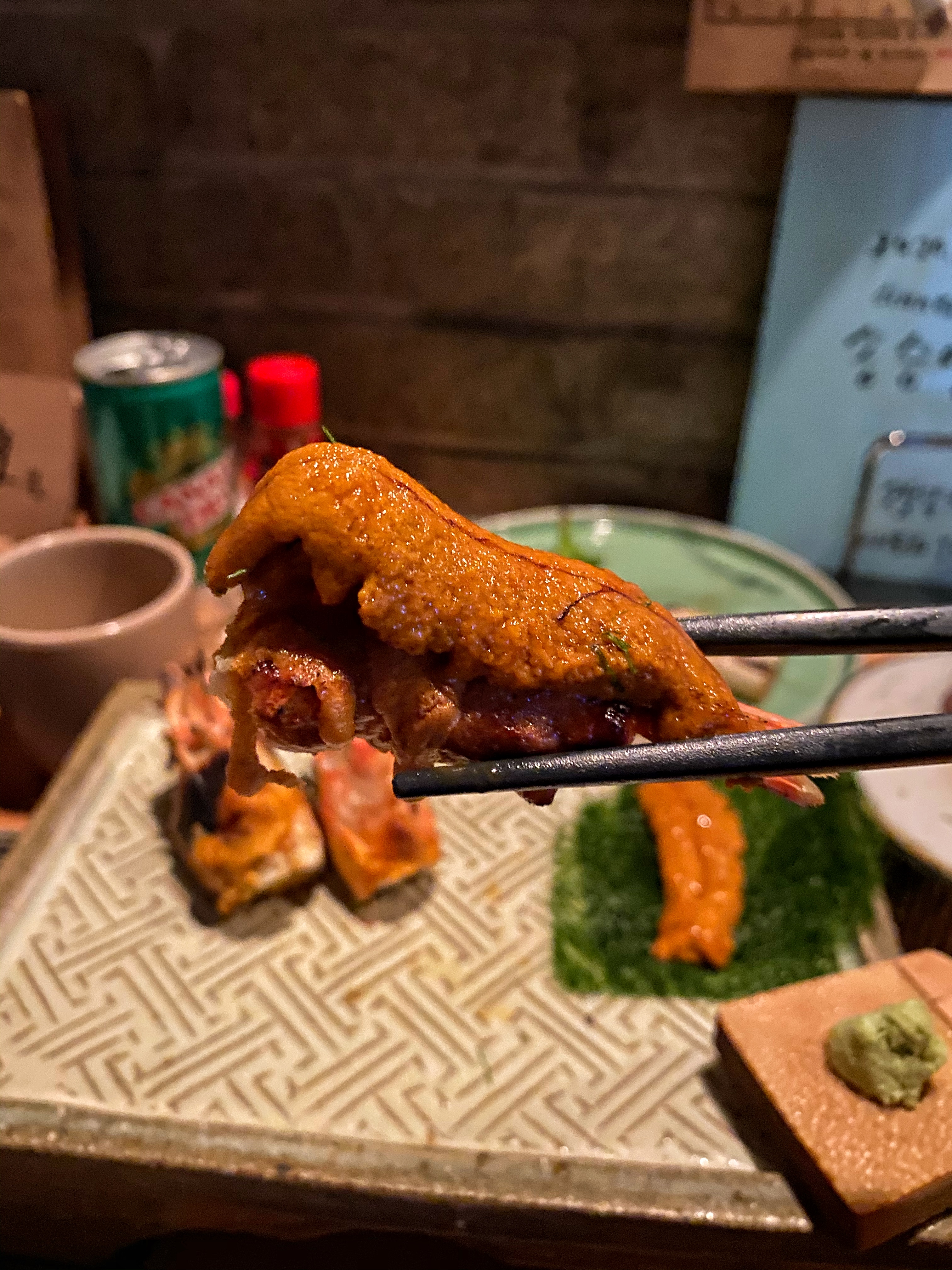 몸통 껍질을 벗기고 성게알(ウニ)를 올려 구웠다.