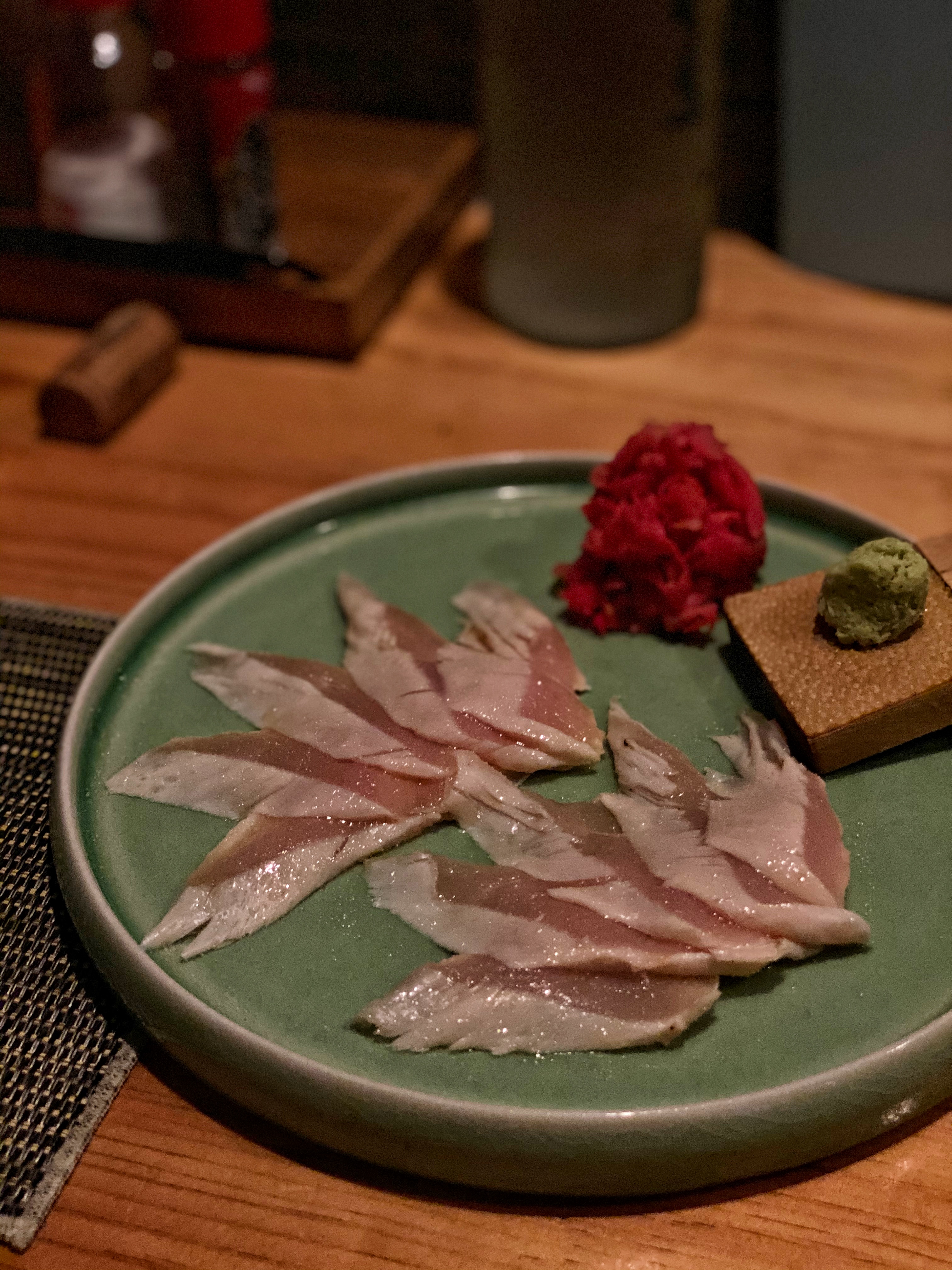 첫번째 플레이트는 닭 안심 사시미. 닭안심을 레어로 구워주던 상수동 쿠시무라에서의 첫 기억은 신선했다. 살코기의 담백함에 뿌려진 소금의 짭짤한 맛. 그리고 부드럽다. 술안주 삼아 일잔일점 했다면, 시작부터 소주 다섯잔이 비워졌겠지.