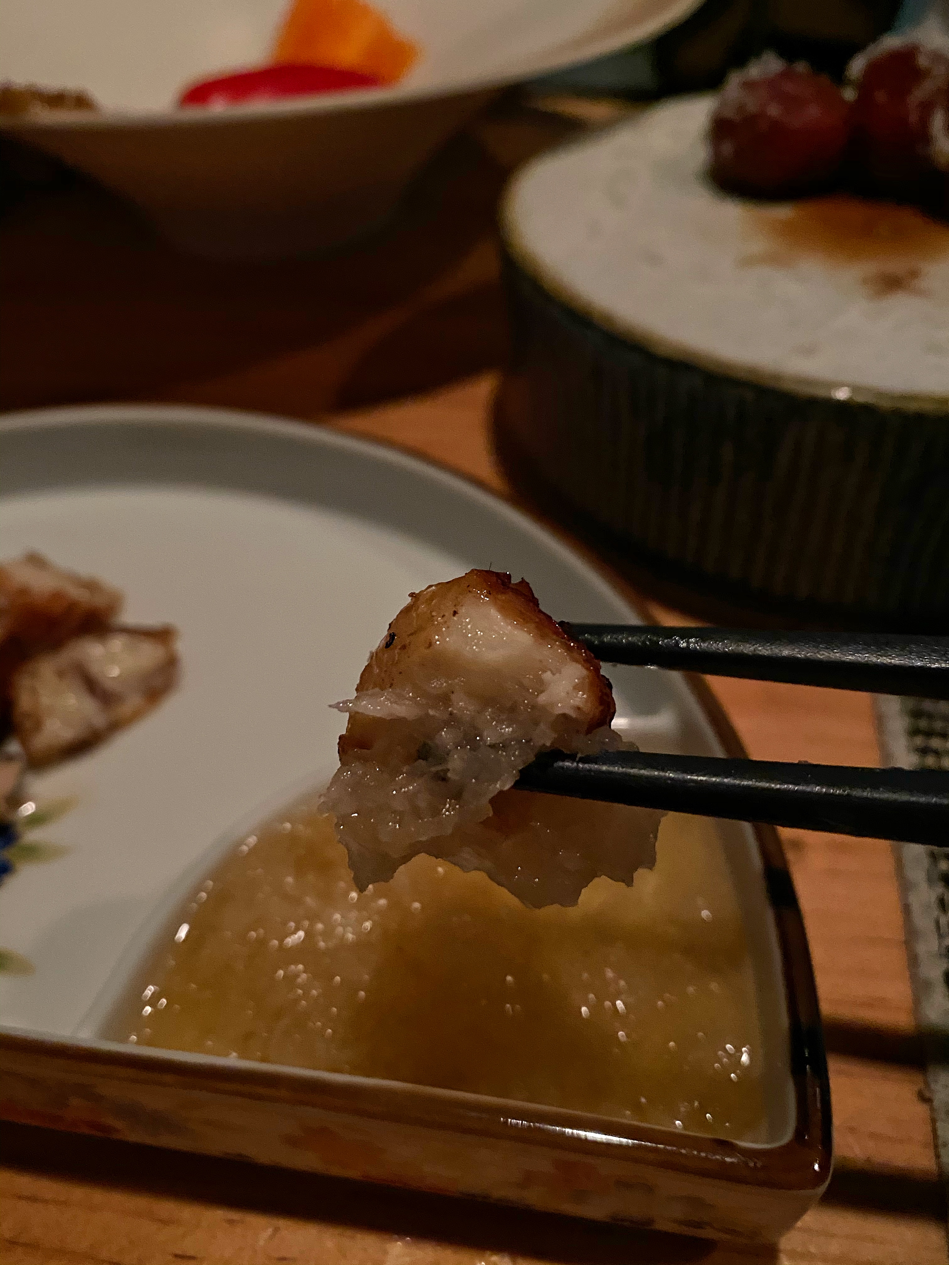 첫번째 플레이트는 닭 안심 사시미. 닭안심을 레어로 구워주던 상수동 쿠시무라에서의 첫 기억은 신선했다. 살코기의 담백함에 뿌려진 소금의 짭짤한 맛. 그리고 부드럽다. 술안주 삼아 일잔일점 했다면, 시작부터 소주 다섯잔이 비워졌겠지.