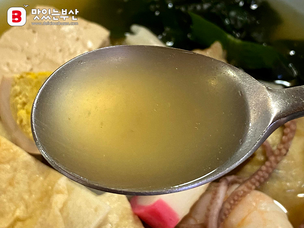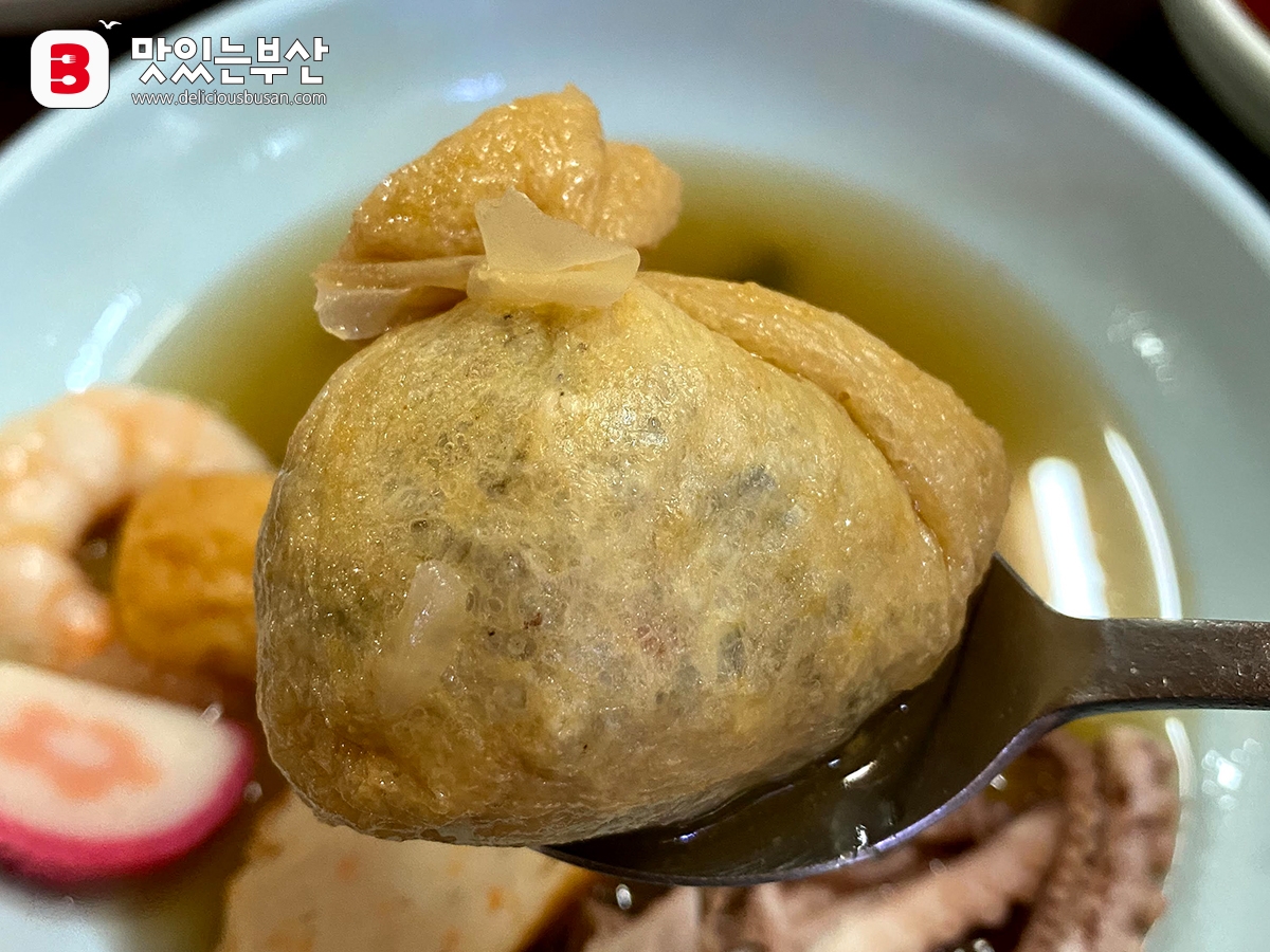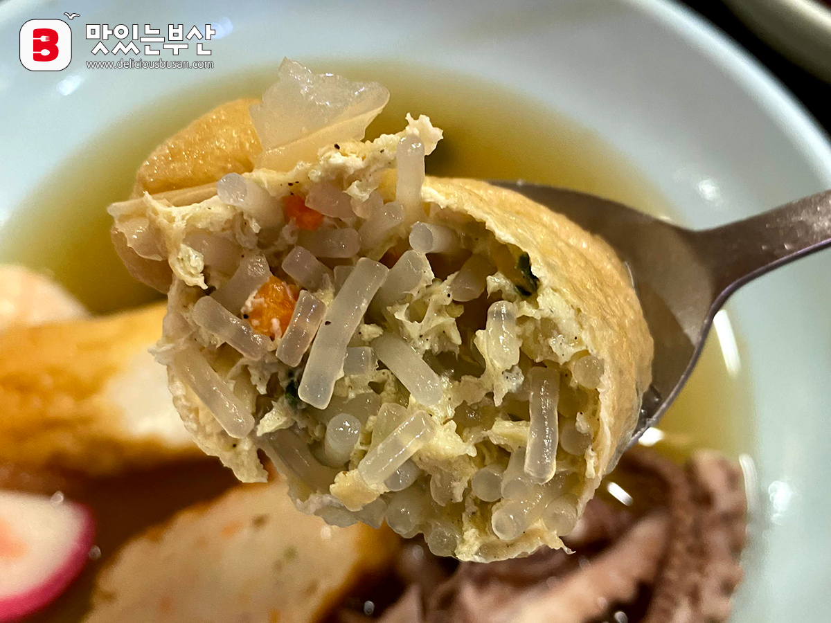 유부주머니 안에는 국물이 찰랑찰랑하다.