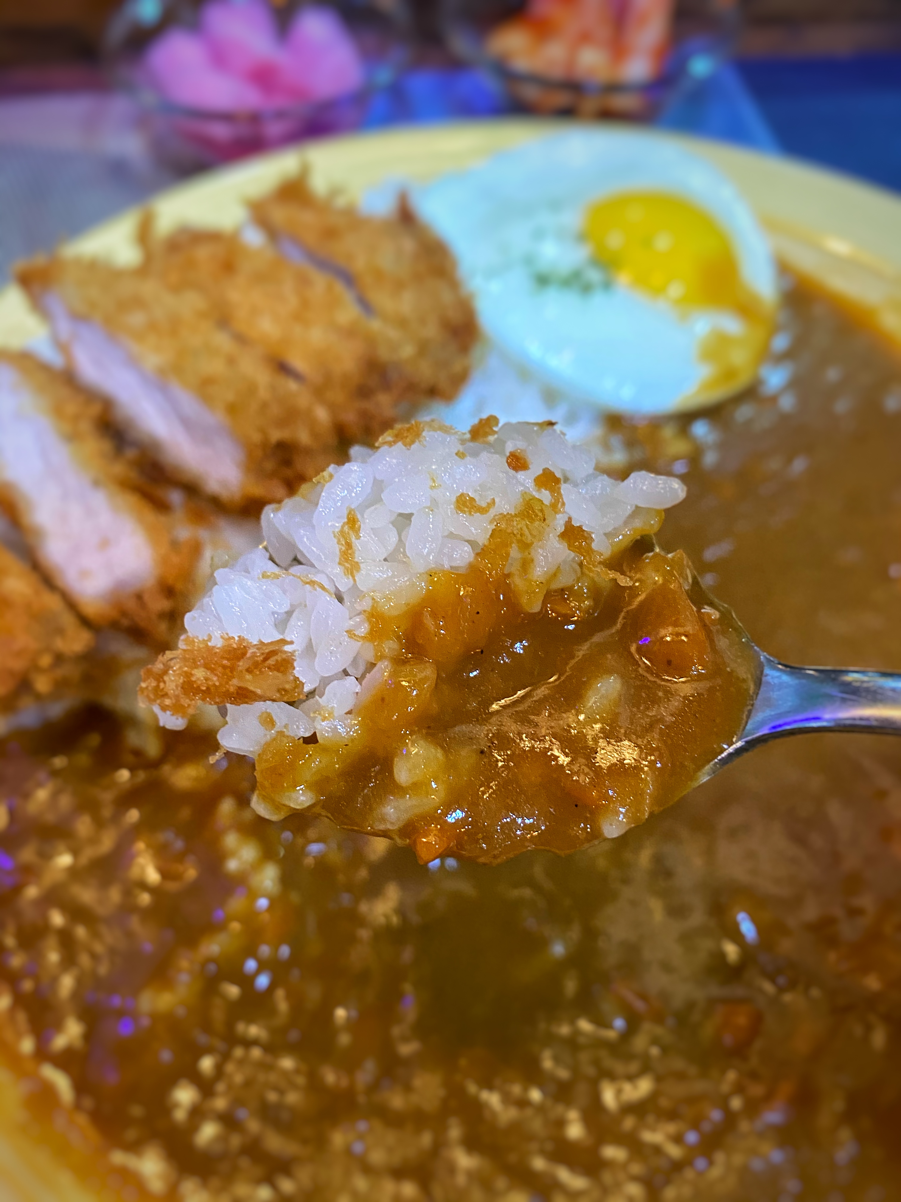 밥과 카레를 같이 떠서 돈까스도 하나 올려 먹어본다.