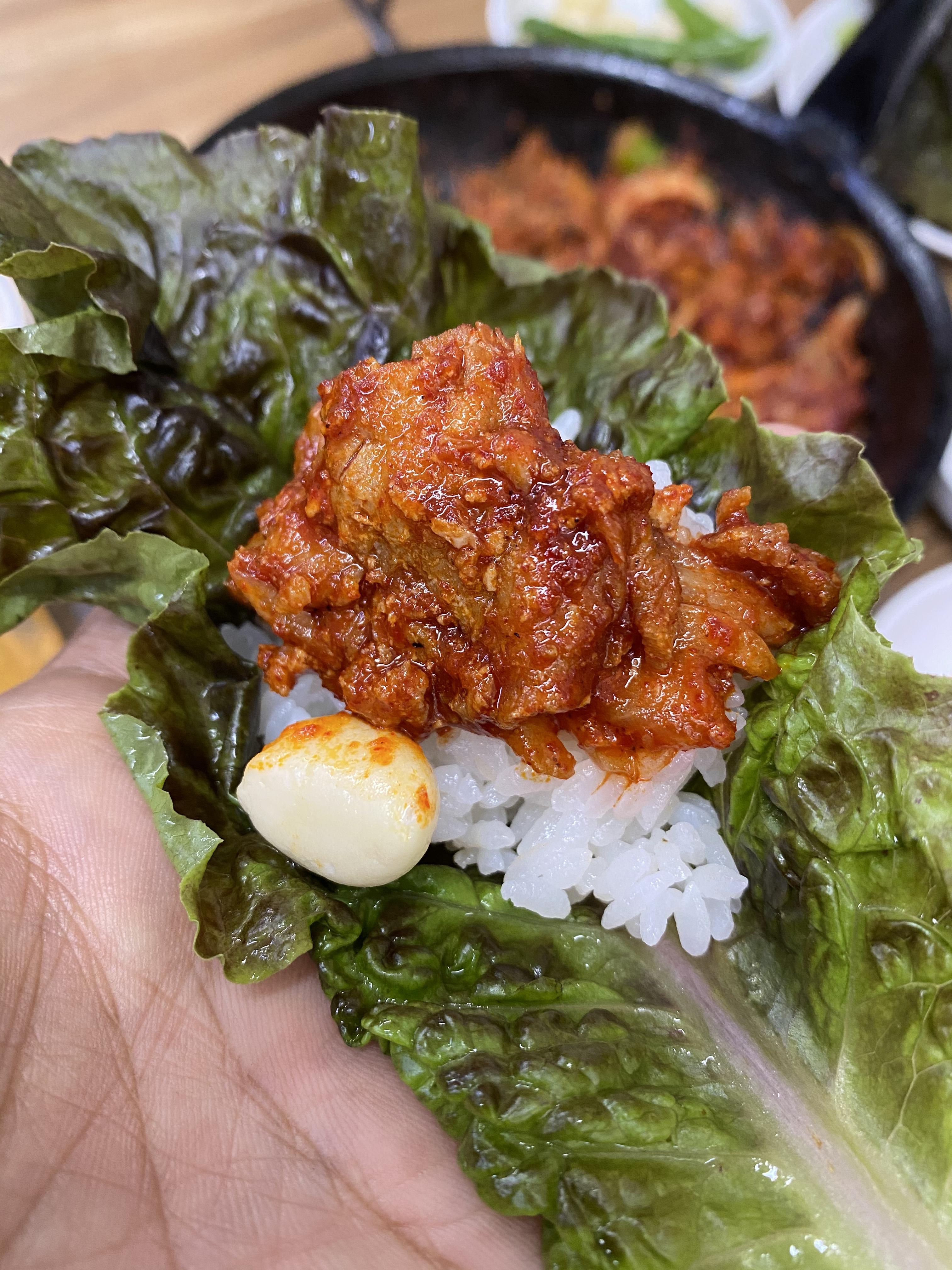 상추 한장 손에 올리고 밥과 불고기를 올려 싸 먹고.
