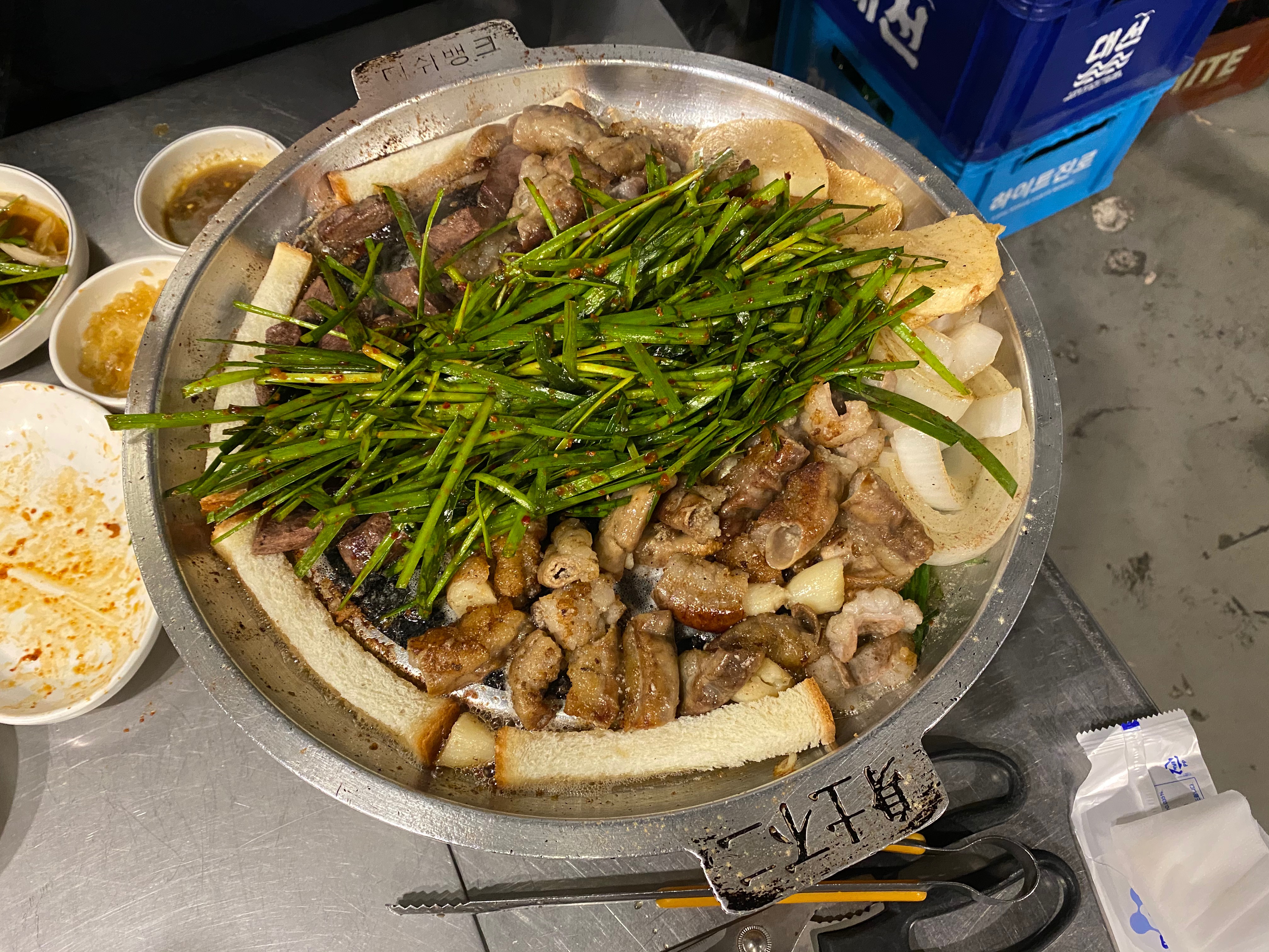 초벌된 곱창을 한번 더 구워주고, 가운데 부추를 수북하게 올려준다.