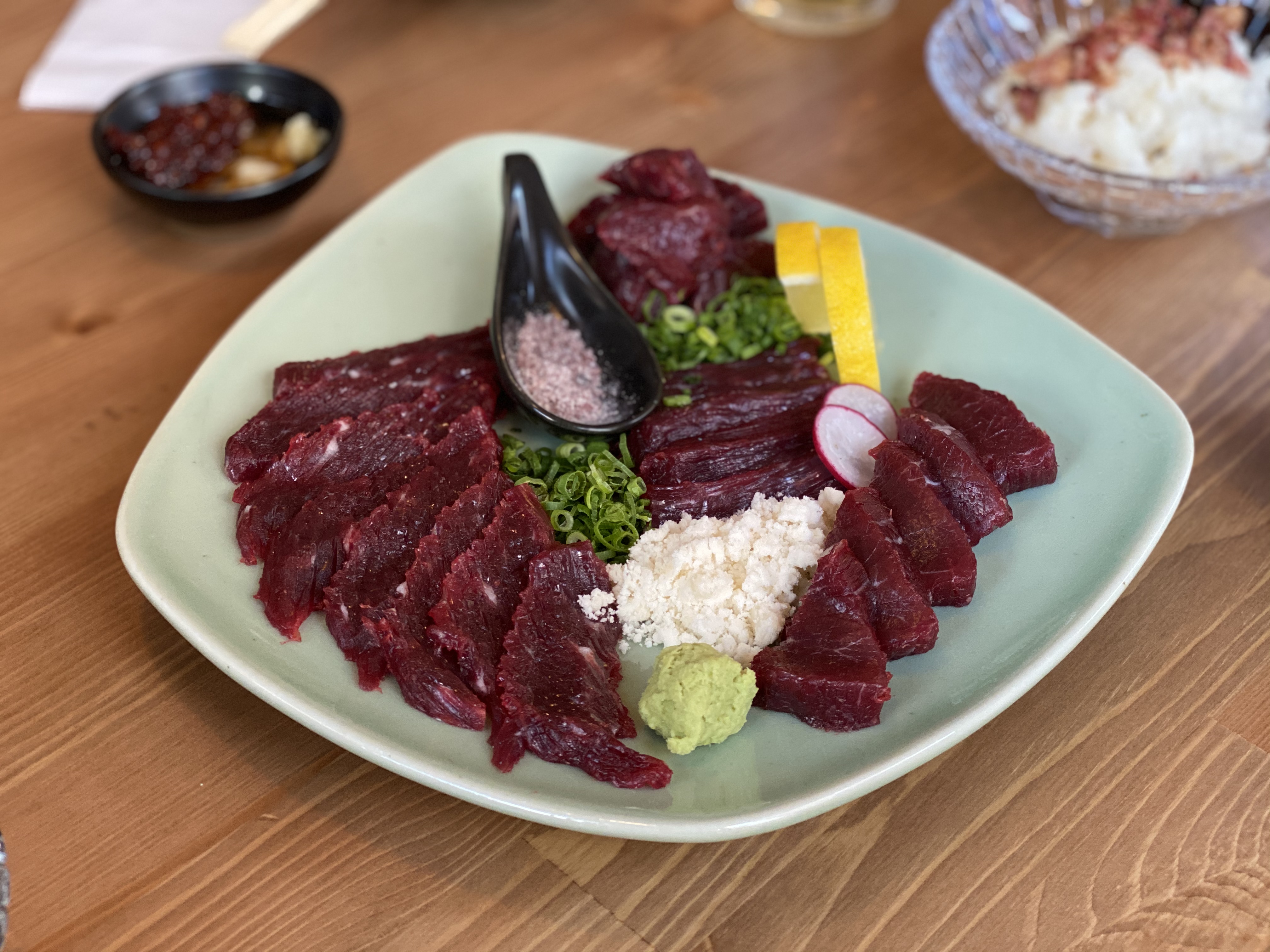 생고기에 칼맛을 더해 회를 뜨듯이 사시미로 내어주는 스타일이다.