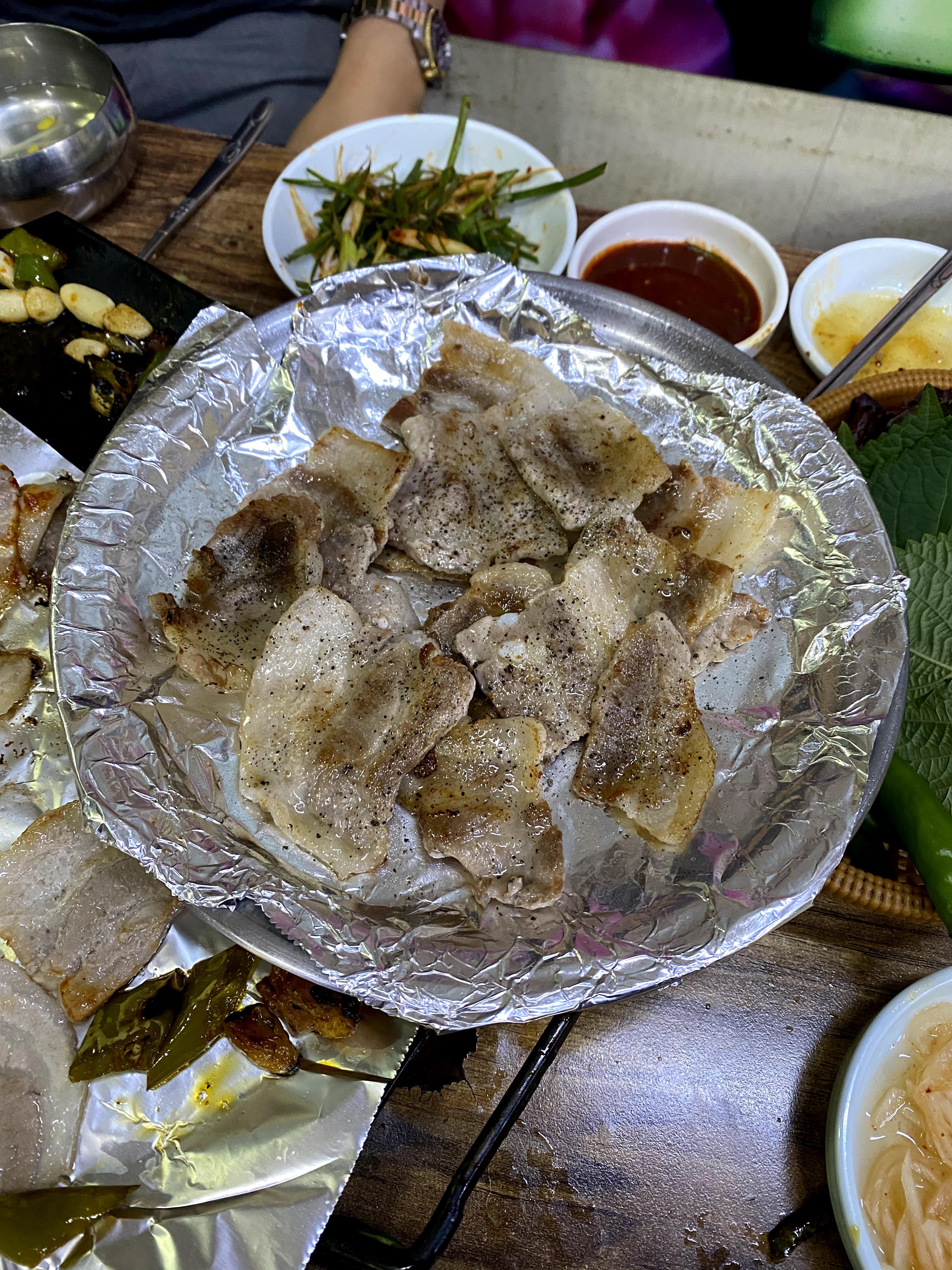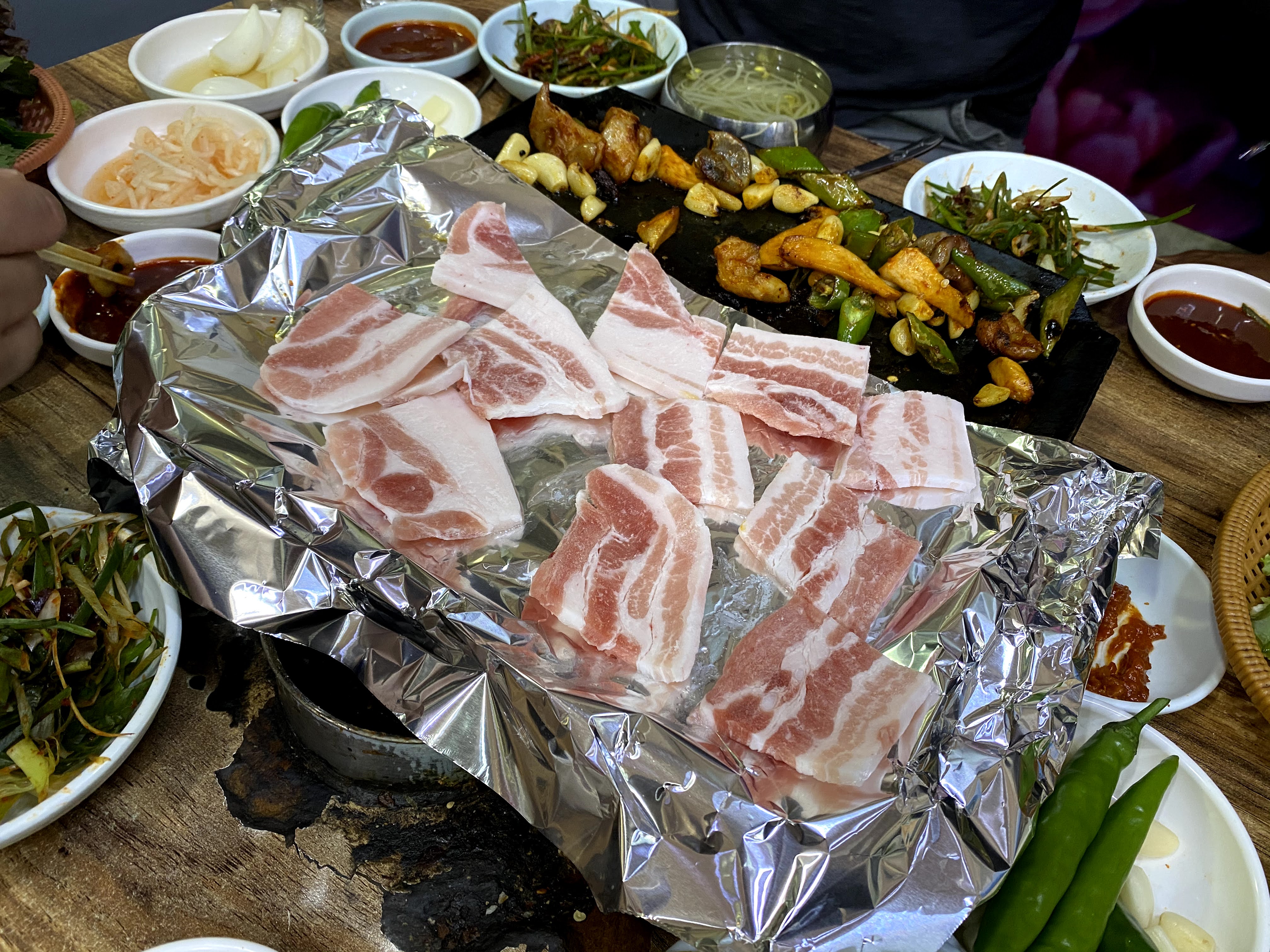 그 동안 불판에 알미늄포일을 깔고 냉삼을 올려 구워 안주가 끊기지 않게 만들어 준다.