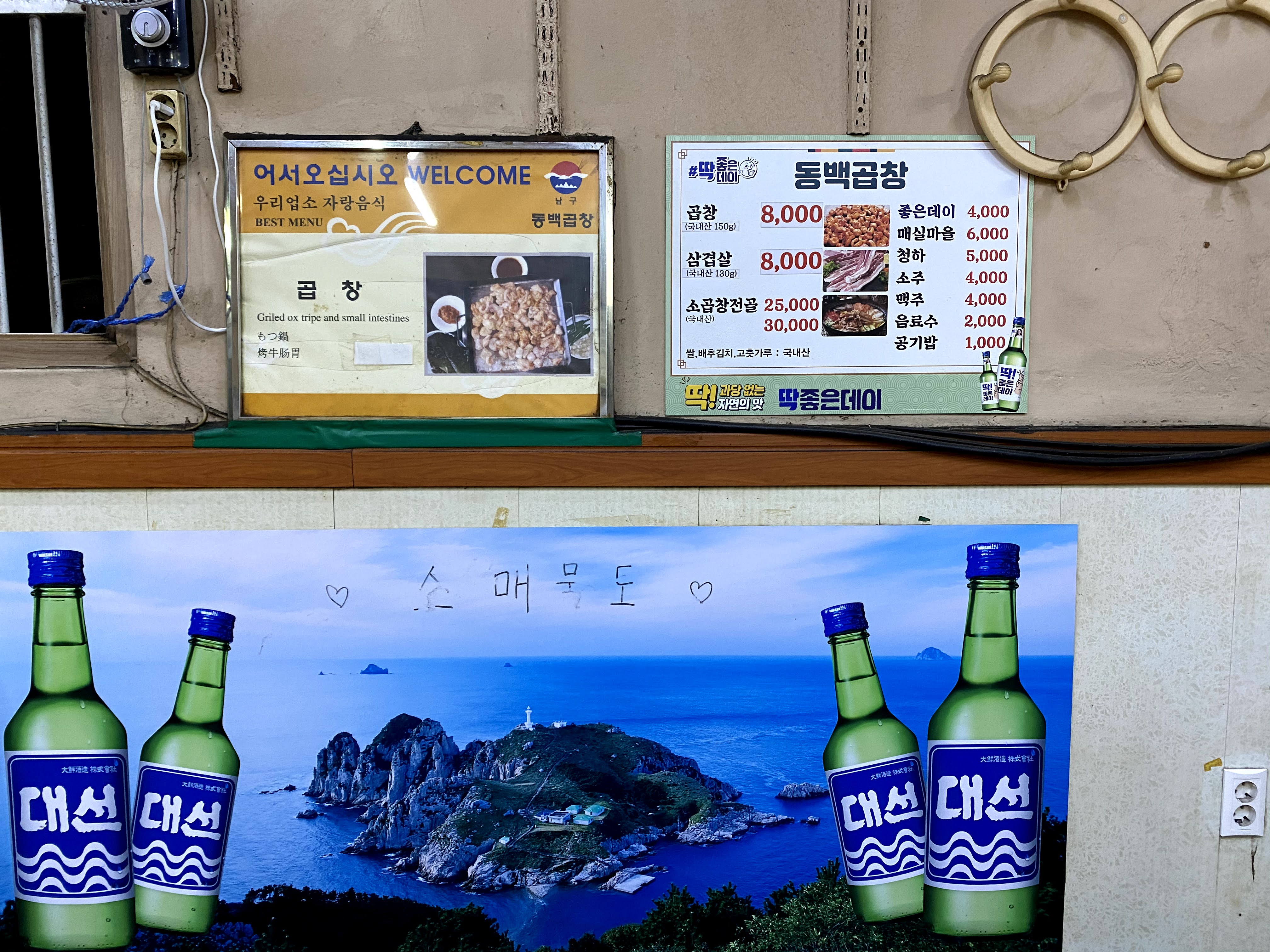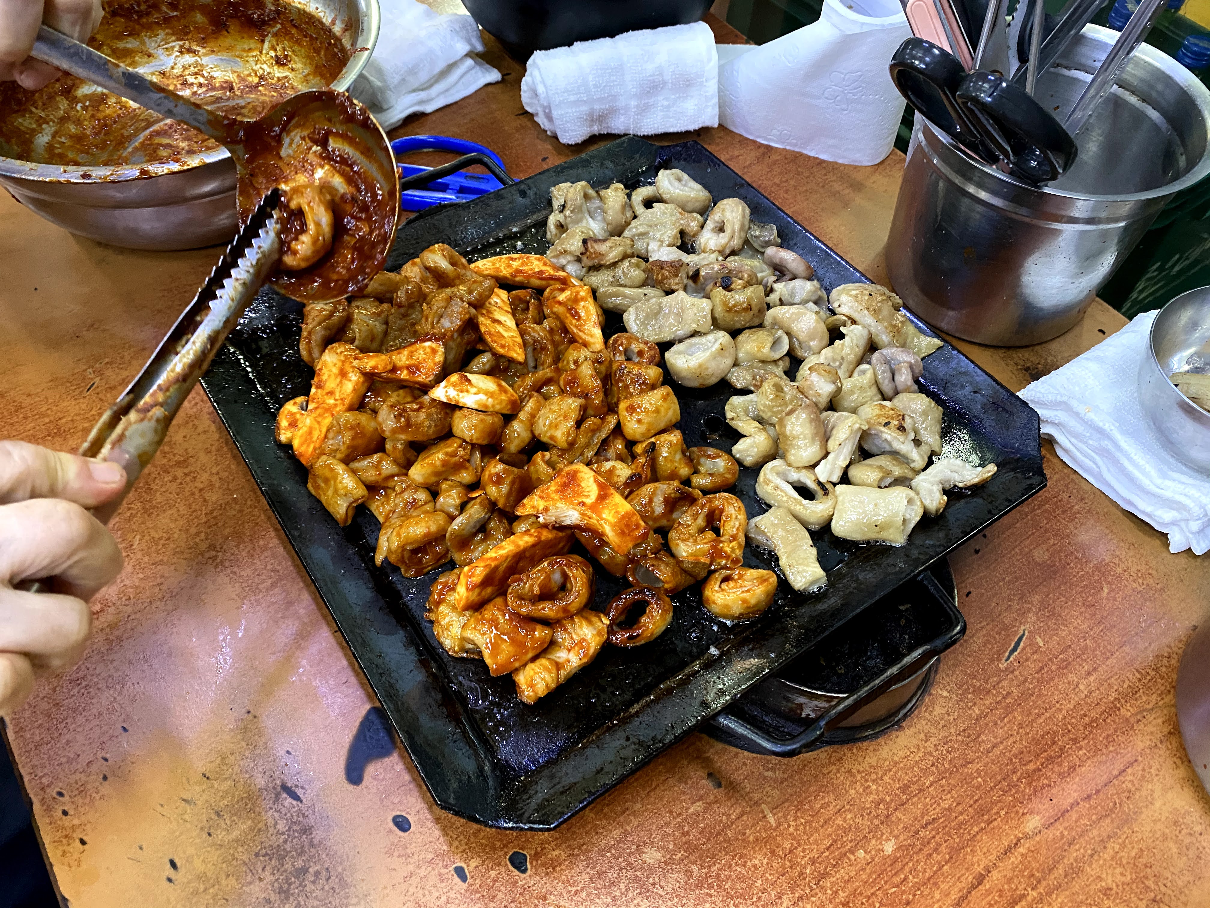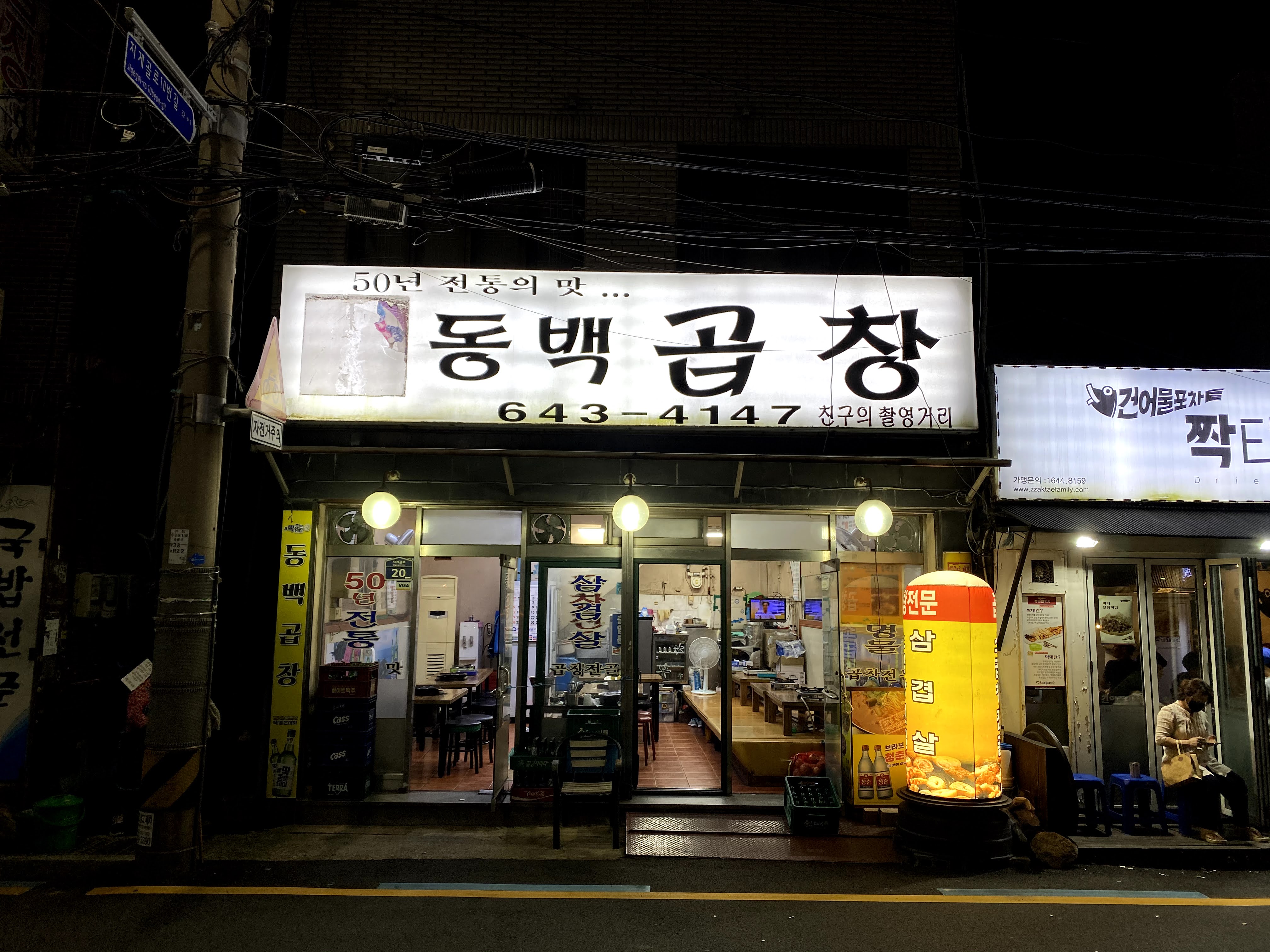 이번에 방문한 곳은 지인이 단골이라고 추천한 동백곱창. 50년전통이라는 간판의 글씨마저 희미한데 늦은 시간에 방문했더니 할머니 혼자 운영하고 있었다.