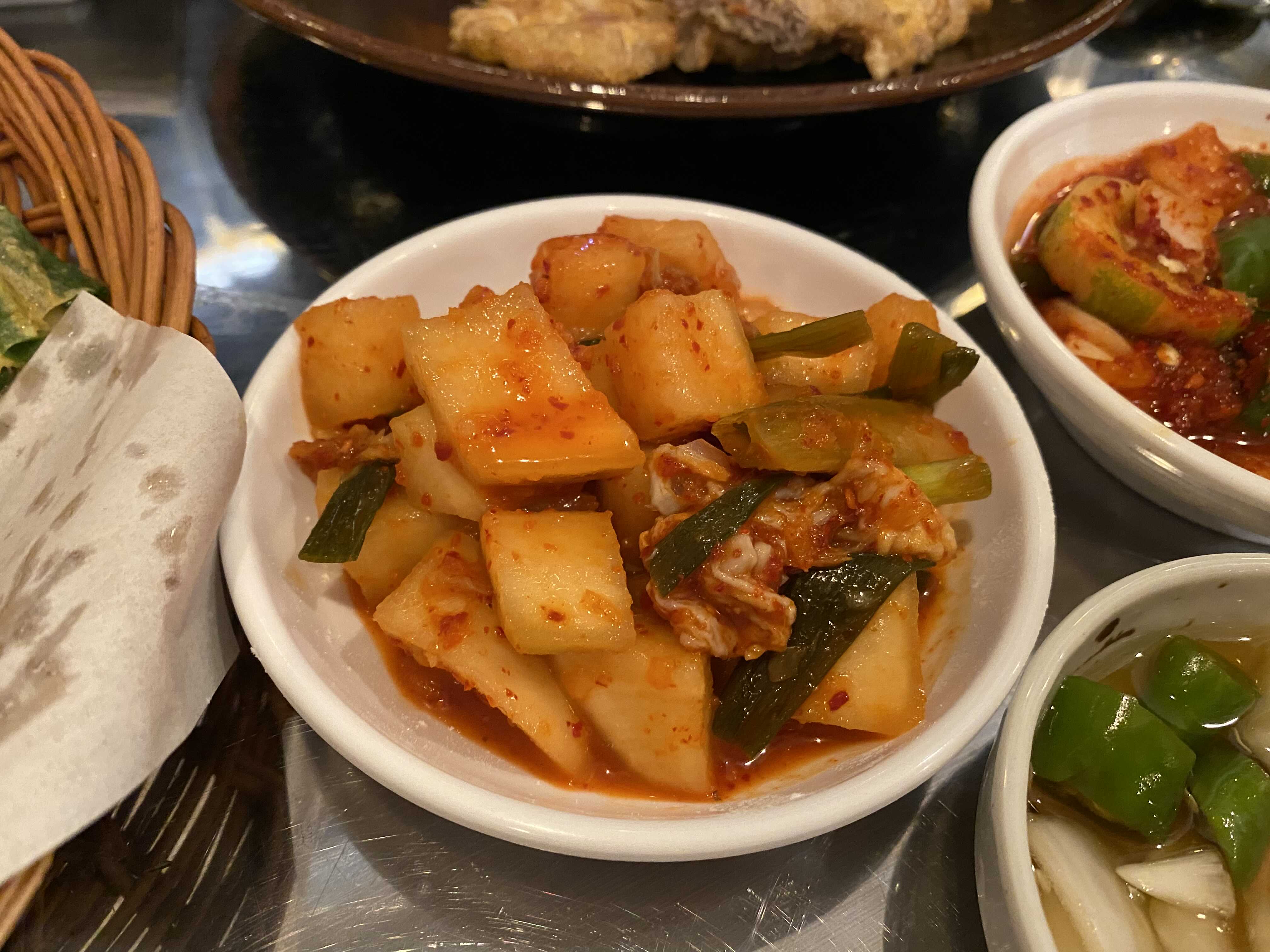 소고기산적찌짐에는 대구아가미젓과 깍두기를 내어준다.