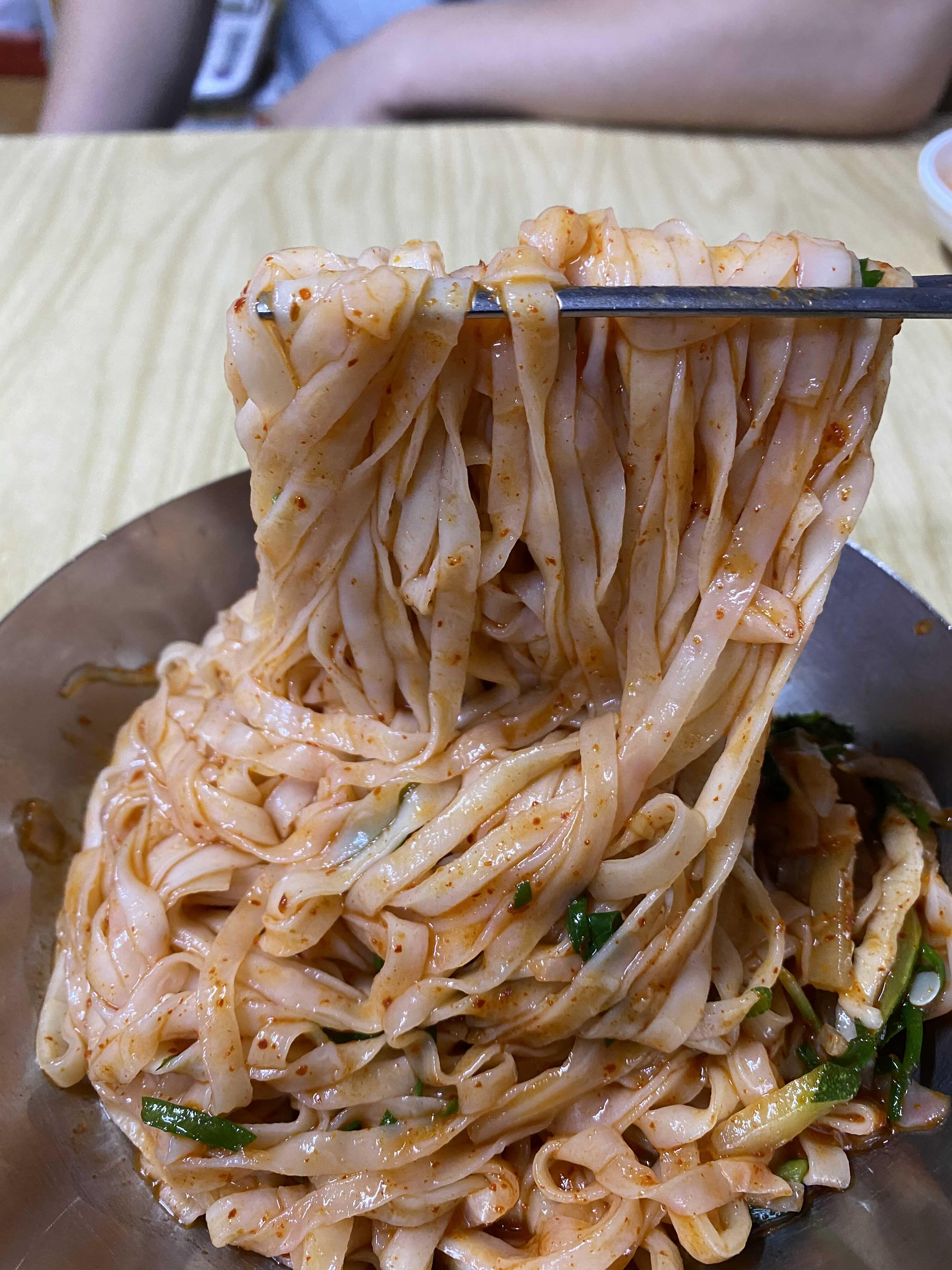 빨간 비빔칼국수지만 맵지 않고, 얄브리한 면발에 양념이 착 스며들어 매력을 뽐낸다.