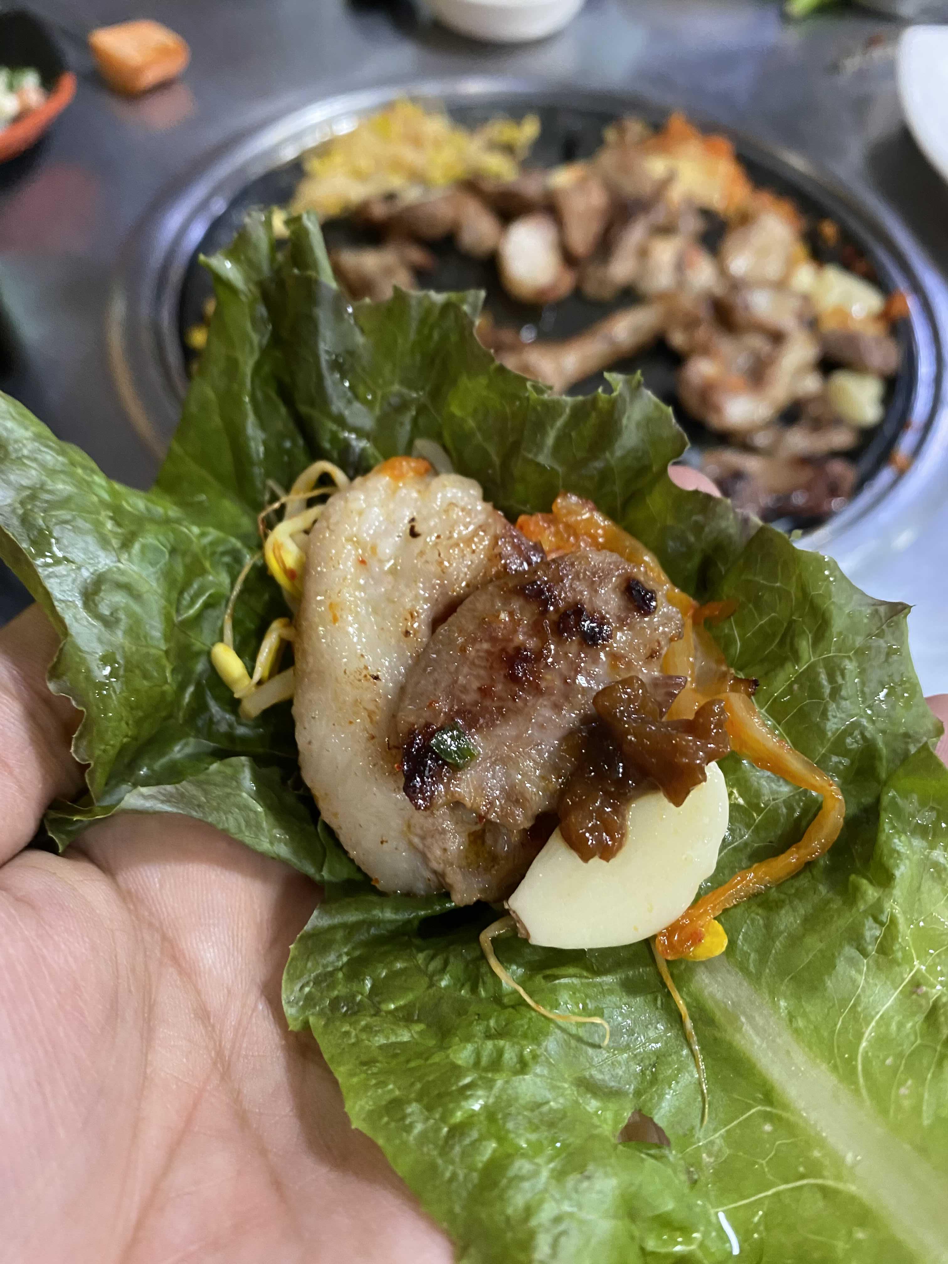 상추 위에 이것 저것 올려서 한 입 먹어본다.