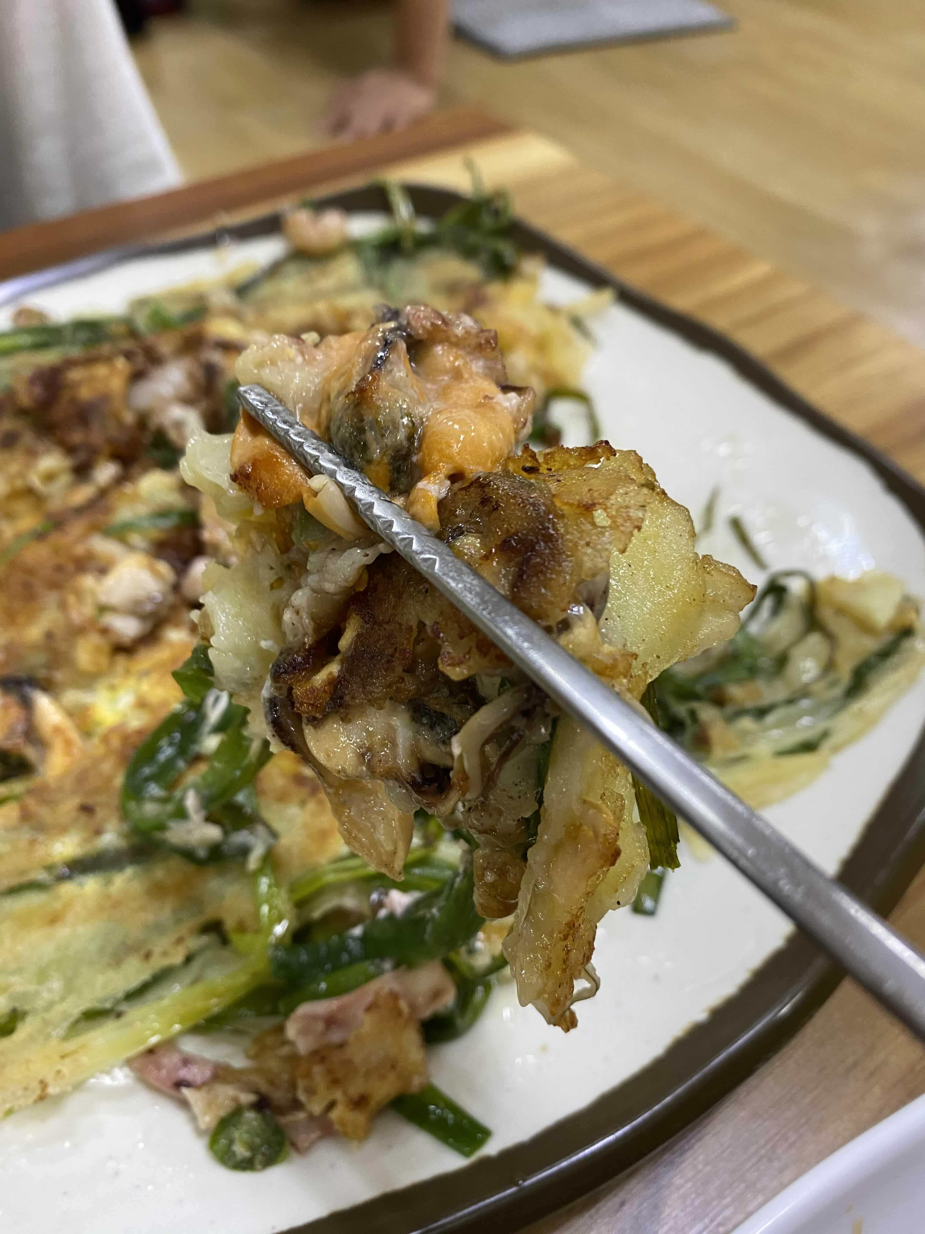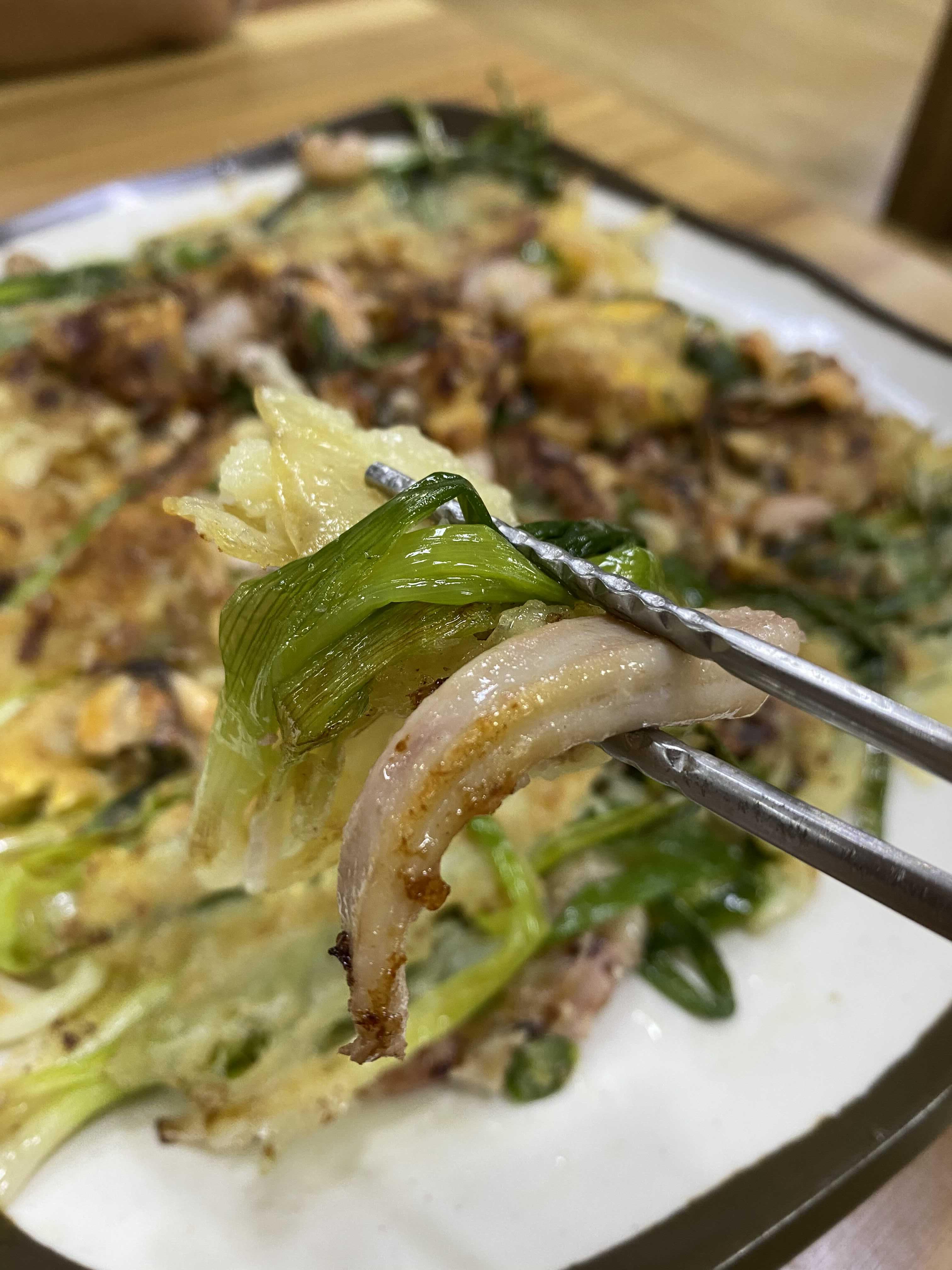 깔끔하게 다듬은 쪽파와 깐새우, 홍합, 오징어를 올리고 파전을 부쳐주는 동래시장 통큰집.