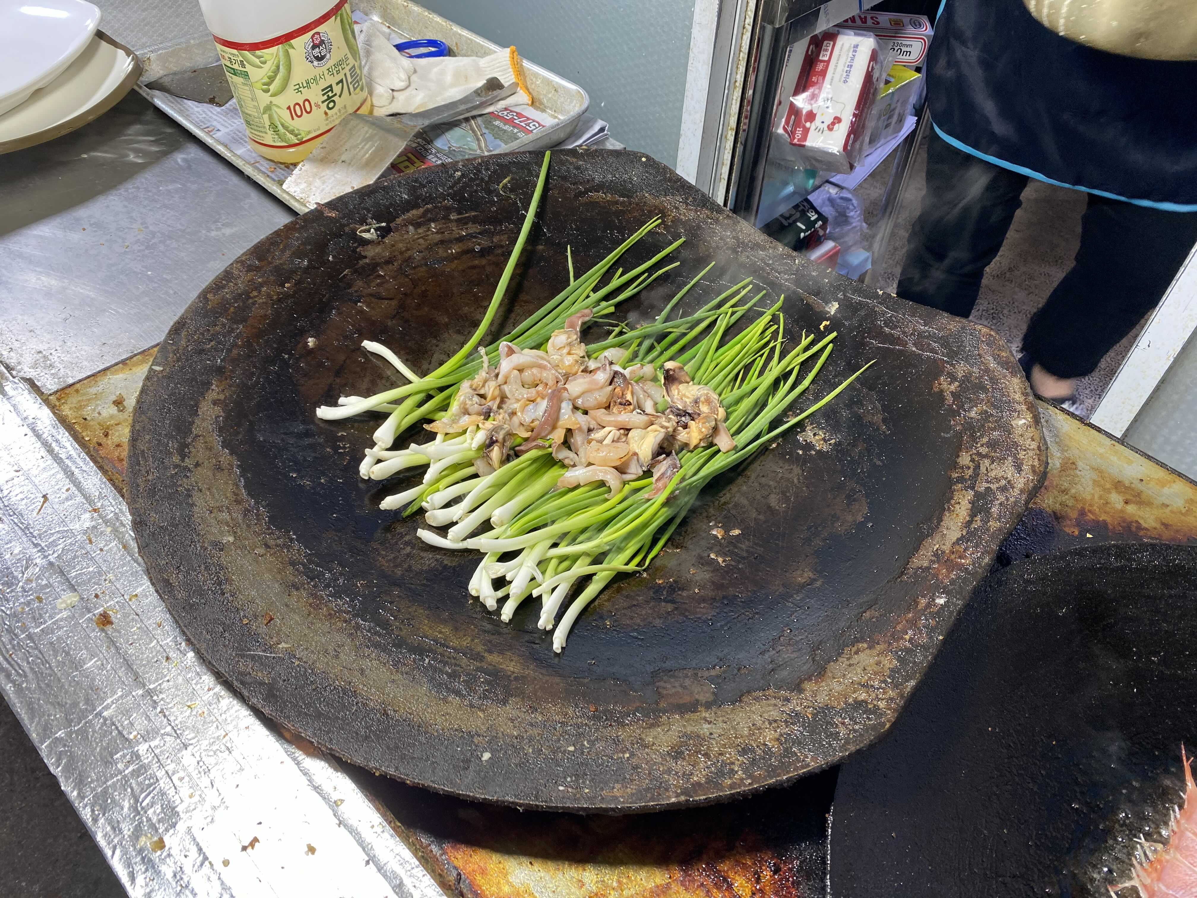 무쇠불판에 올리고 파전을 부쳐주는데...