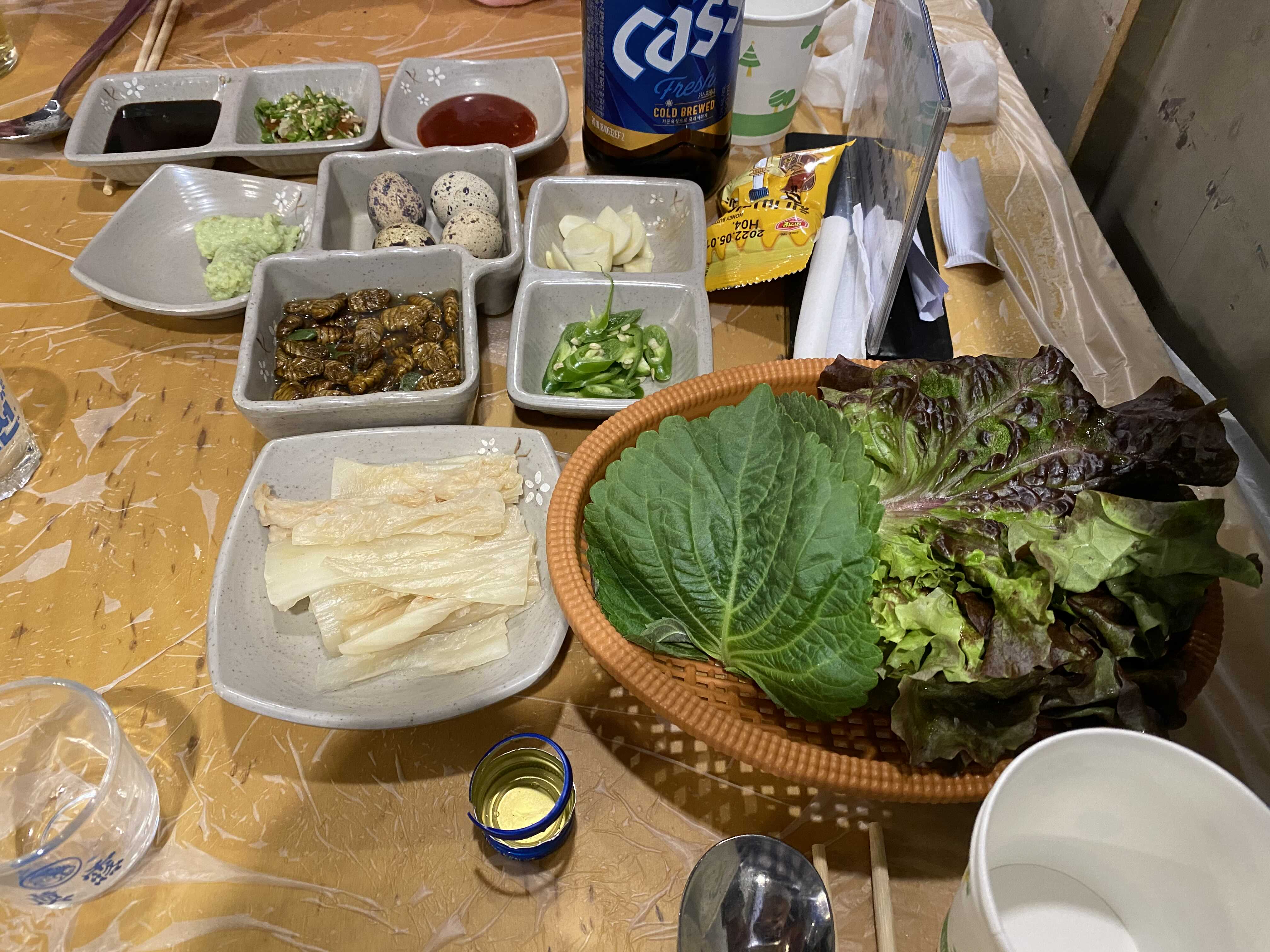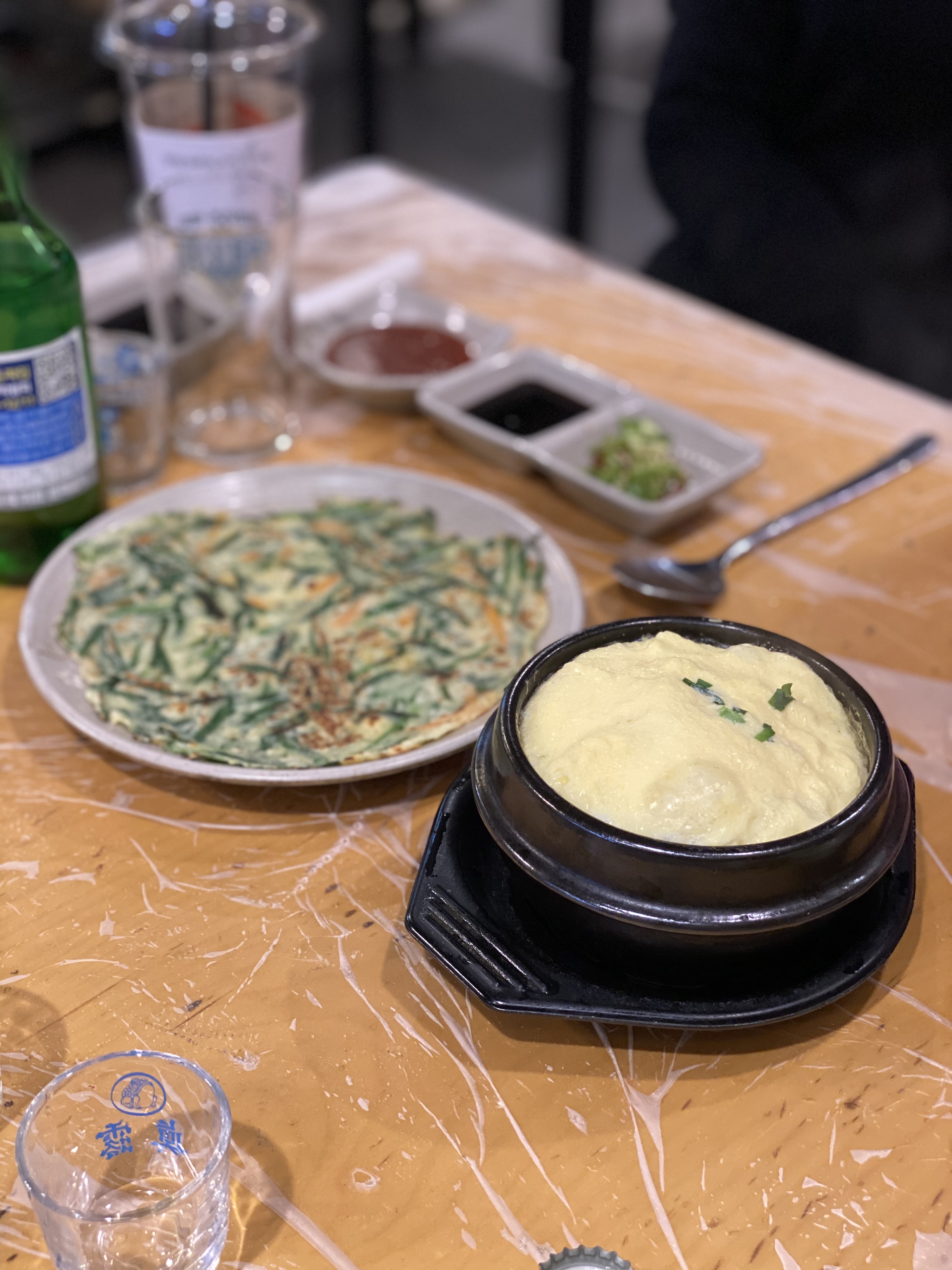 살짝 부풀어 오른 계란찜과 부추전. 단출한 곁들임으로 테이블이 채워진다.