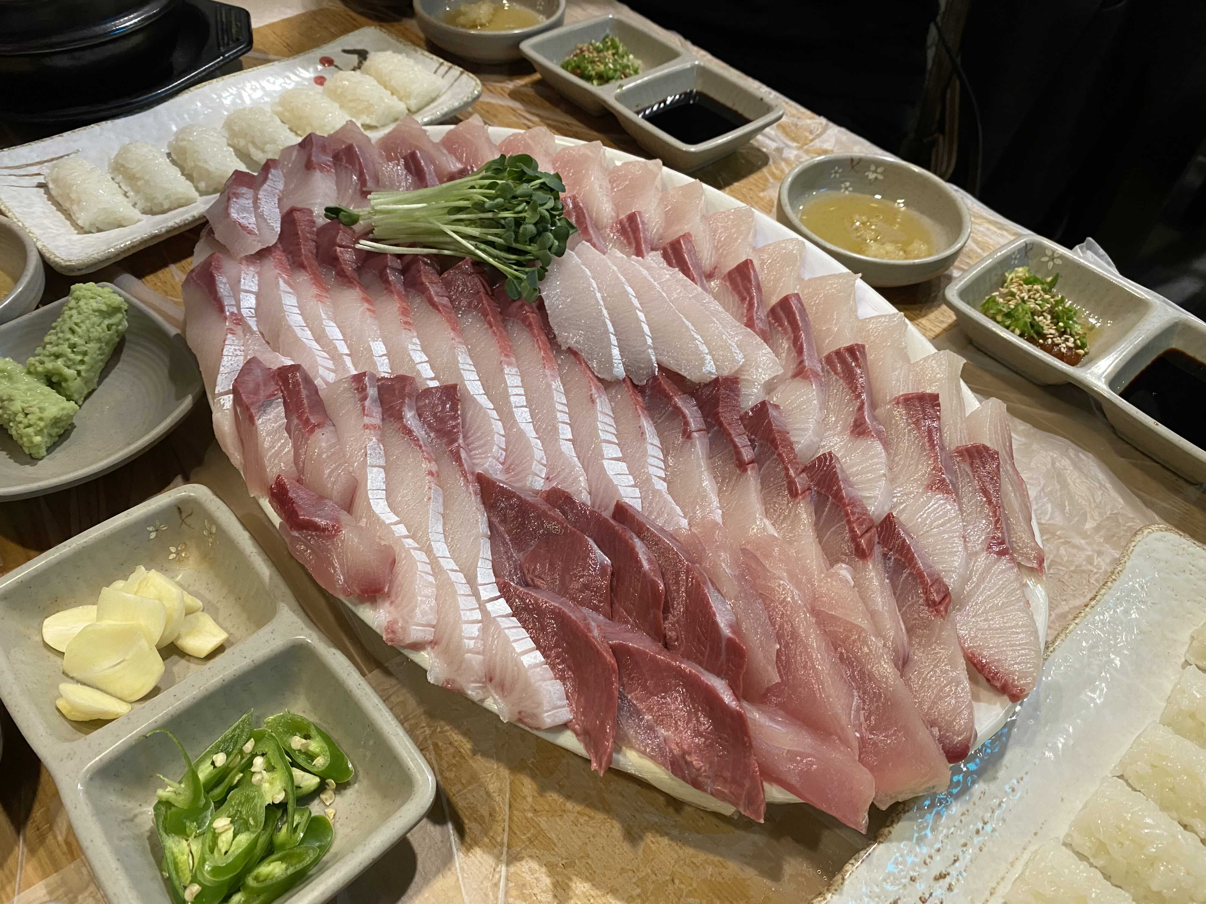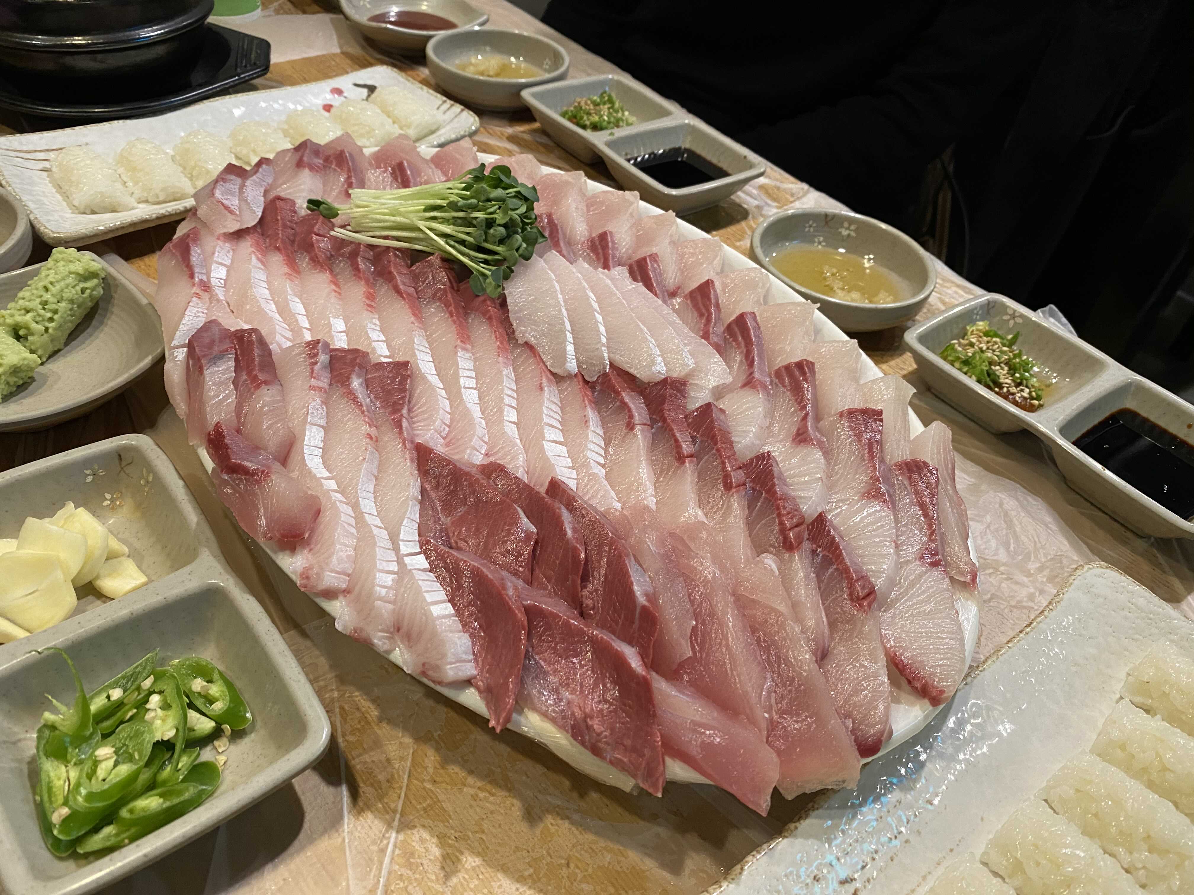 커다란 접시에 빼곡하게 담긴 대방어회.